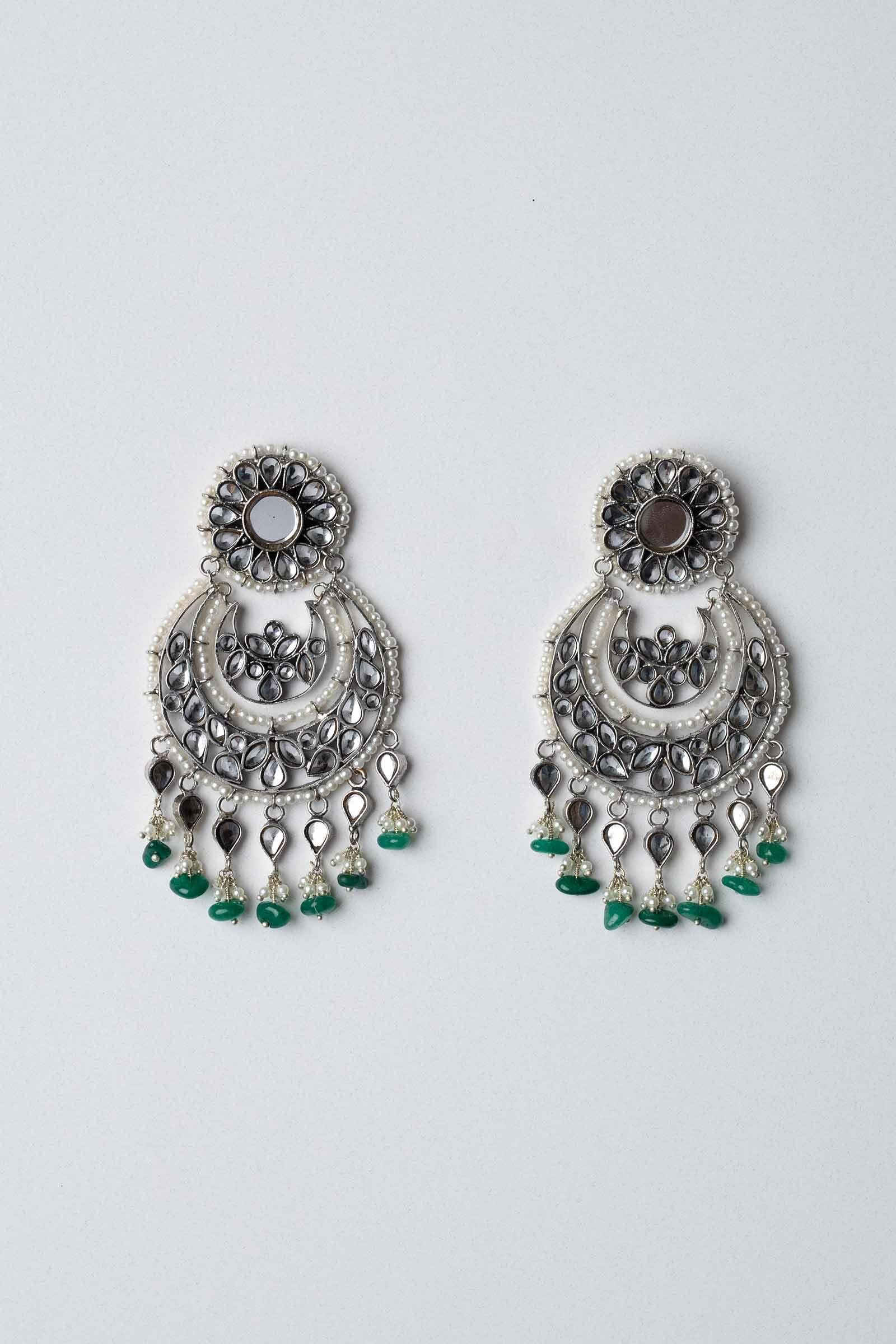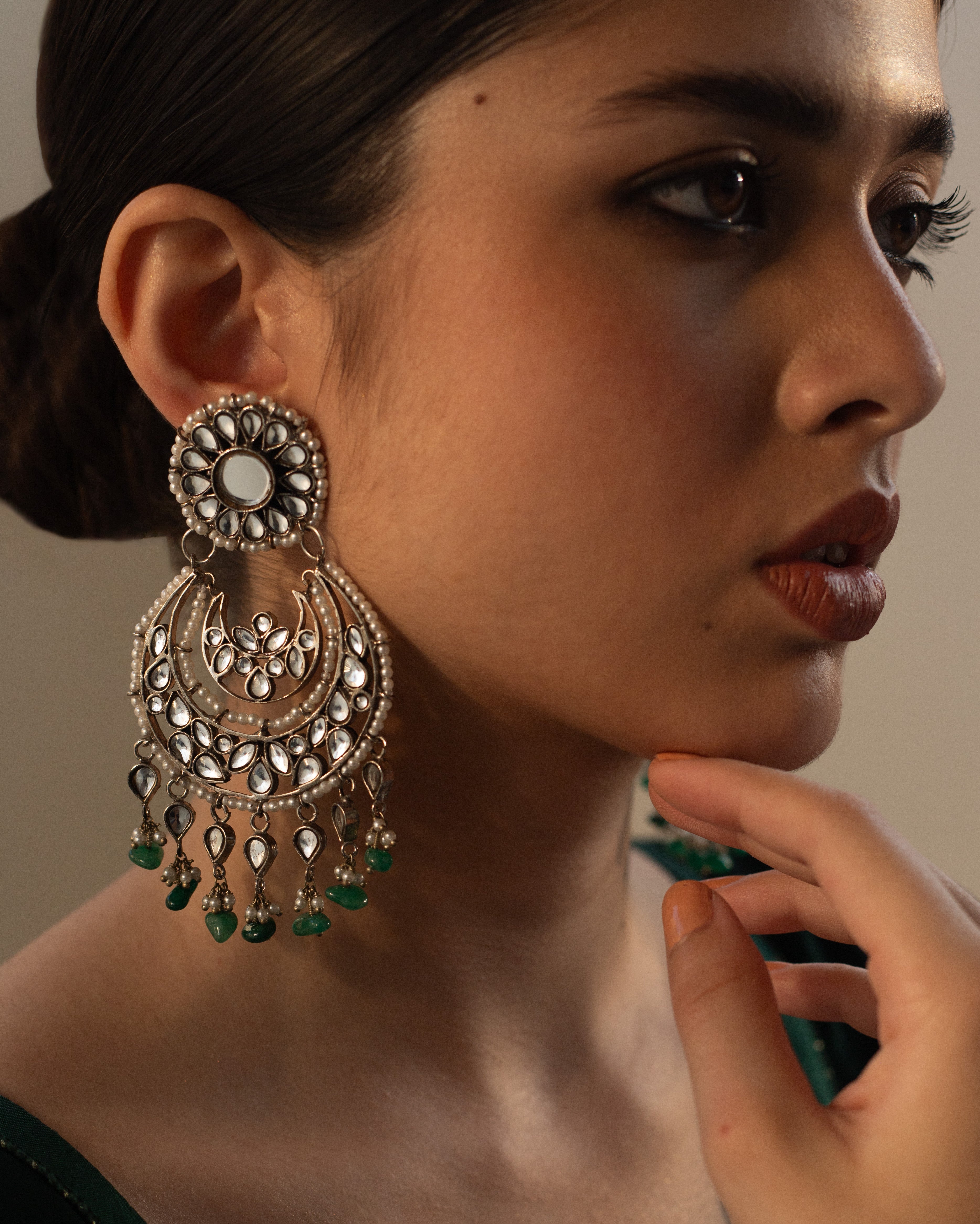 These traditional earrings are handcrafted and silver plated in a beautiful compostion of kundan, real pearls and green stone droplets.