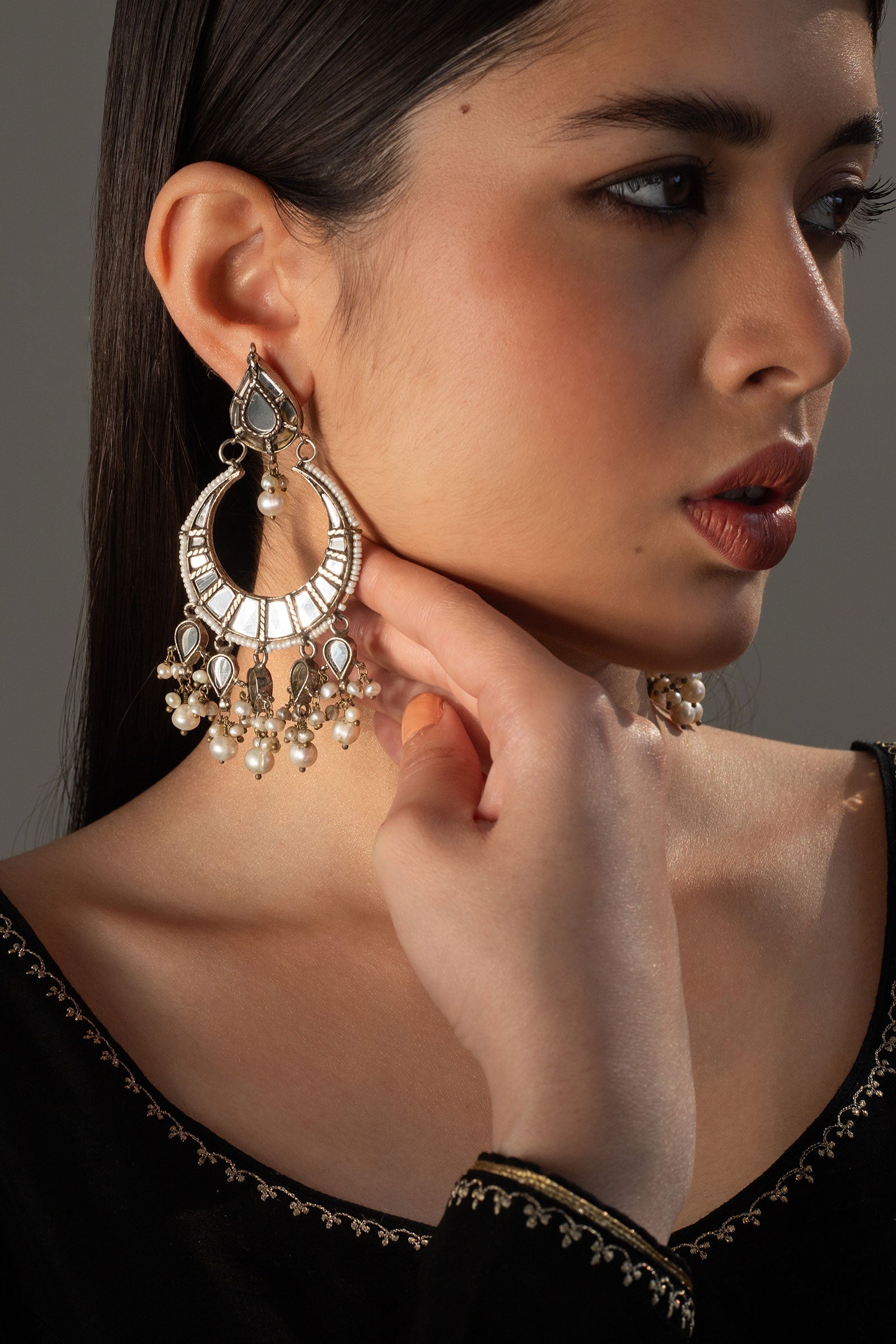 These ethnic silver plated earrings are handcrafted in kundan and showcase a regal composition of droplet mirror work and intricate clusters of natural pearls.