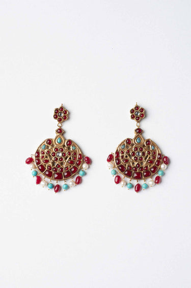 These traditional 22K gold plated earrings are beautifully crafted with chetam stones set in kundan, further enhanced by semi precious turquoise and real ivory pearls. Mechanism: Push back