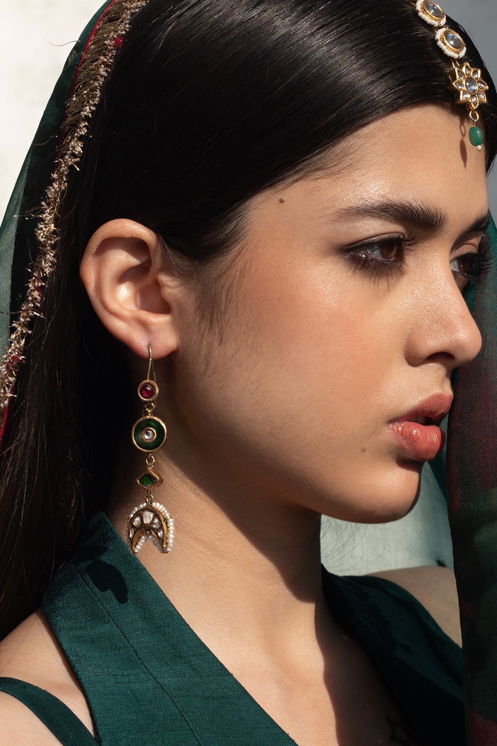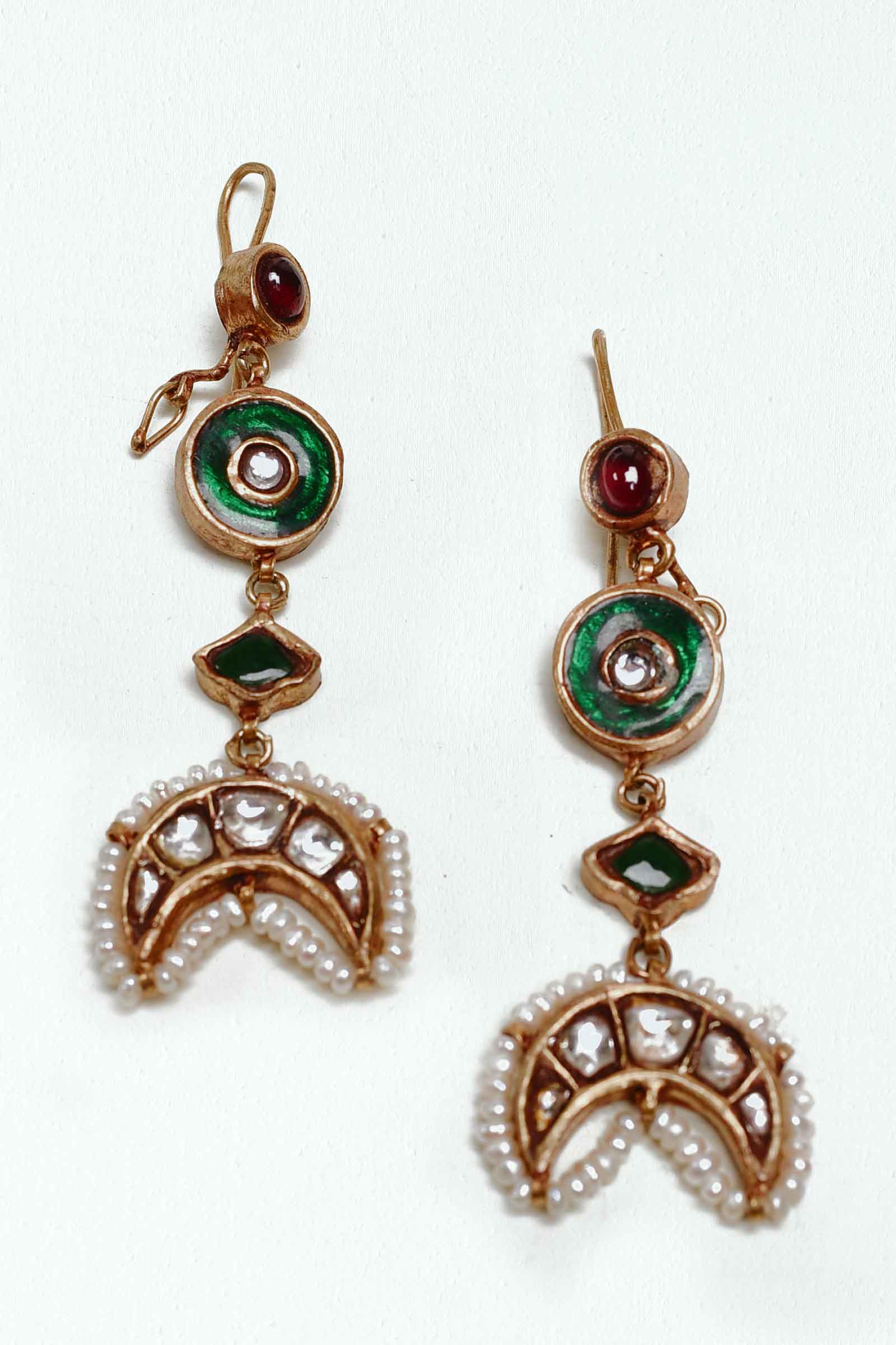This pair of Earrings is 22k gold plated, set in hand-picked Stone like, Zircon, Agate and cold green Enamel . Strung together with natural pearls. Perfect for all your celebrations. All our jewelry is handcrafted and therefore slight variations may occur.