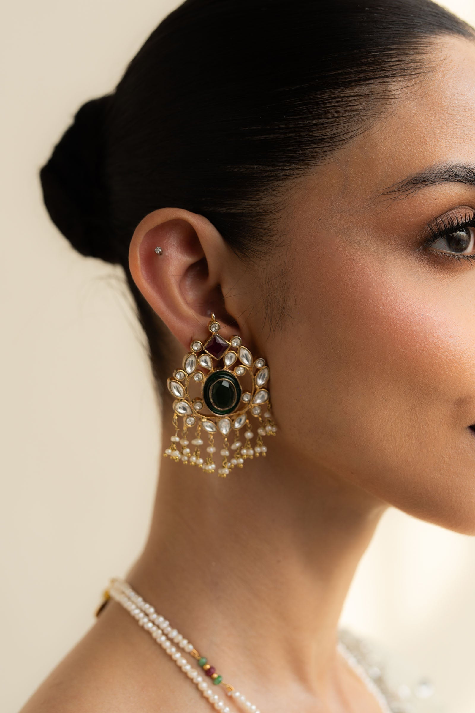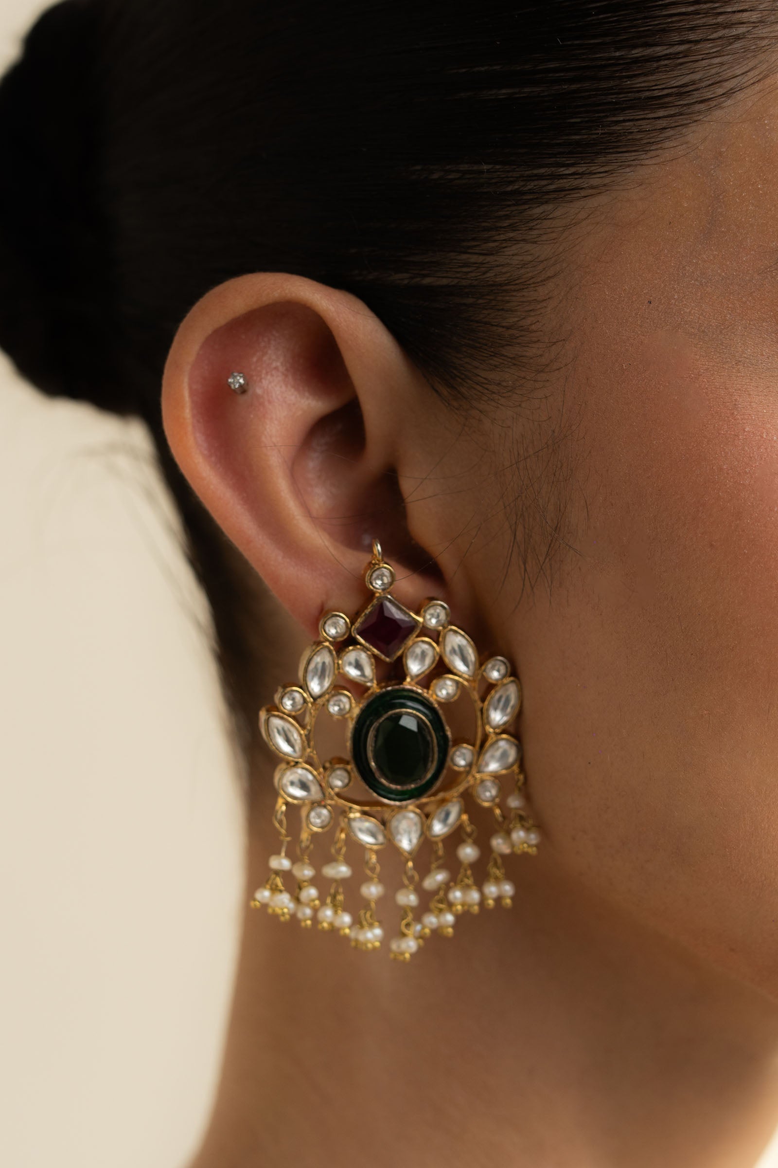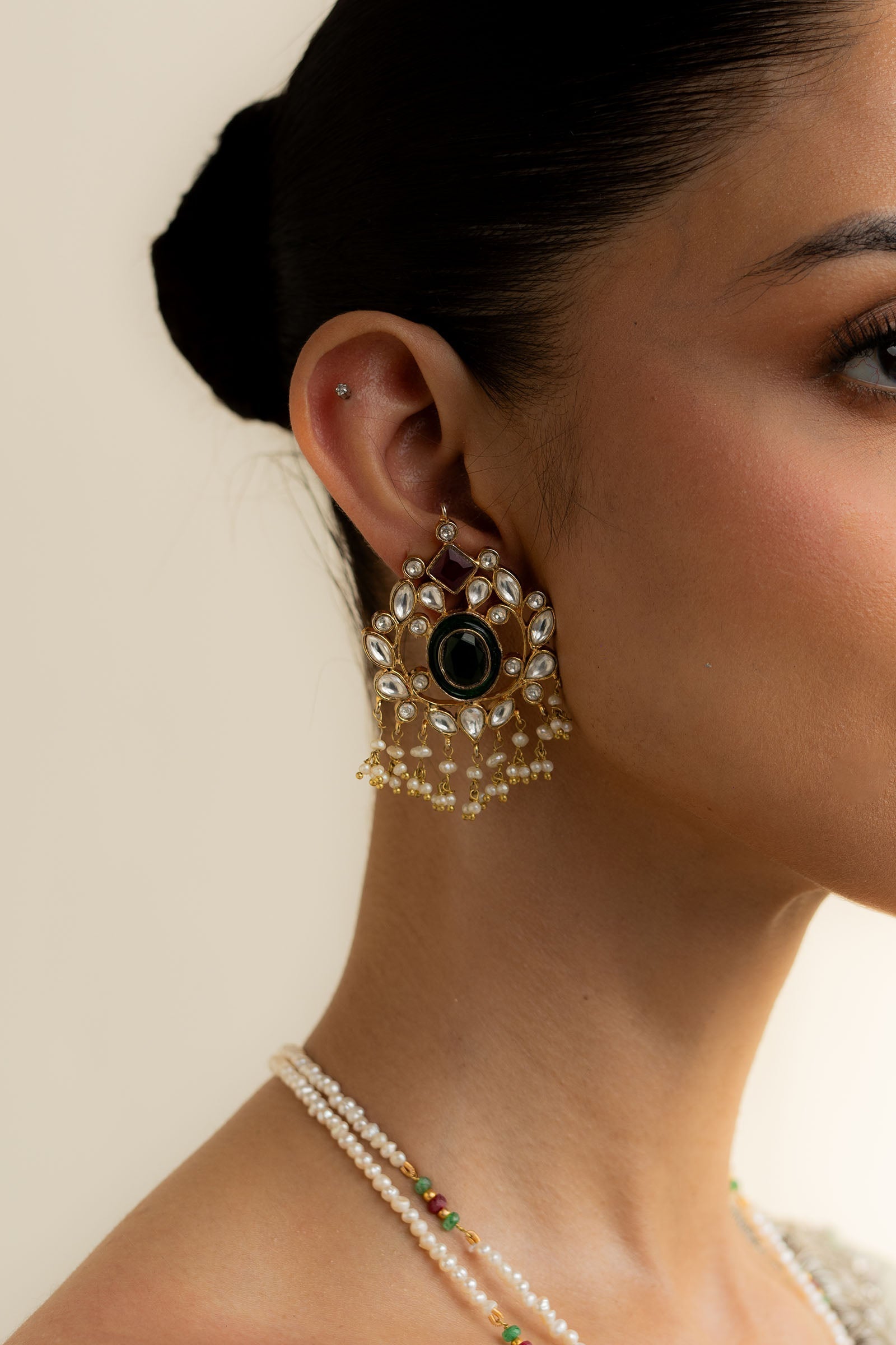 These earrings feature a stunning combination of red chetam stones, real pearls, and intricate kundan zircon, accented with traditional meena detailing.A perfect blend of bold color and timeless elegance, designed to make a statement.