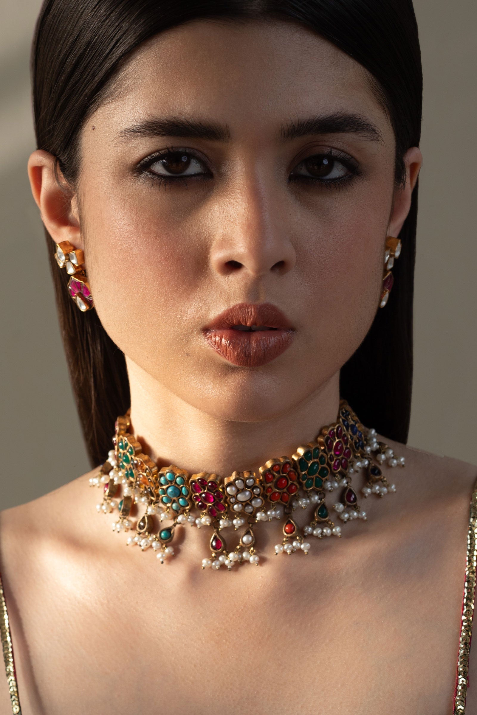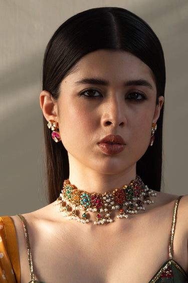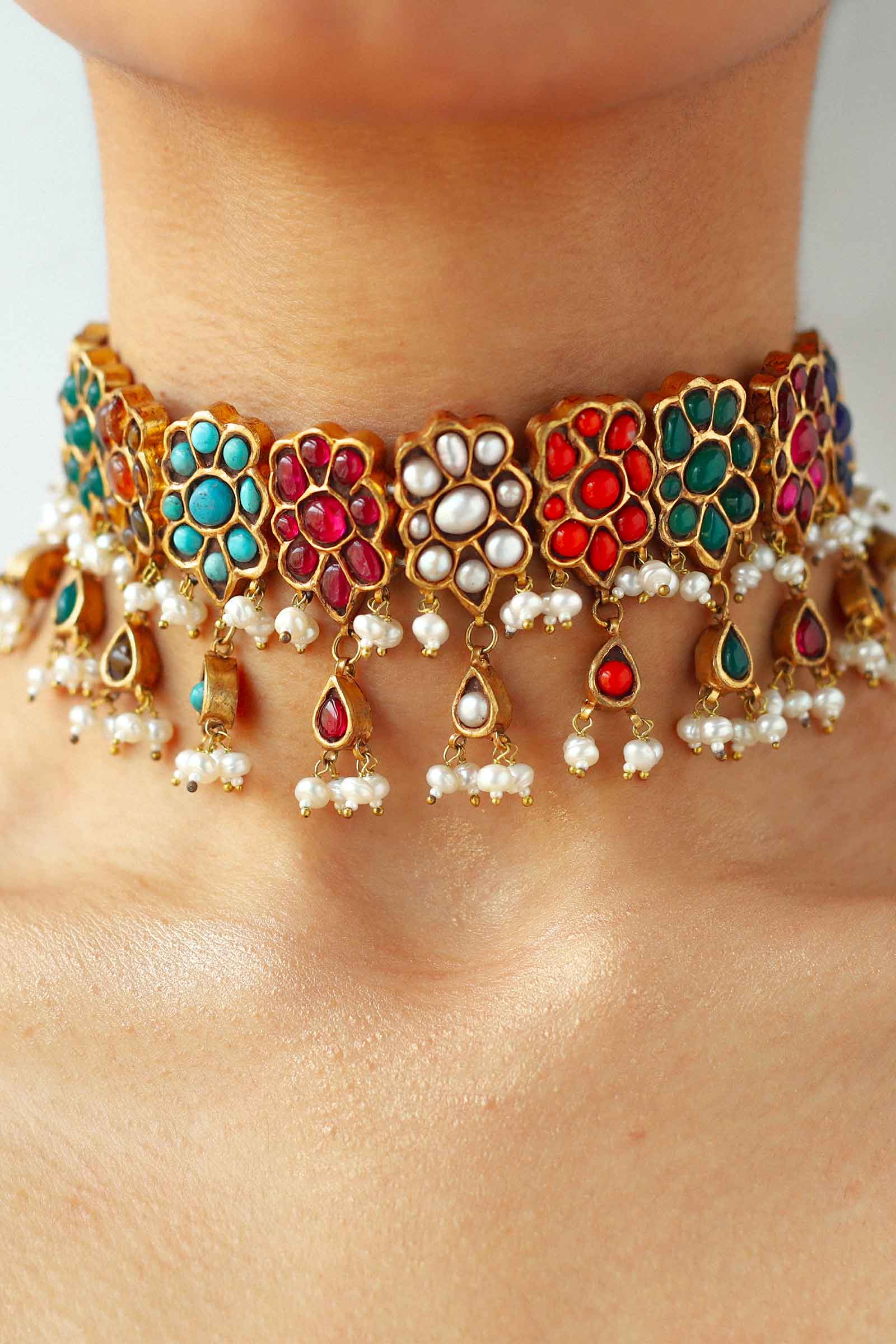 This Necklace is 22k gold plated, set in hand-picked Stone like, Chetam, Sapphire, Nature pearls, Green Agate, Marjan and turquoise. Strung together with natural pearls. Perfect for all your celebrations. Mechanism: Adjustable Dori All our jewelry is handcrafted and therefore slight variations may occur.