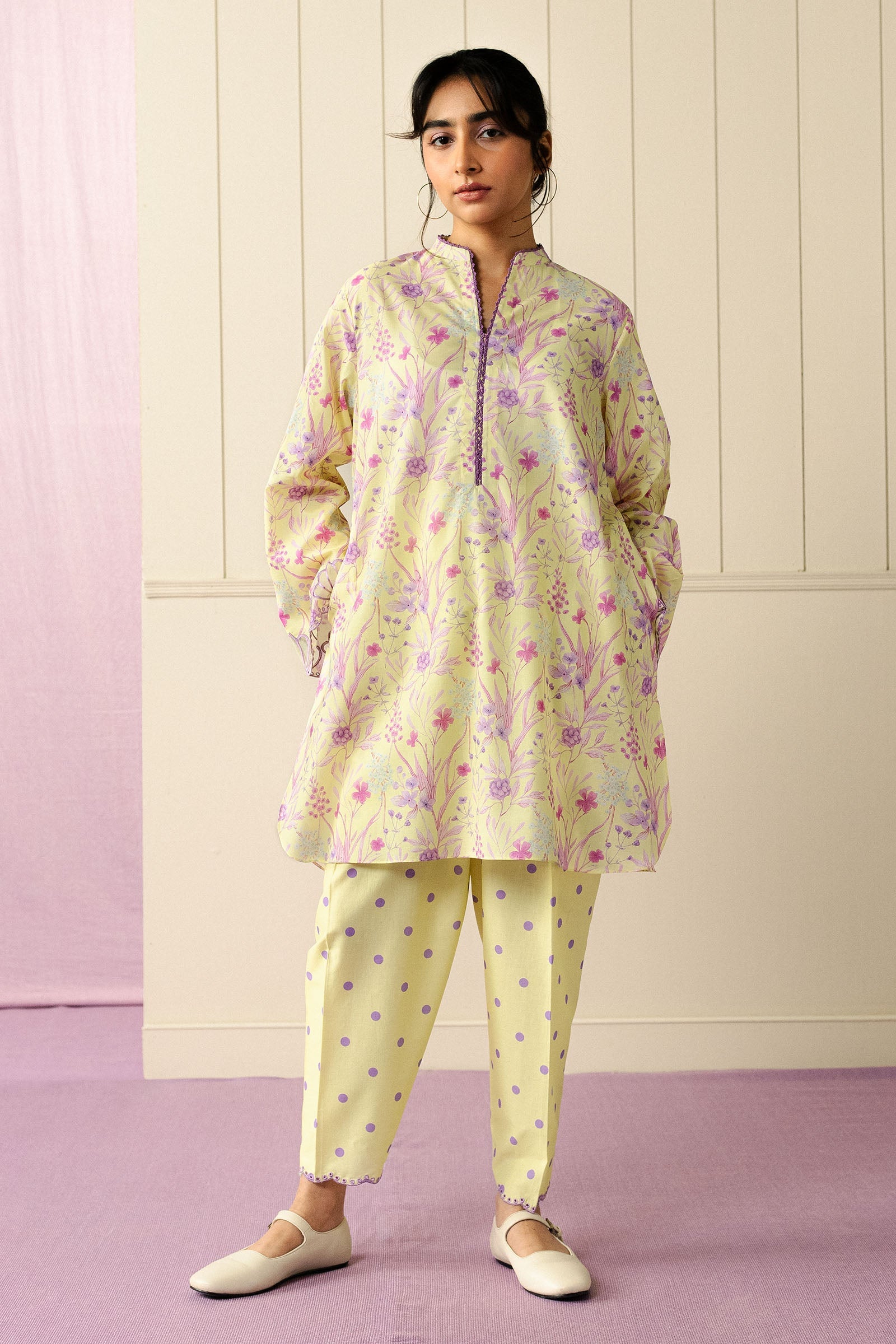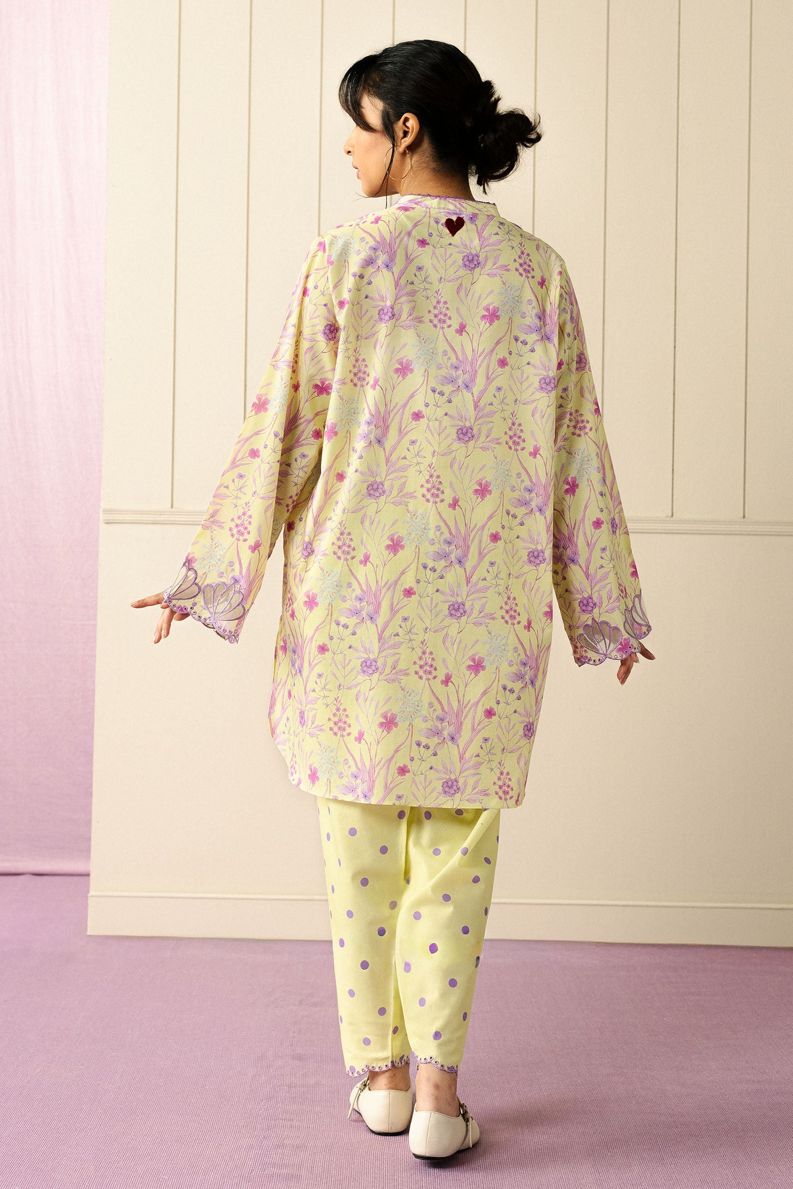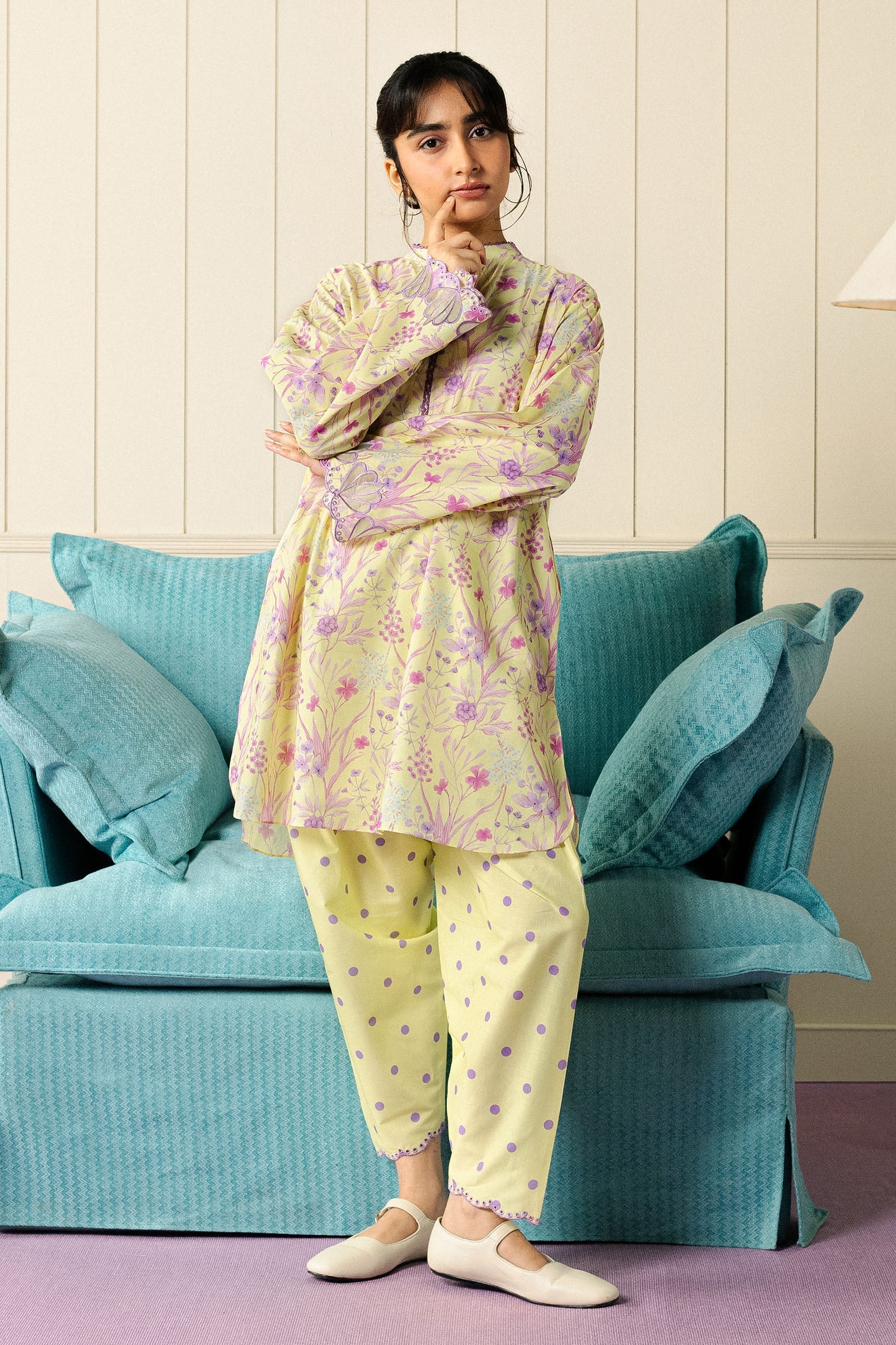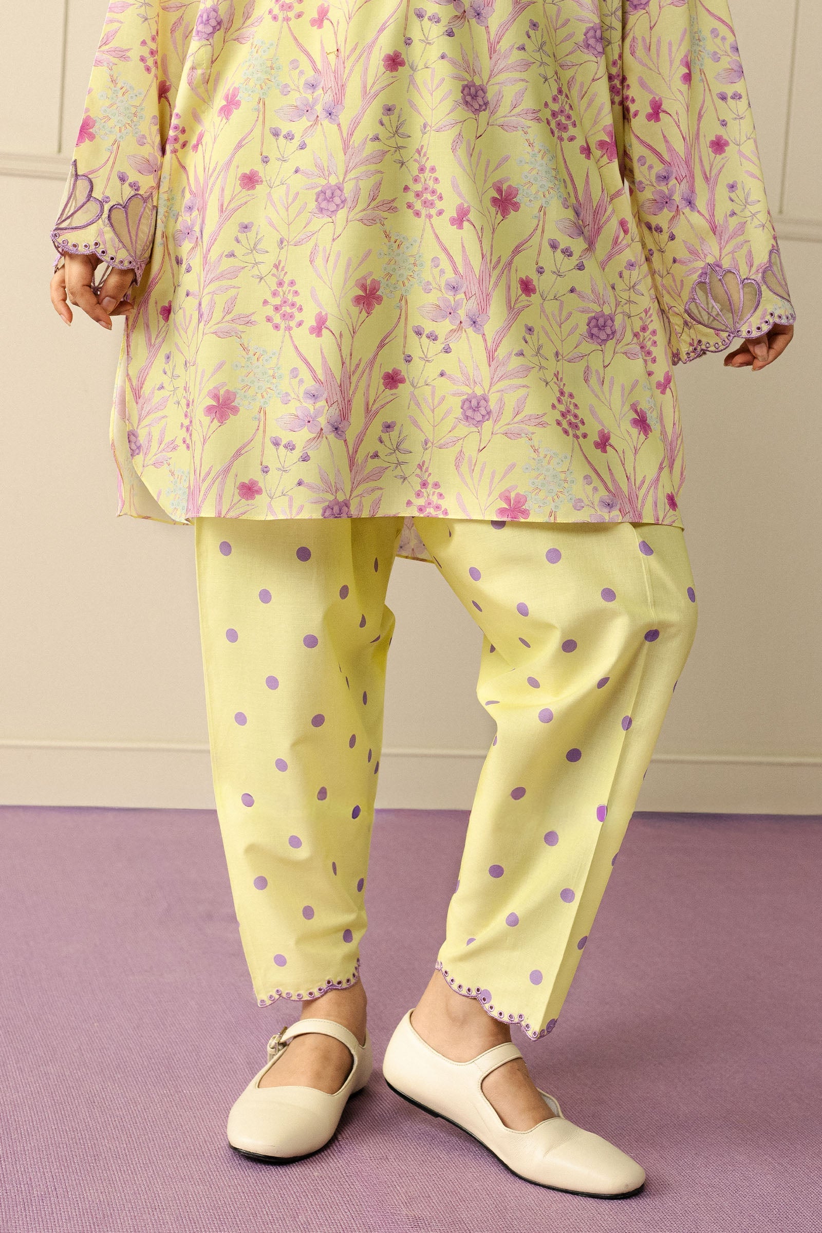 A loose-fit cambric kurta featuring contrasting embroidery and delicate organza details on the sleeves, paired with a polka-dot cropped shalwar adorned with subtle embroidery. Light, lively, and effortlessly charming, this ensemble celebrates playful elegance with every movement.