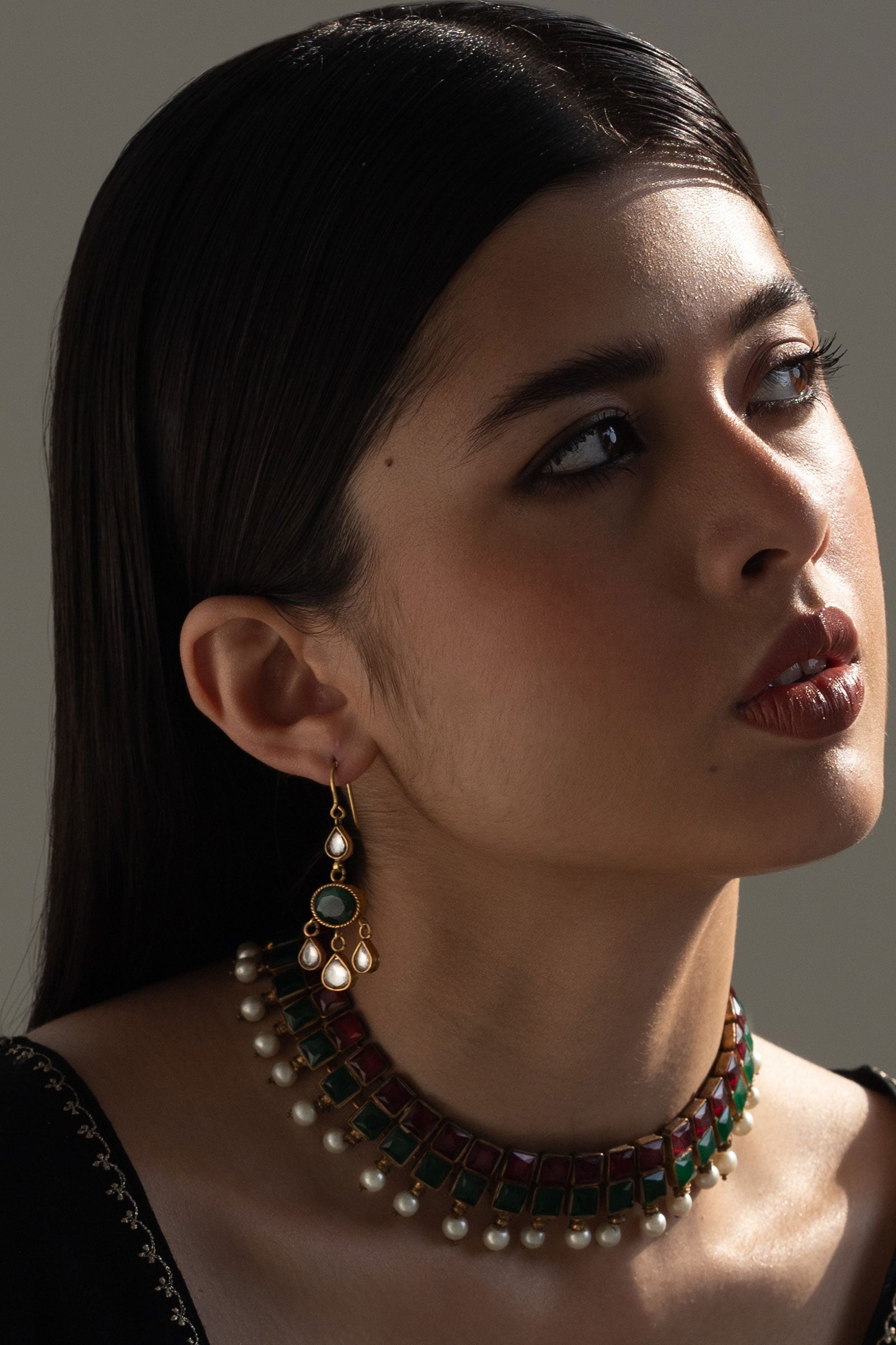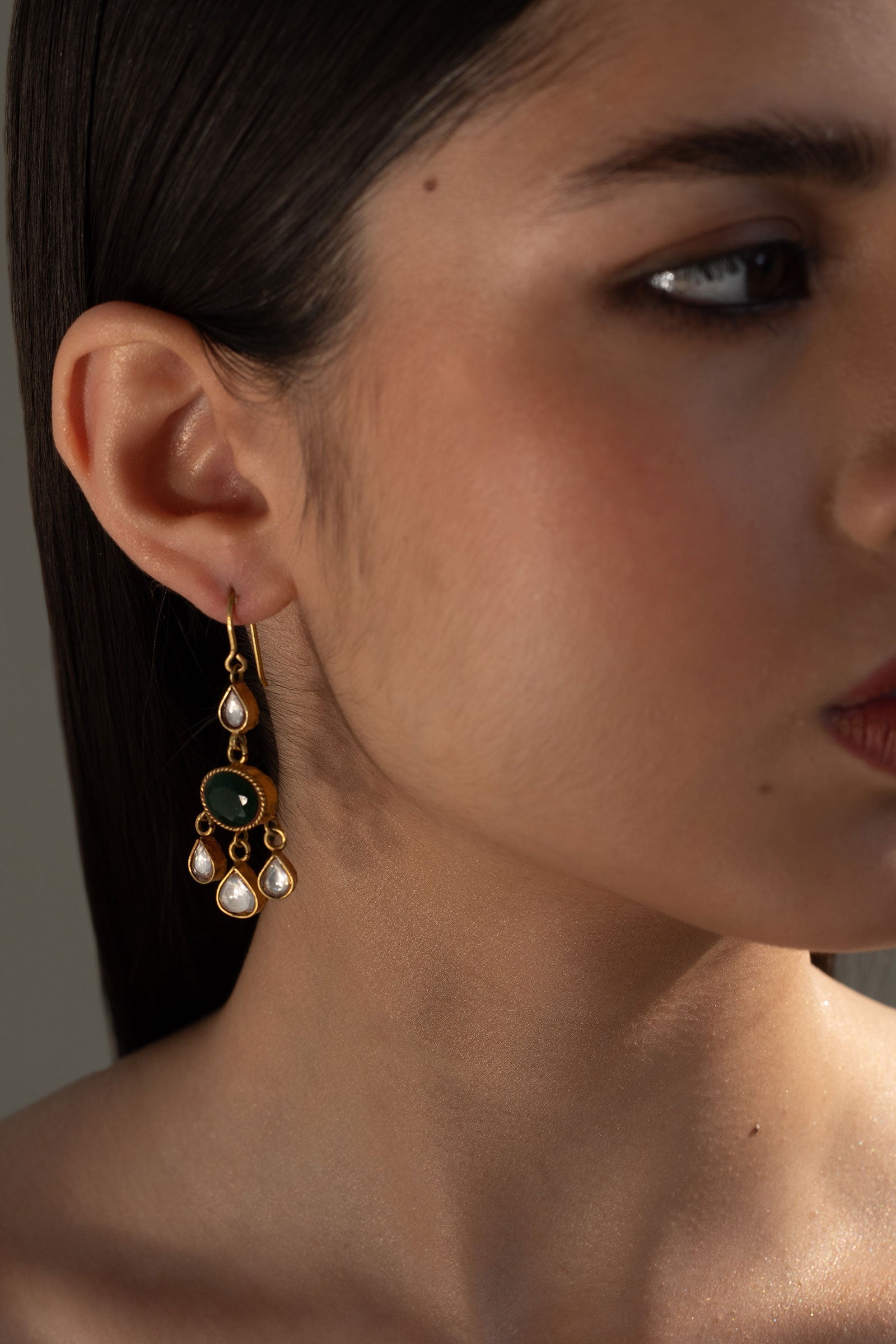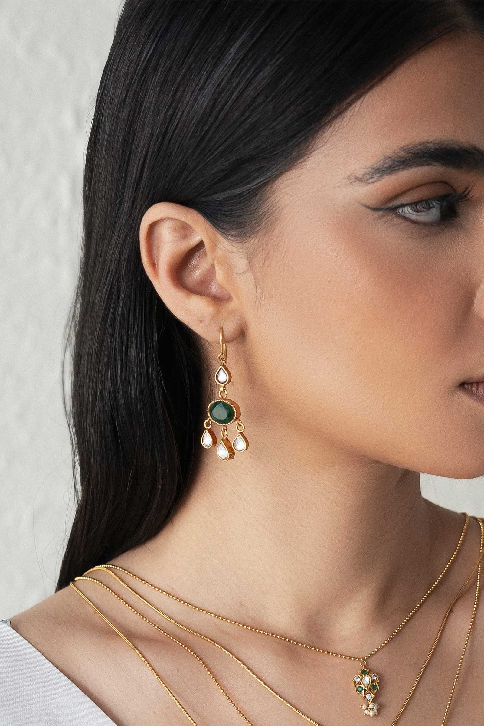 This beautiful pair of Earrings is 22k gold plated, set in hand-picked Stone like, jade and Zircon polkisetting. Strung together with beautiful pear shape polki. Perfect for all your celebrations.