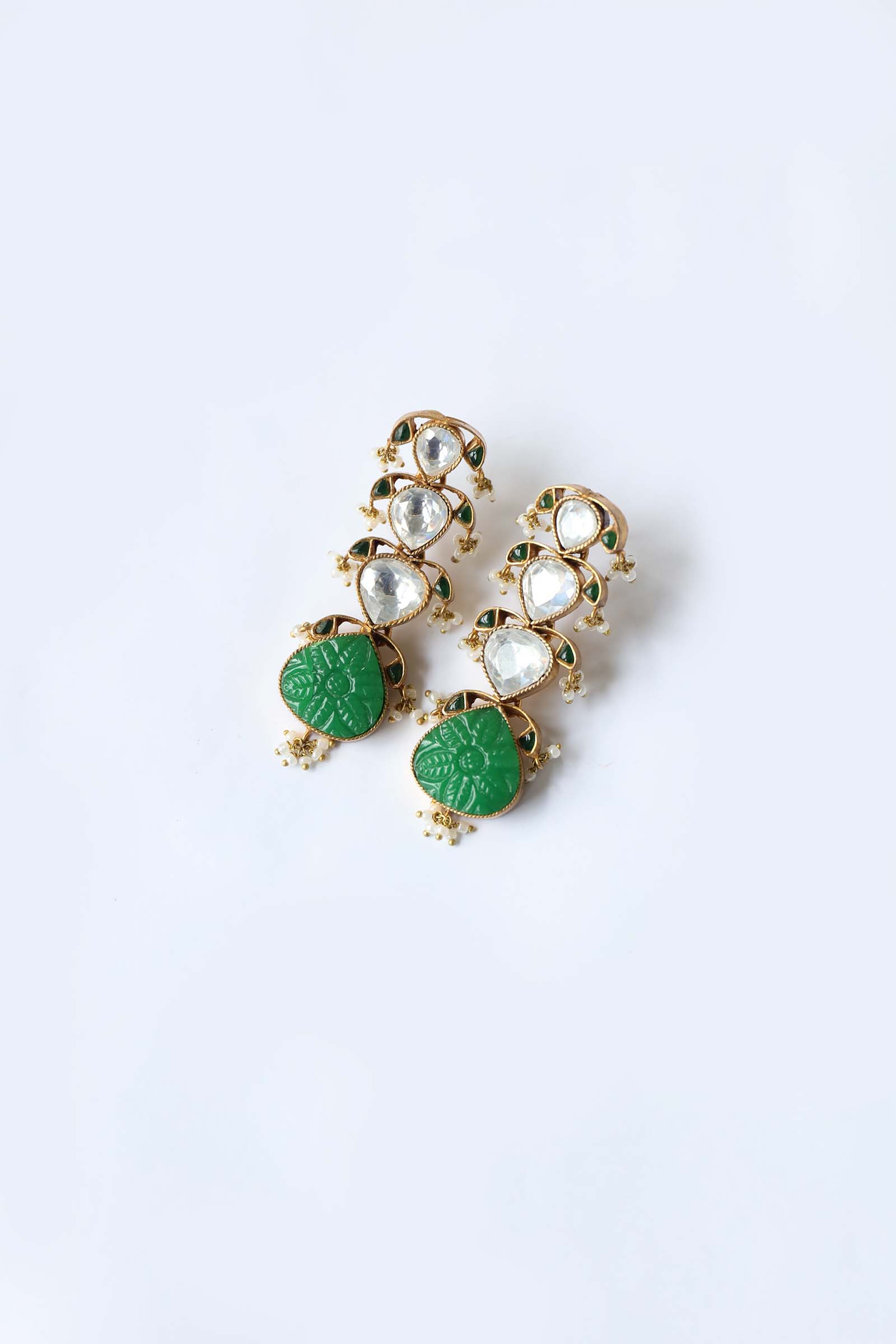 These 22k gold-plated Paan earrings are set in zircon kundan, natural pearls and engraved jade stones.