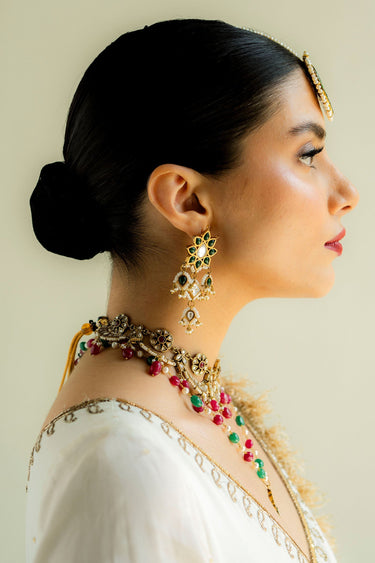 Our 22k gold plated Mysha earrings are set in zircon kundan and jade with a touch of natural pearls.