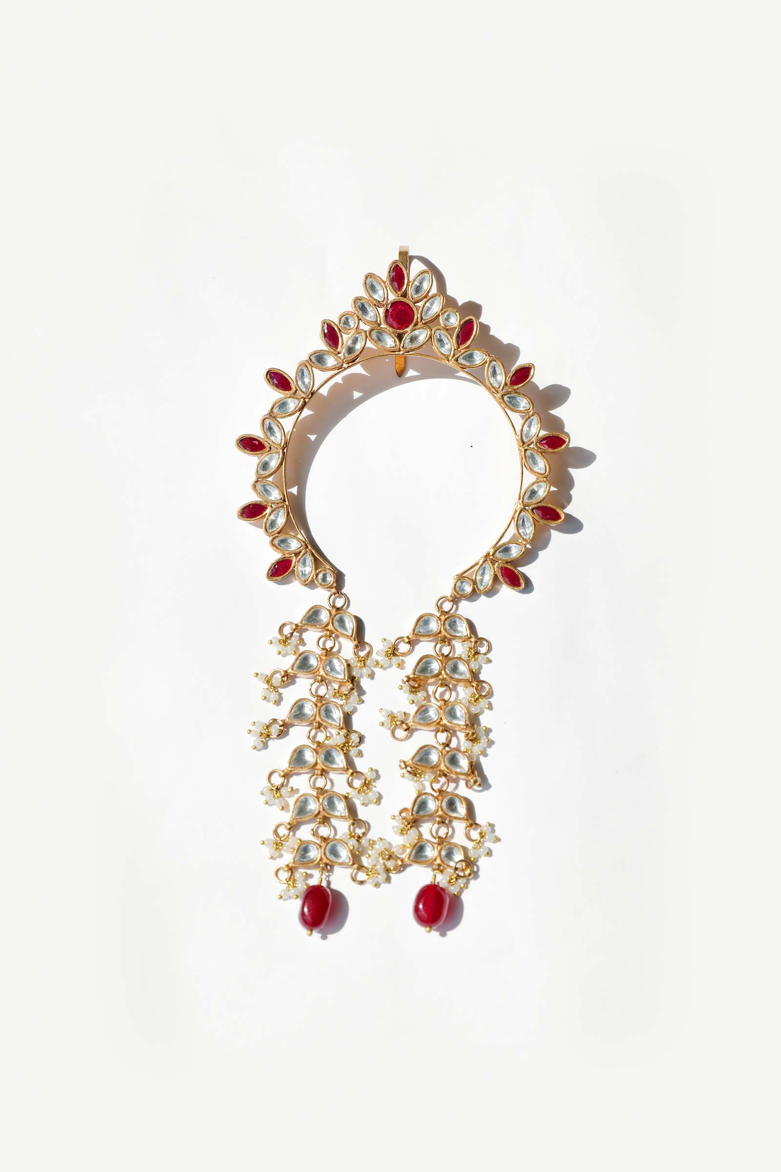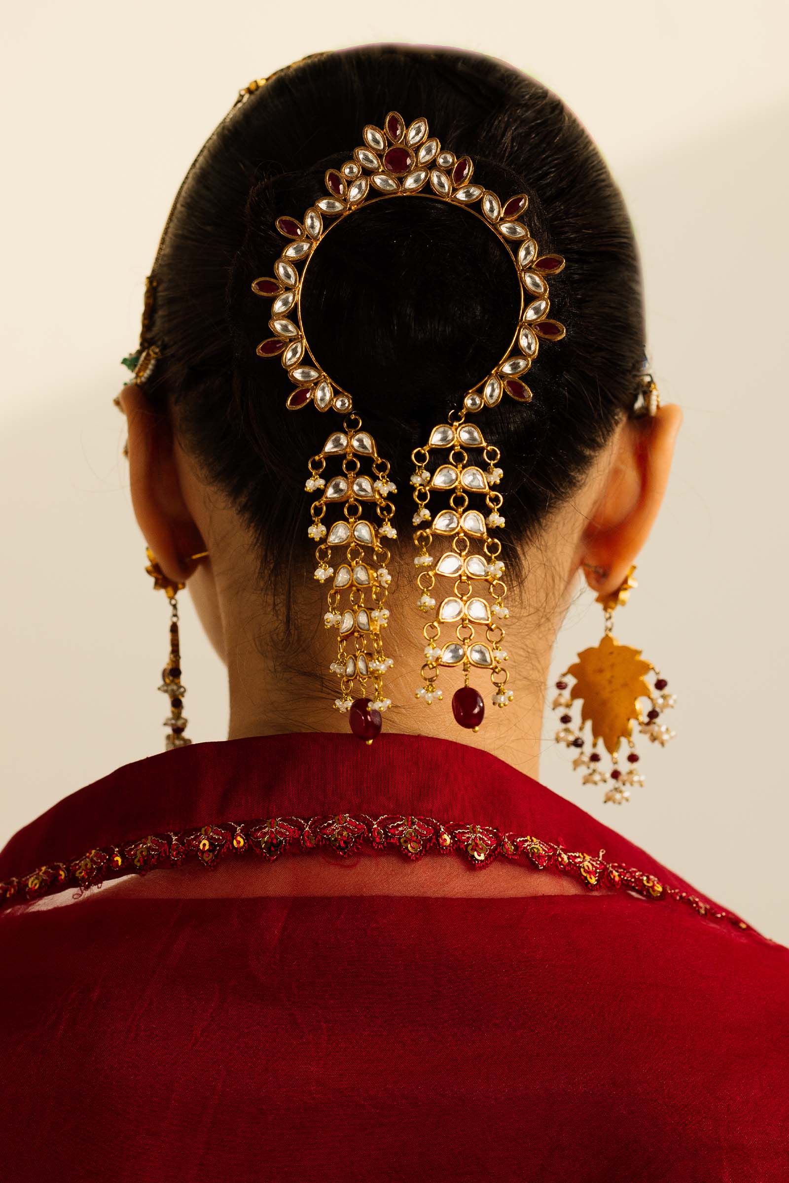 To elevate your occasion wear, our beautiful joora pin (22k gold-plated) is just the right choice. It is set in zircon kundan and red faceted jade stones with chandelier strand of kundan and pearls.