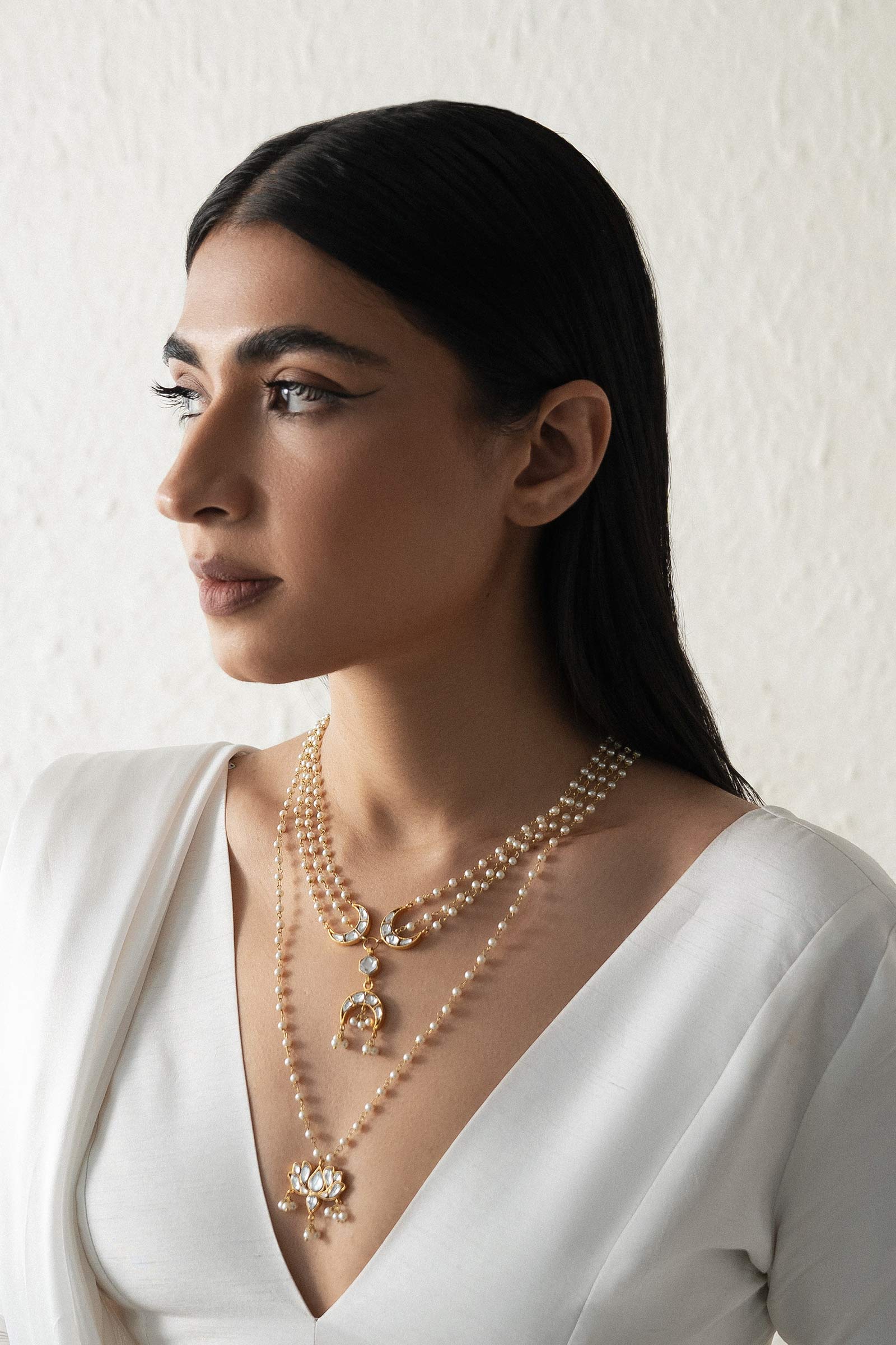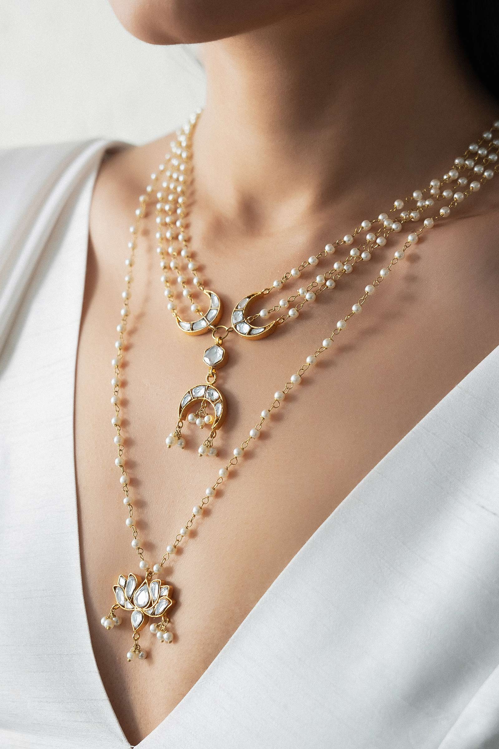 This long Mala is 22k gold plated, set in hand-picked Stone like, polki and Zircons. Strung together with beautiful pearls. Perfect for all your celebrations.