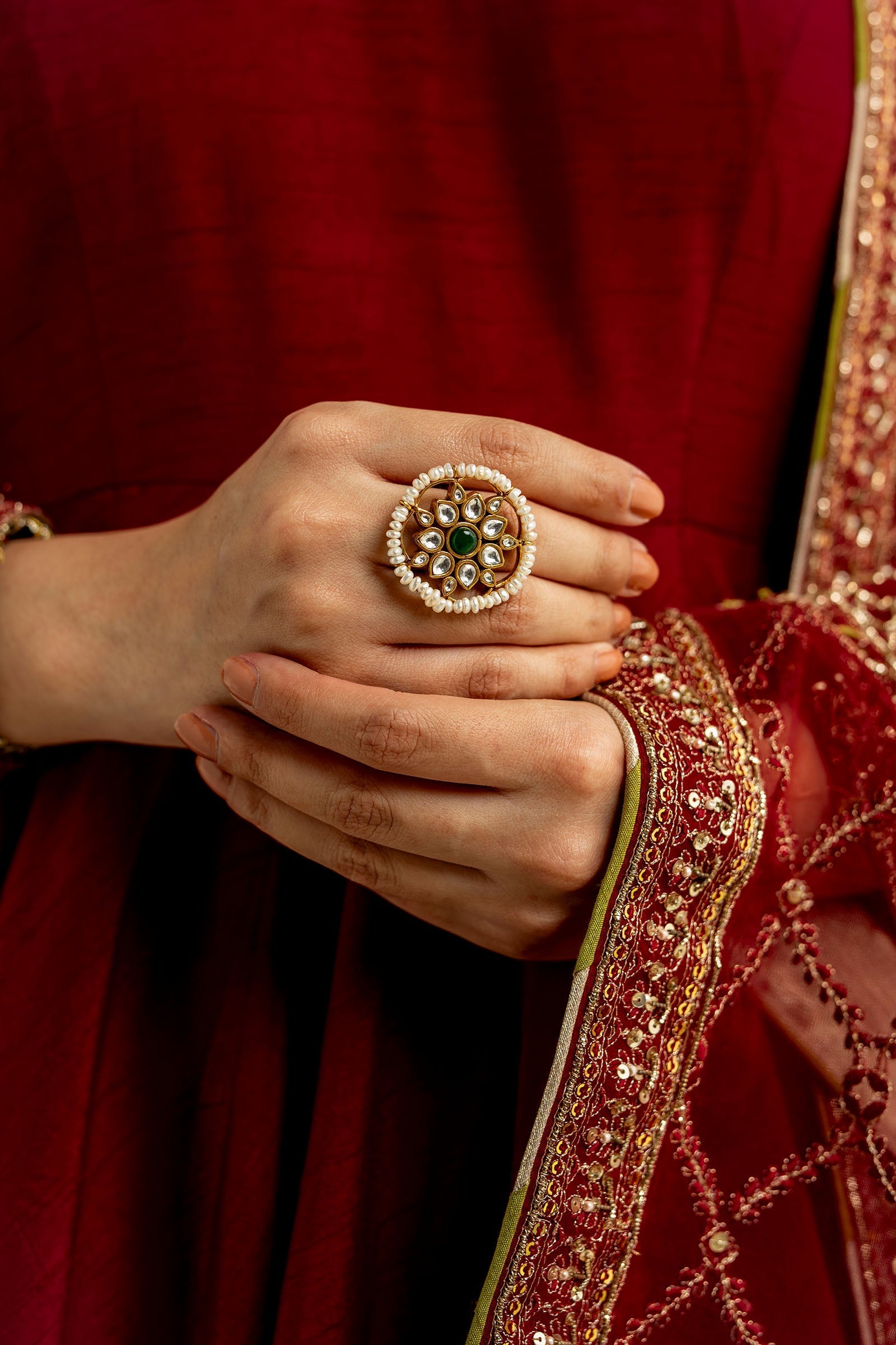 Our 22k gold plated adjustable ring is set in zircon kundan,natural pearls and a green jade center.