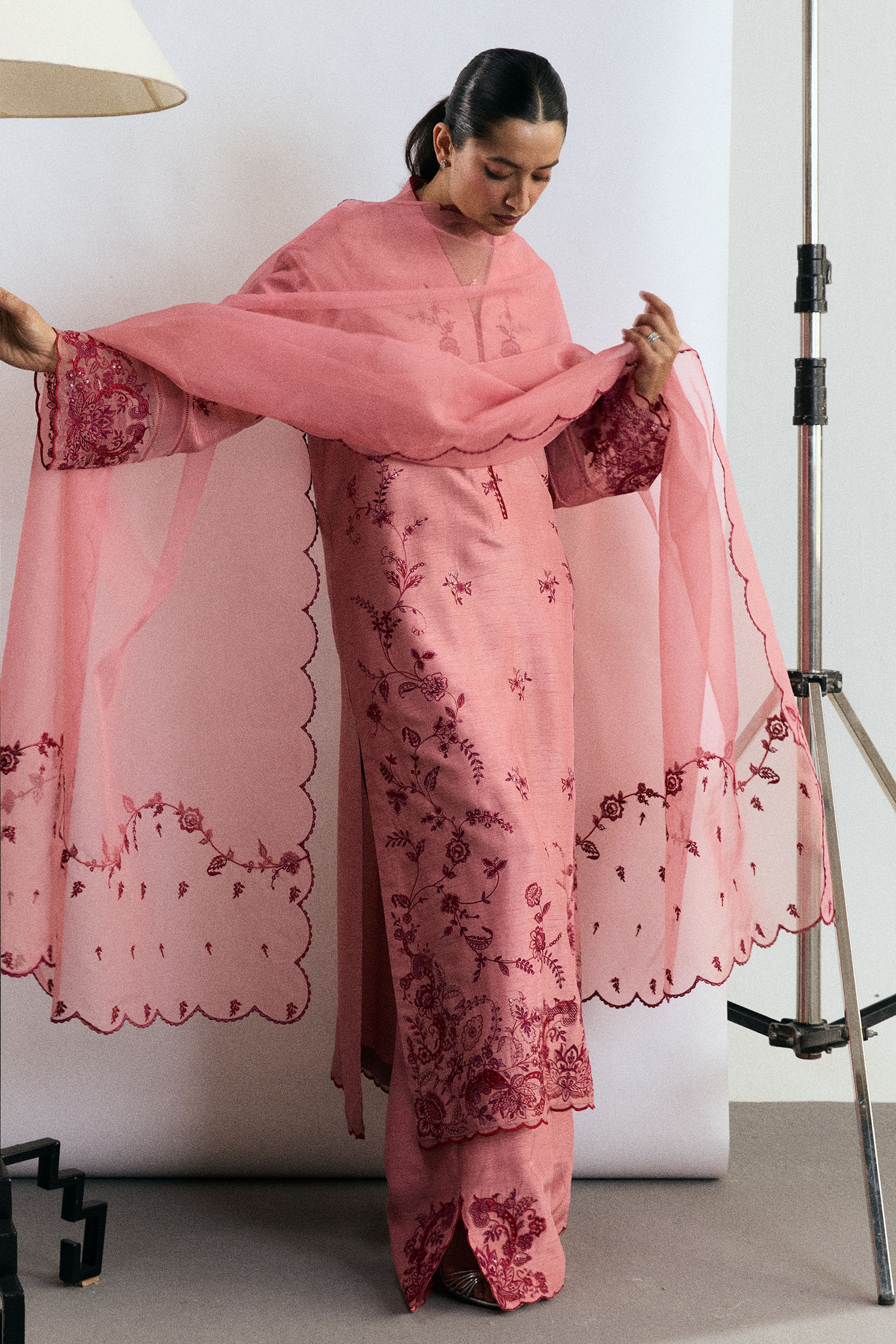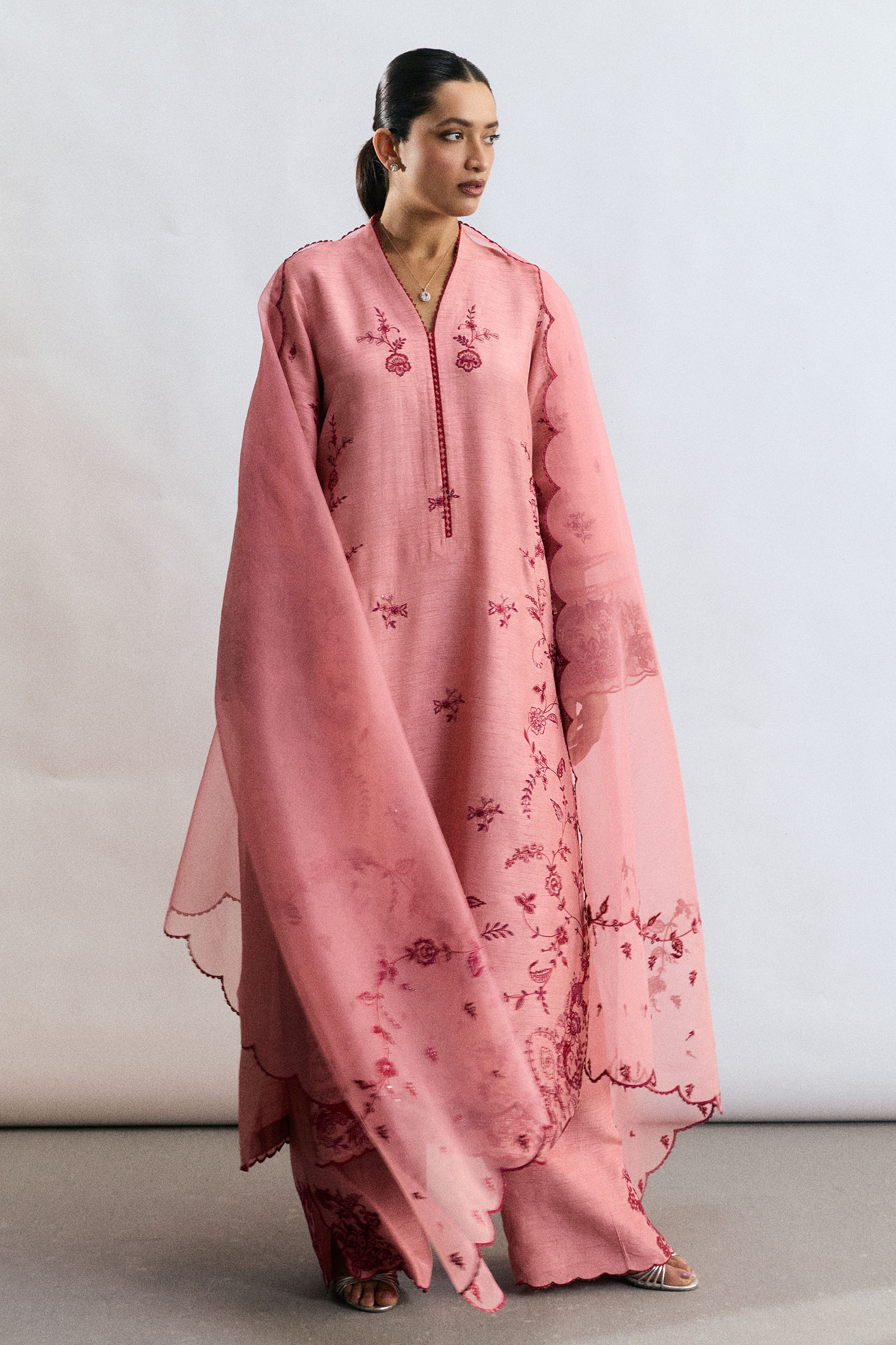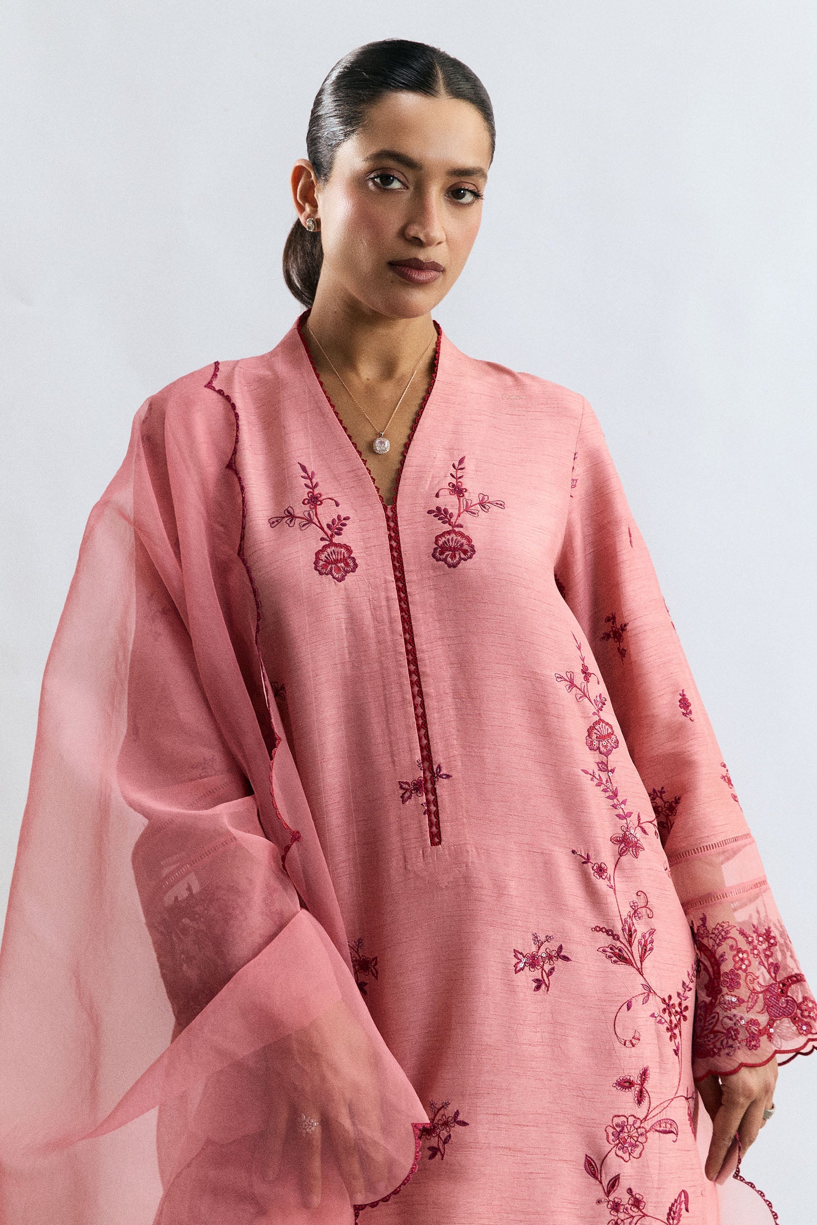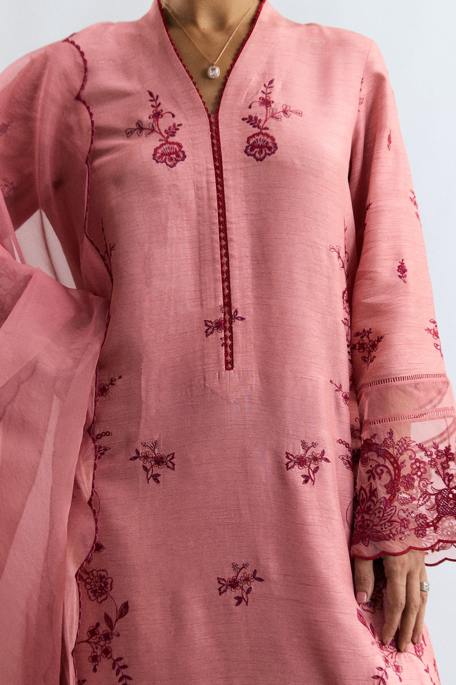 A tea pink raw silk ensemble adorned with bold crimson embroidery, accented with classic design elements for a refined festive appeal. The shirt features striking contrast embroidery with delicate organza trims, paired with a straight-fit embroidered trouser. A sheer embroidered organza dupatta completes the look, radiating understated elegance suited for any occasion.