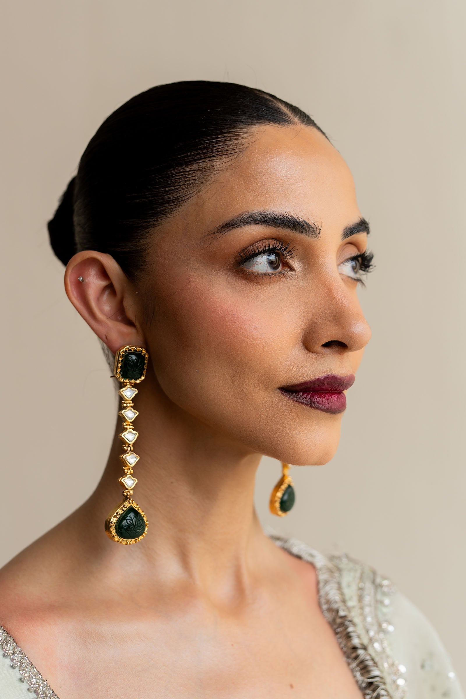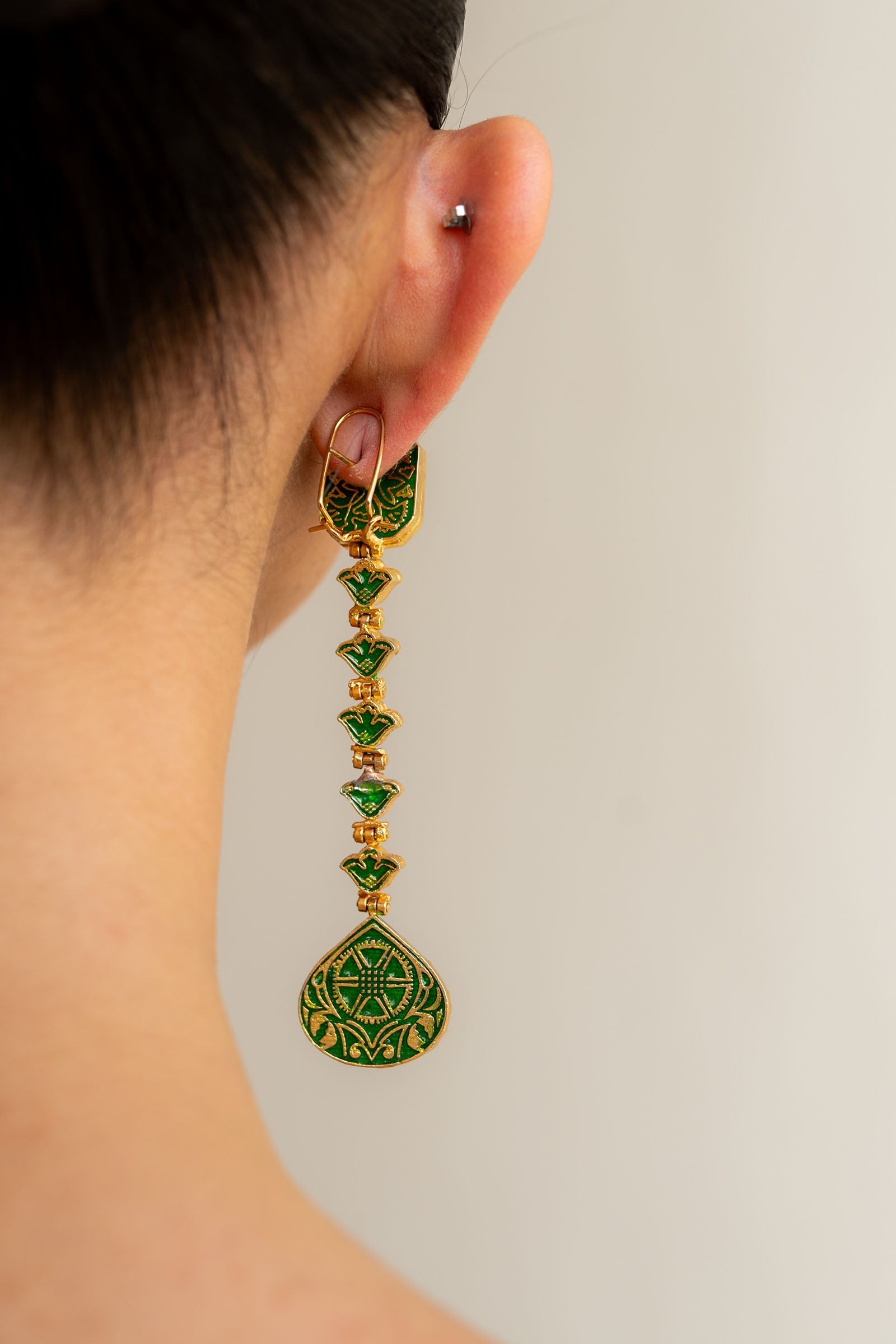 These 22K gold-plated earrings feature a striking combination of square and drop-shaped carved jade stones, set with zircon kundan.The intricately designed back, adorned with patterns and green meena, creates a perfect blend of modern artistry and traditional elegance.