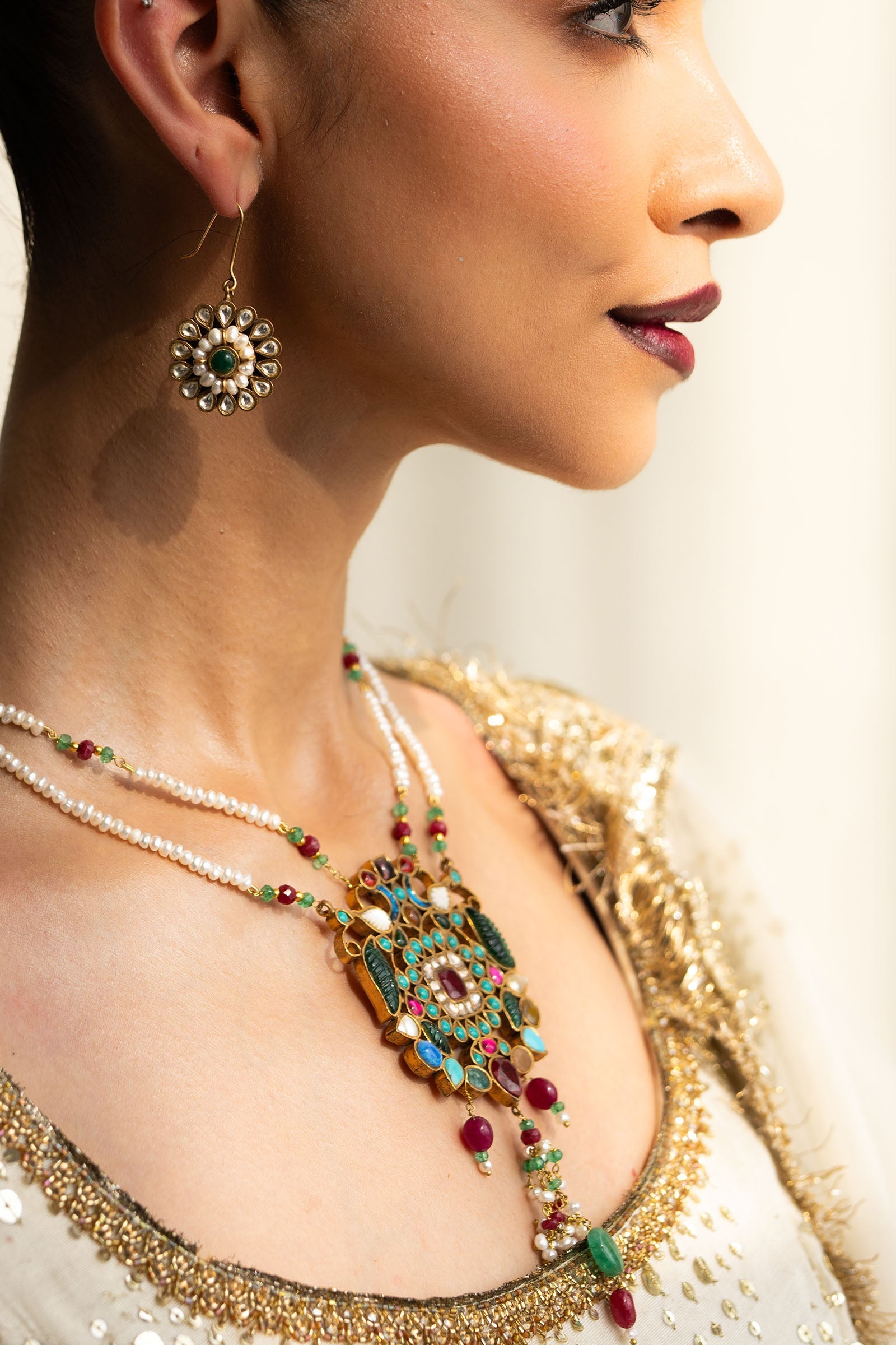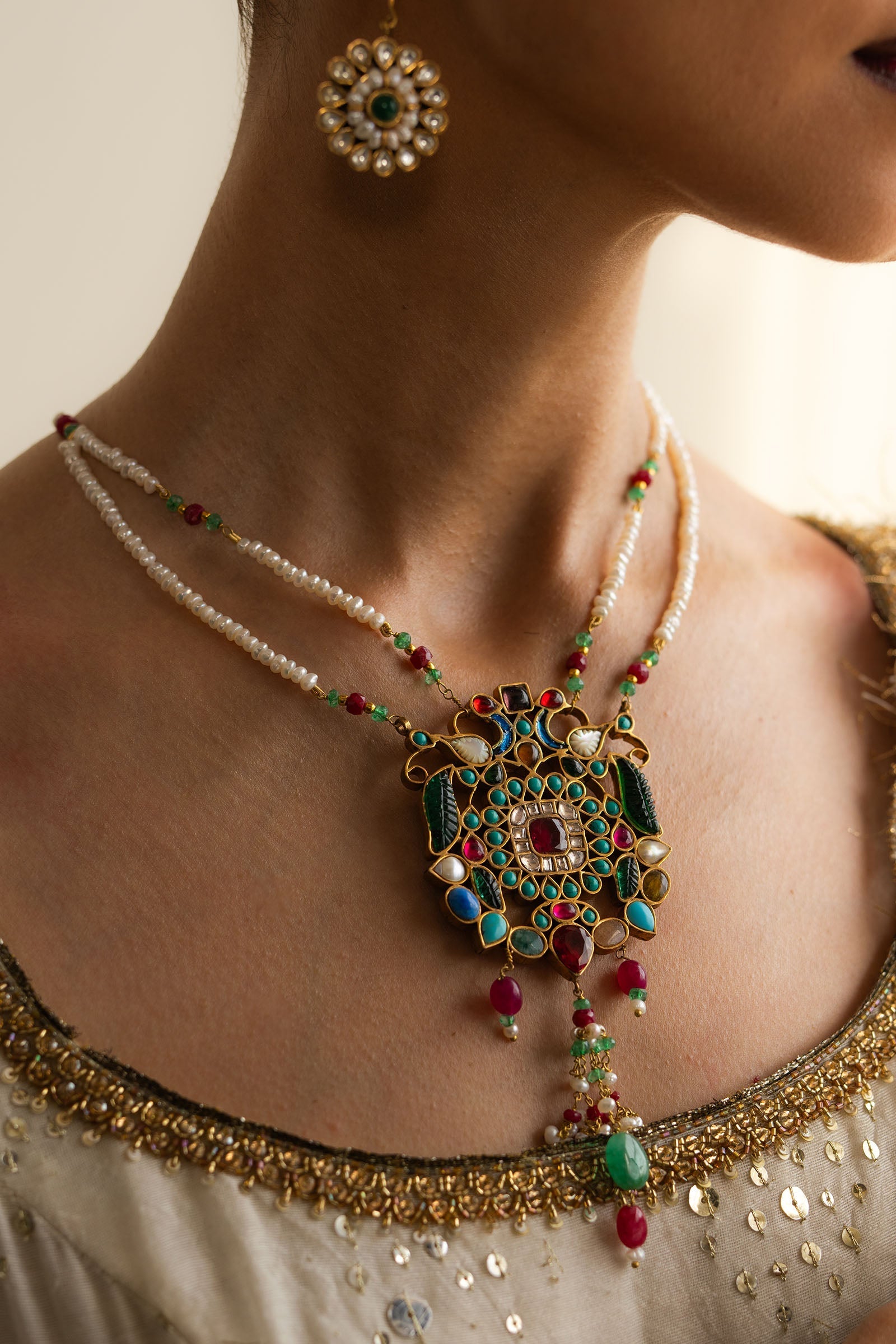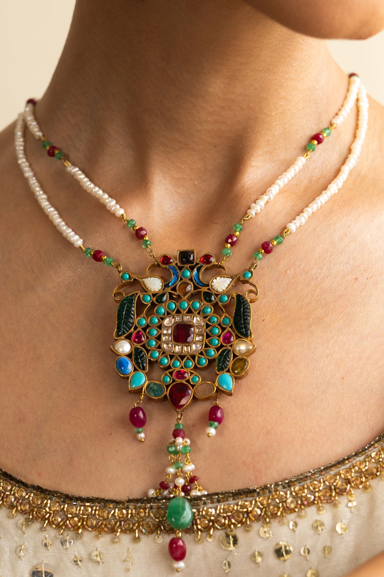 This handcrafted piece features an exquisite blend of emerald green carved stones and mother of pearl, paired with ruby, feroza, and agate accents.Strung with yellow sapphire, lapis lazuli, and natural pearls, it’s finished with ruby and emerald threads.