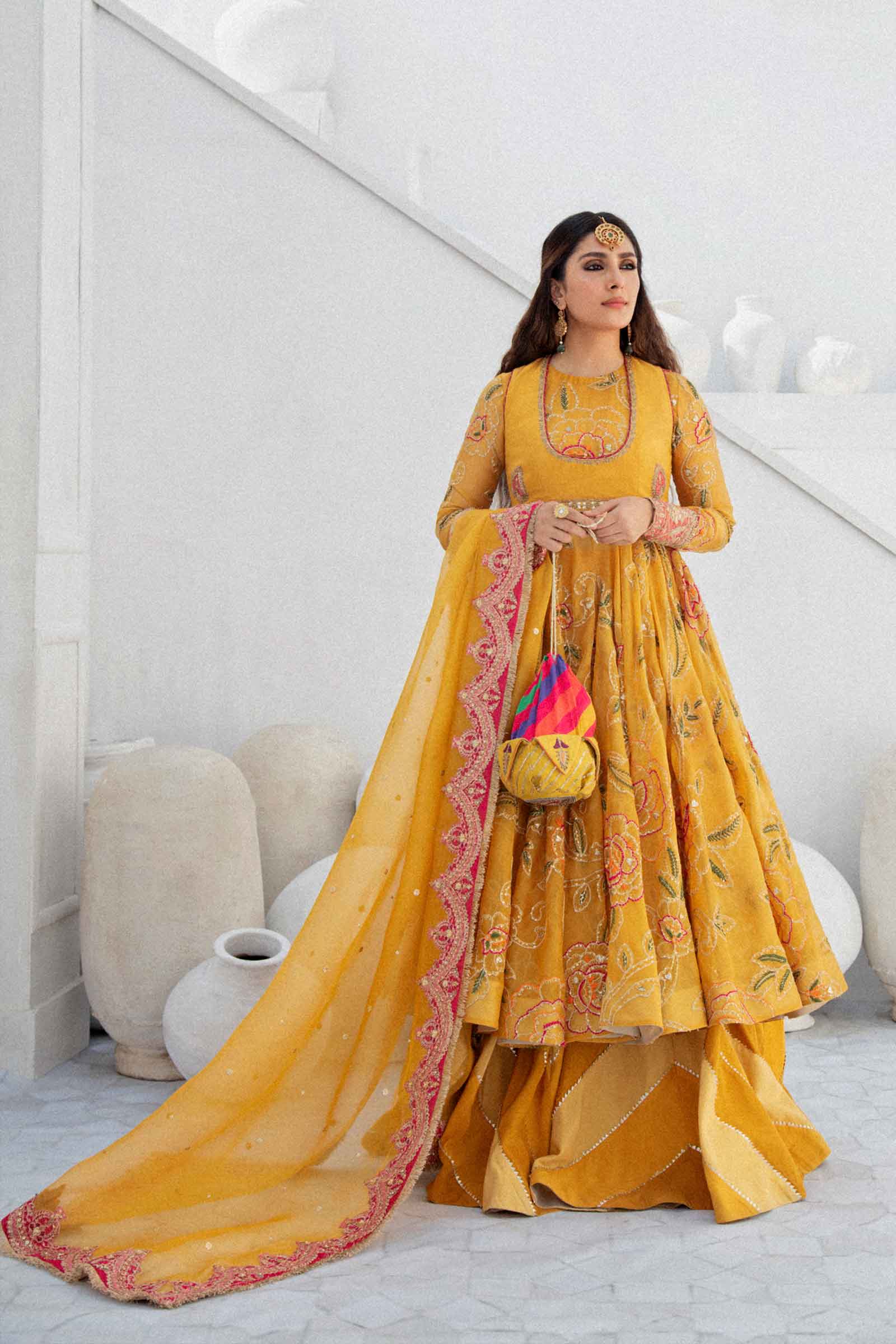 This mustard peshwas with floral bunches is crafted with woolen threads and sequence, paired with a chatta patti lehenga and a same-colored dupatta with scalloped borders embellished in naqshi and pearls and detailed with solid pink raw silk and pure kiran.