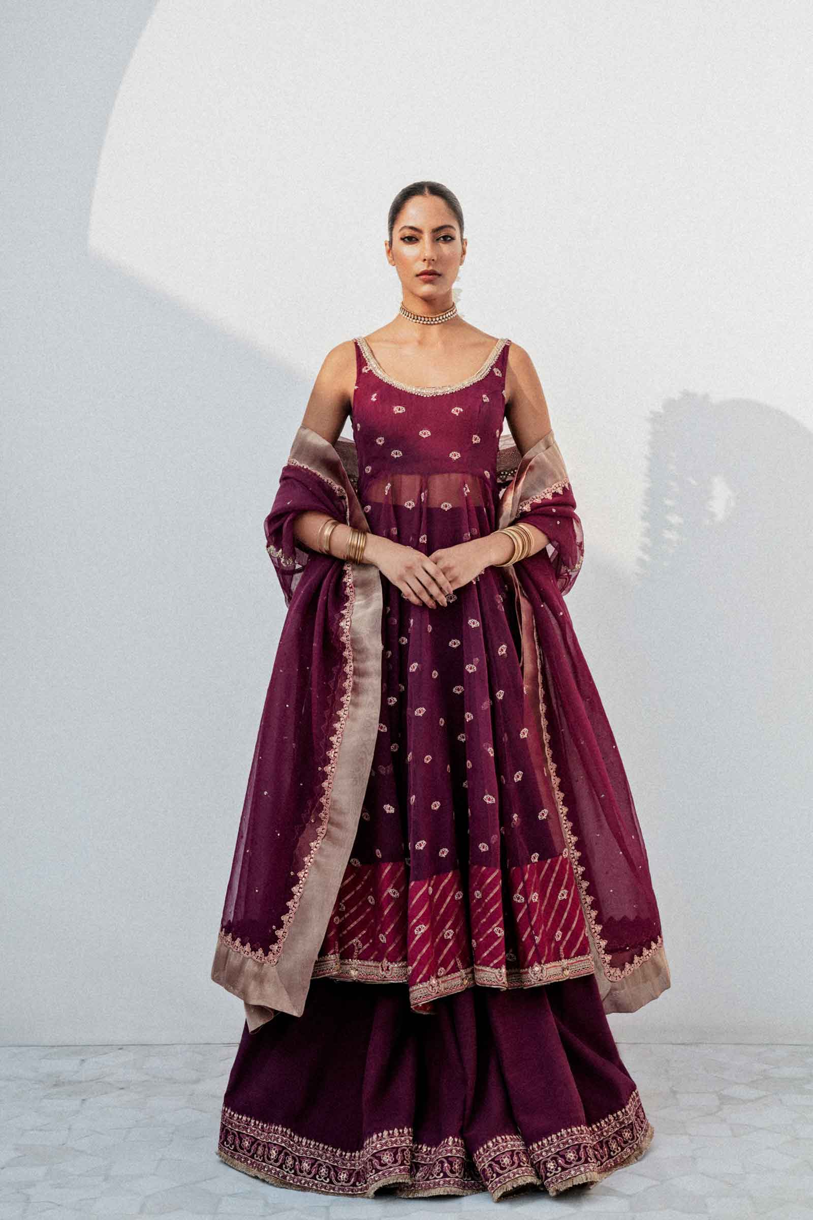 A vibrant purple colored peshwaz in organza embellished with a delicate boti spray and a jeweled neckline with a same colored lehenga and an embellished border. The look is completed with a dupatta enhanced with big appliqued floral bunches and baels along all four sides.