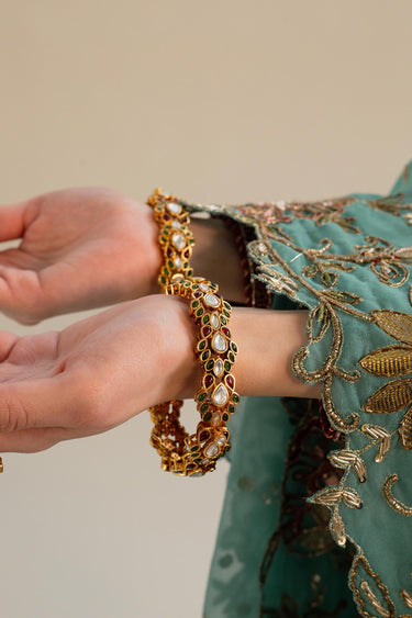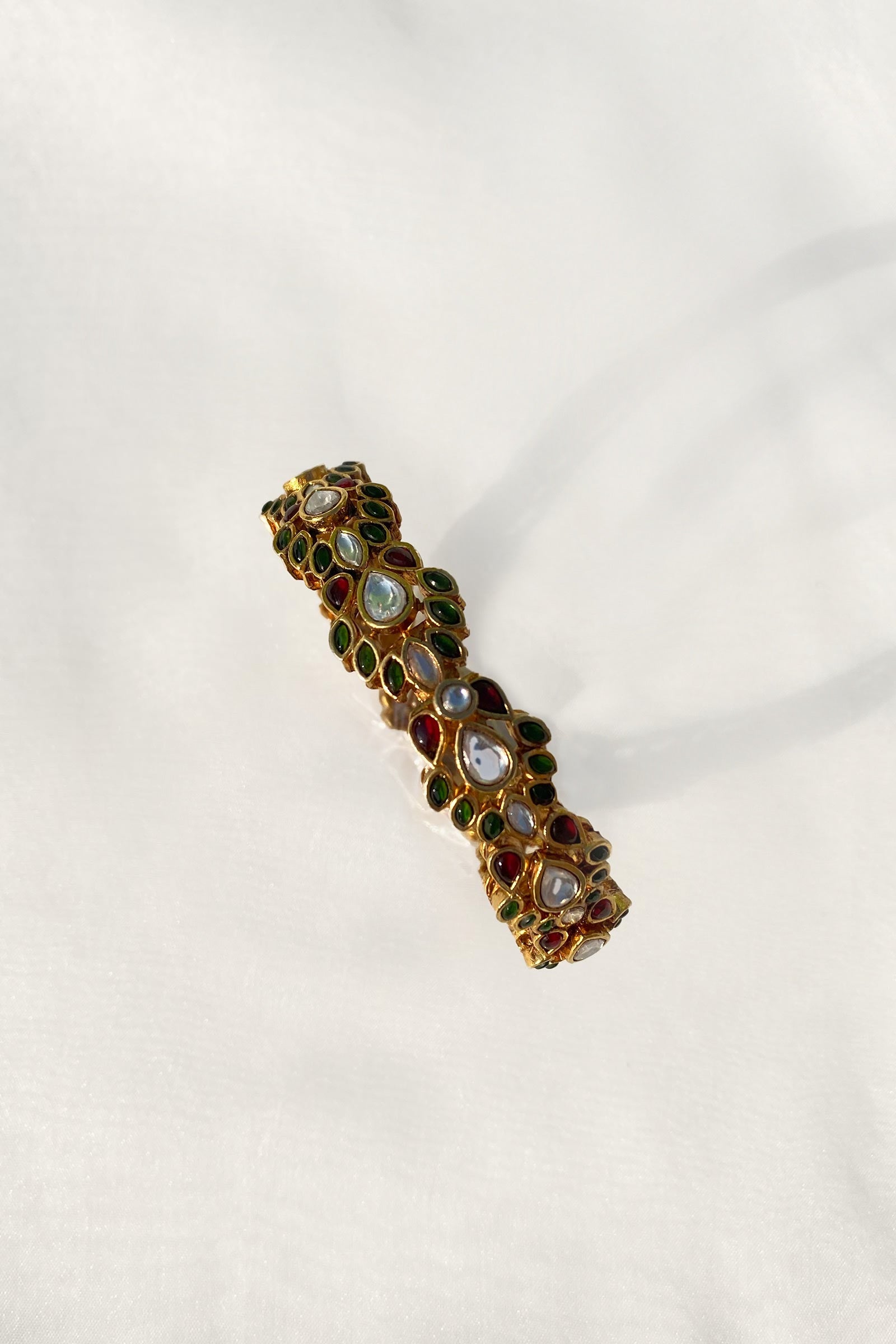 Gold-plated bangles in zircon kundan with accents of red and green jade stones and comes with a push clasp closure.