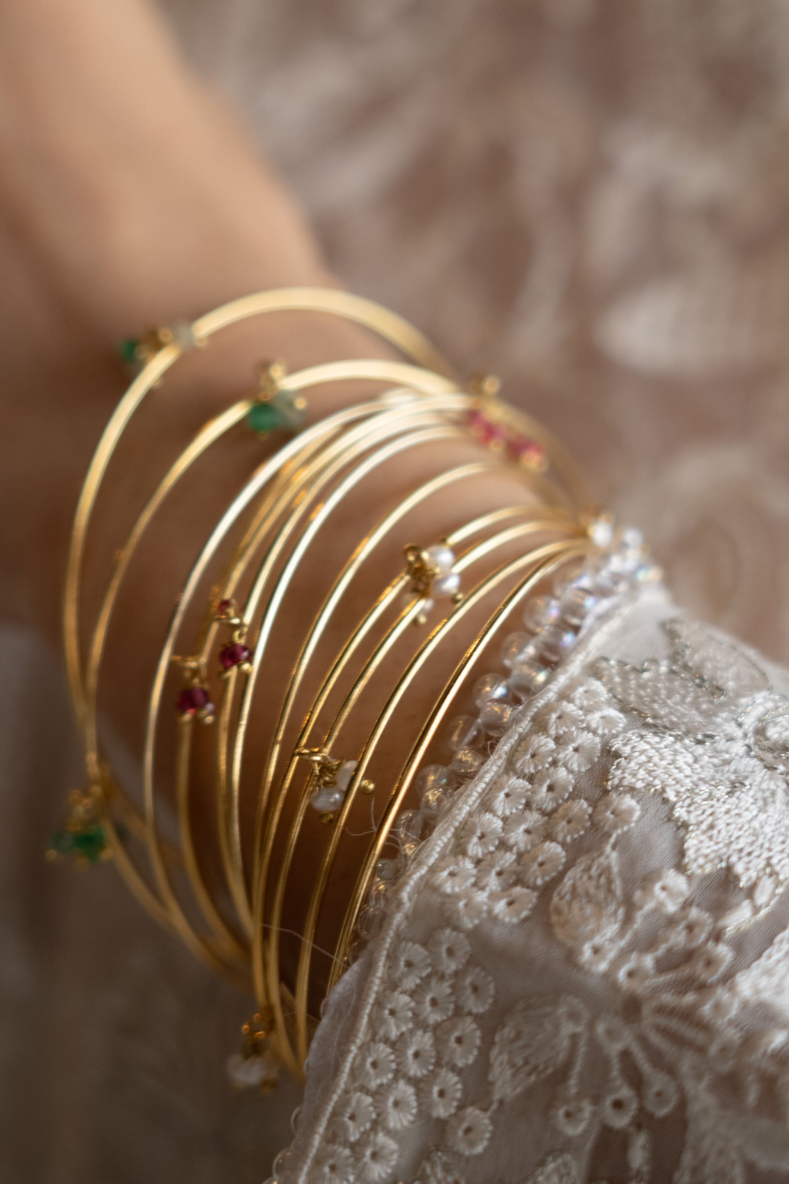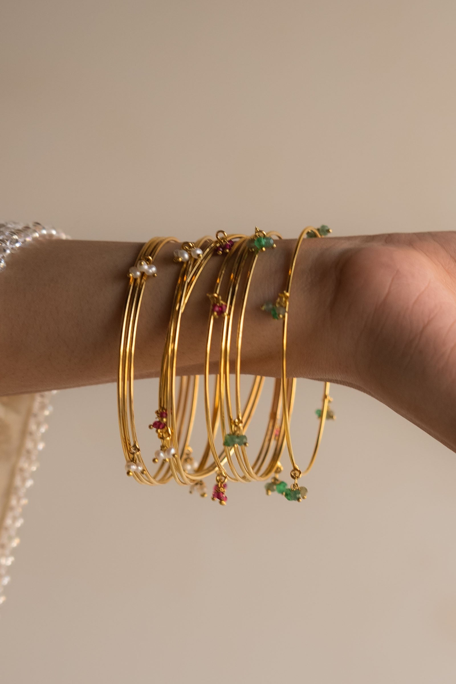 This exquisite bangle set includes 12 pieces—6 sleek plain bangles and 6 adorned with real pearls and a stunning combination of emerald, aqua, and rhodonite stones.A perfect blend of classic elegance and vibrant hues for every occasion.