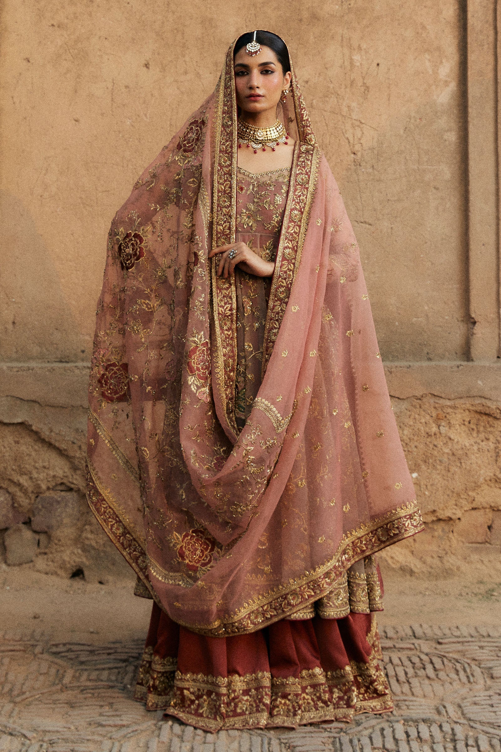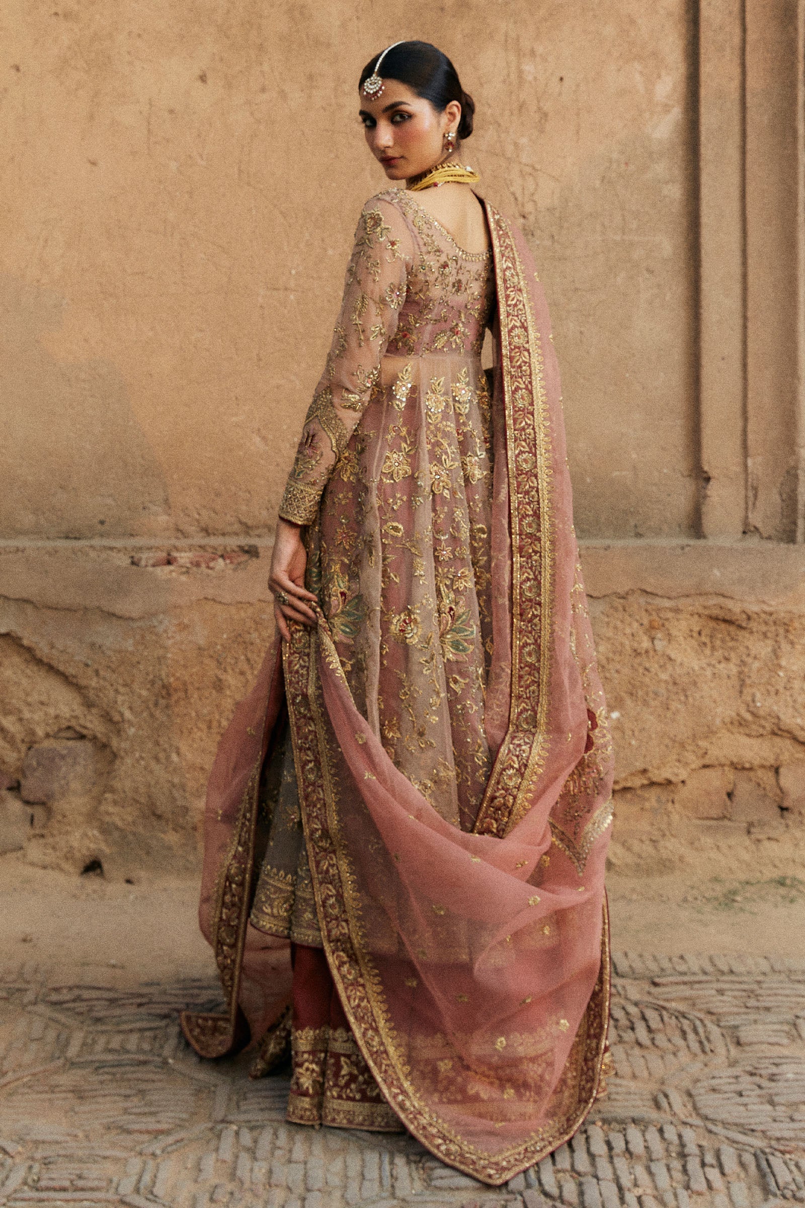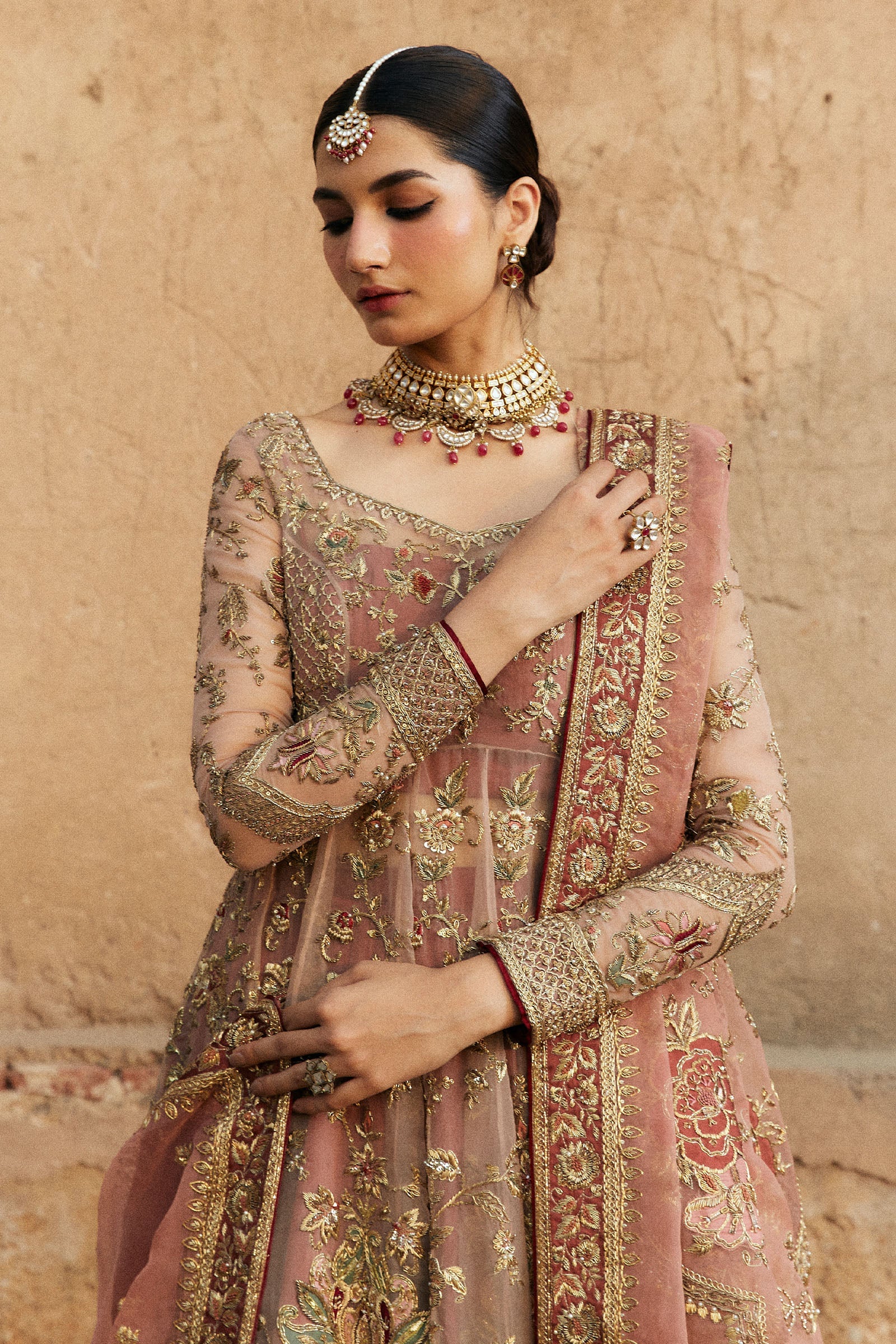 Our Saheli peshwaz in a classic rose gold exudes elegance, intricately embellished with sequins, zardozi and tilla work. Delicate touches of patchwork add depth and artistry to this design and is paired with a lehnga featuring broad ornate borders embellished with naqshi, dabka, and resham work. Completing the ensemble is an organza dupatta, adorned with hand-embroidered naqshi, patchwork, resham, and sitara details.