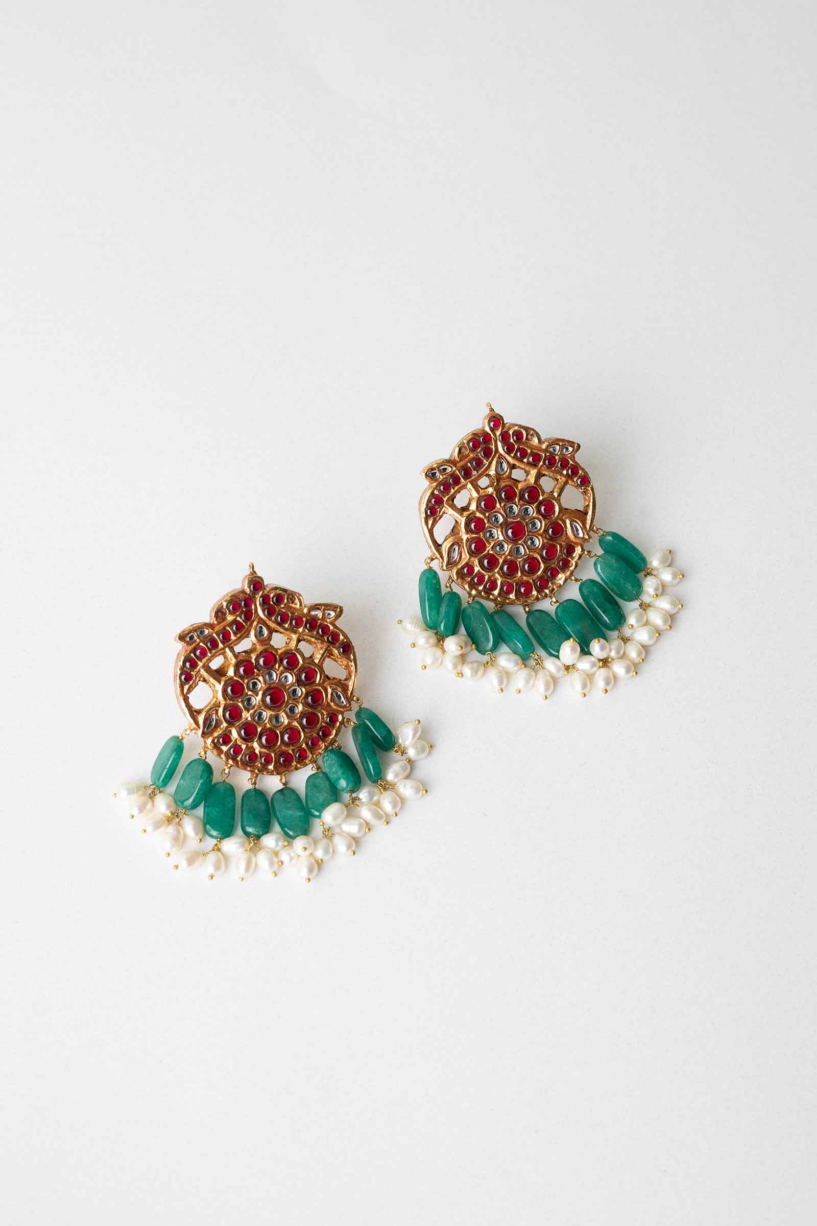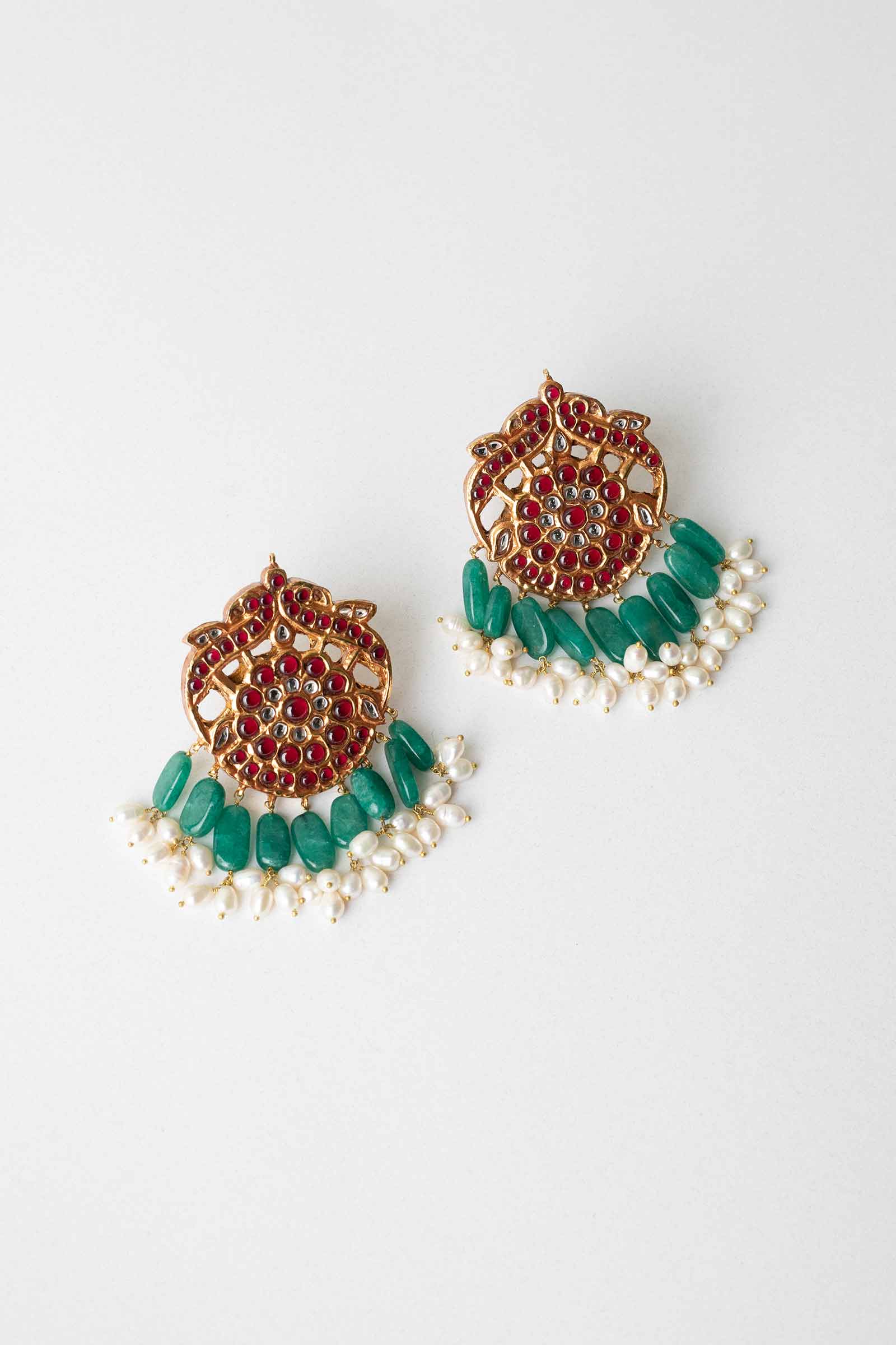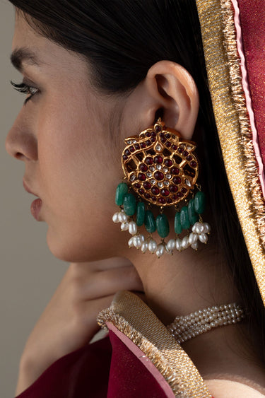 These regal 22K gold plated earrings have the most intricate detailing of chetam stones with kundan, further enhanced with real ivory pearls and semi precious moss green stones. Mechanism: Push back