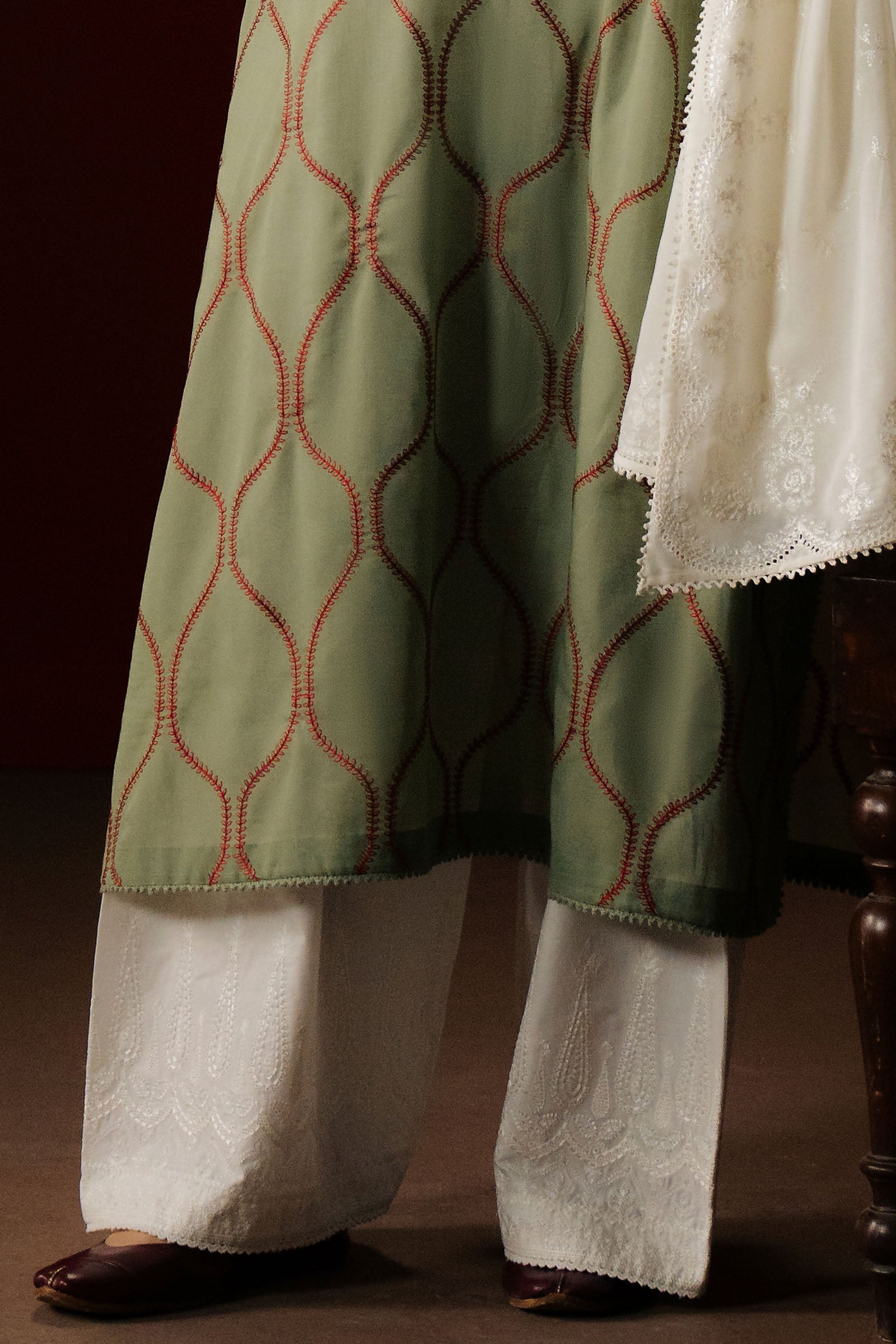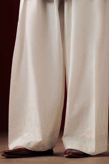 Riwaayat is an ethereal snow-white farshi shalwar crafted in a luxurious, flowing silhouette that drapes with timeless grace. The hem is adorned with intricate Kashmiri embroidery, adding richness and depth while preserving a refined, understated aesthetic.