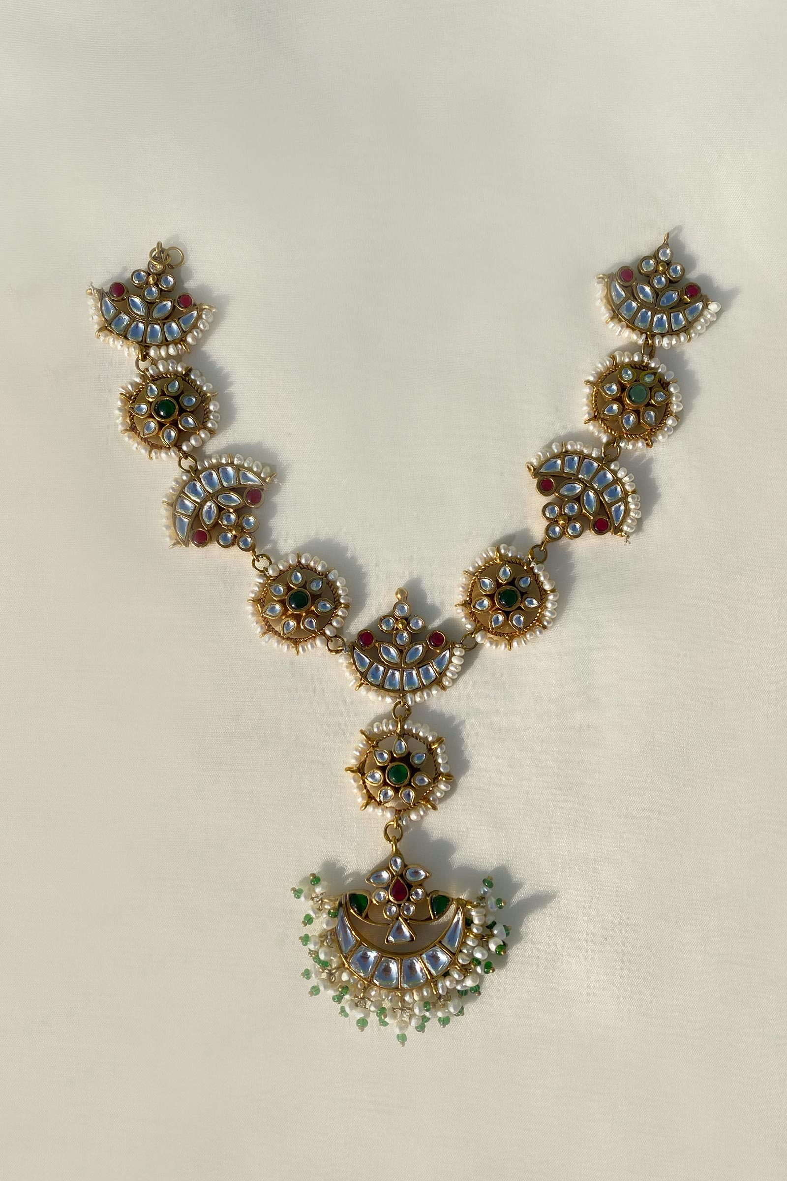 Gold-plated maatha pati made in zircon kundan, green and red jade stones put together in natural pearls.