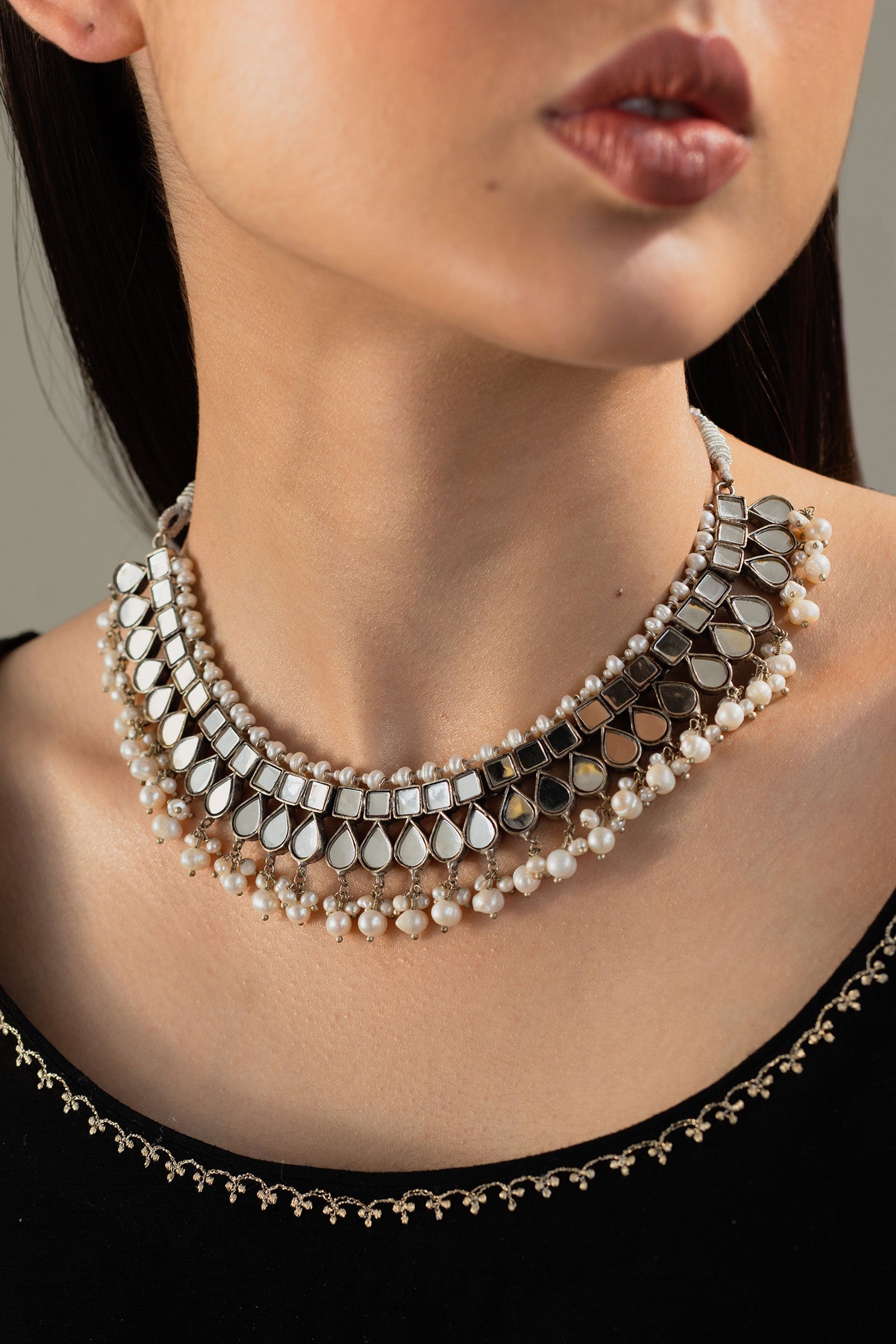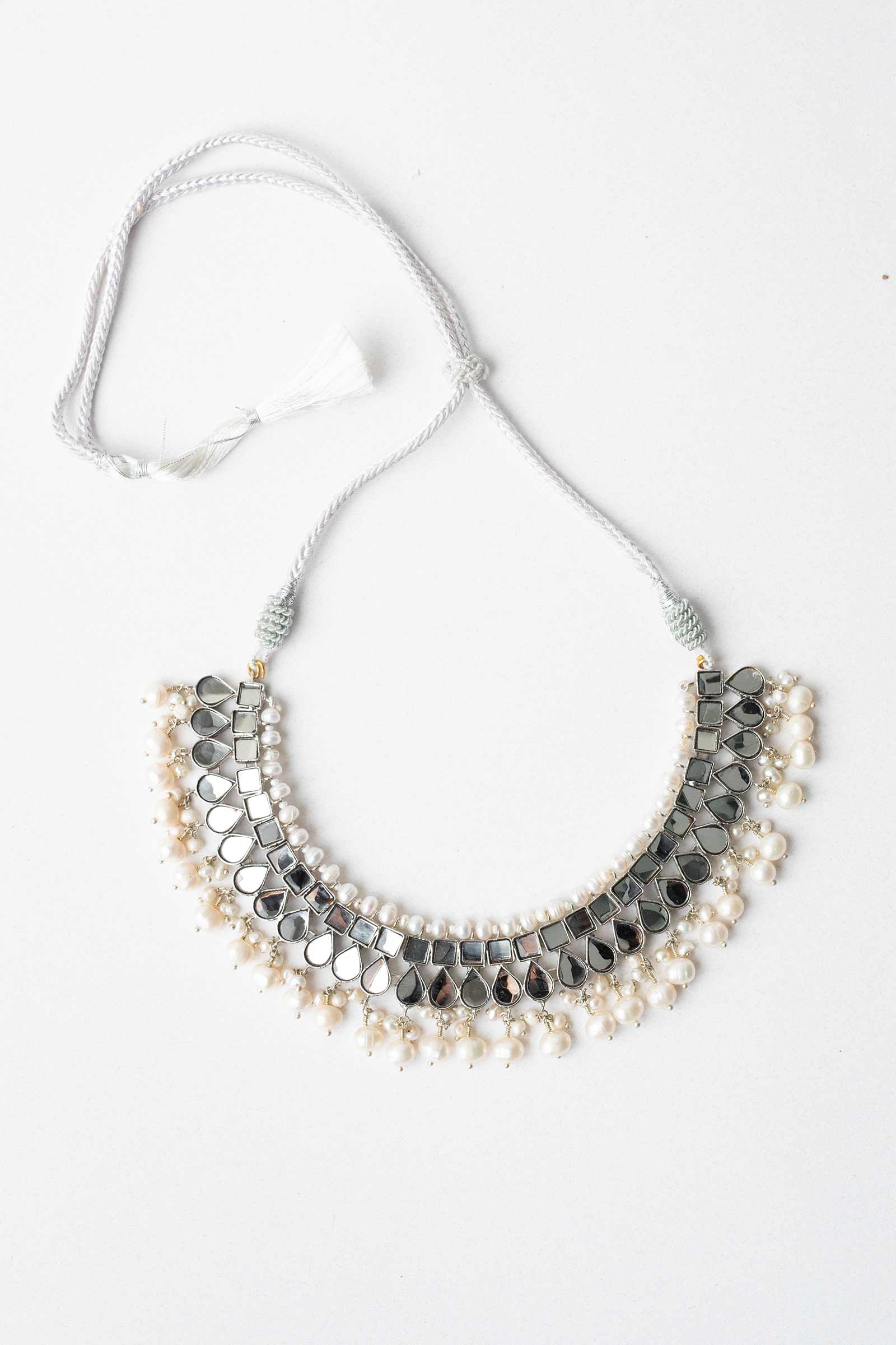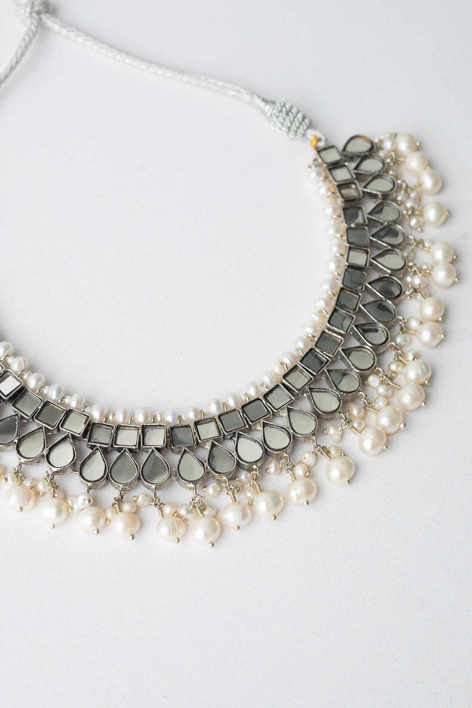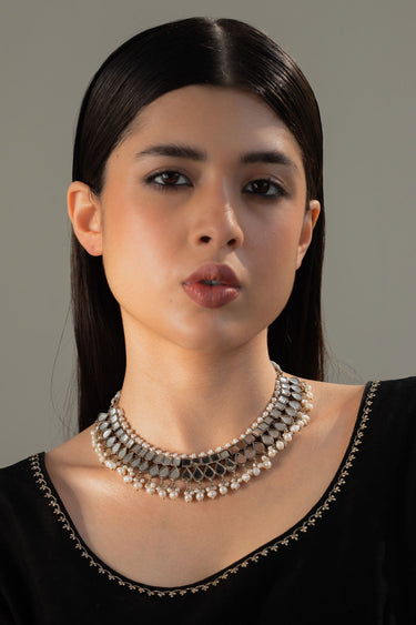 This silver plated choker is set in flat mirror-like kundan and natural pearls.