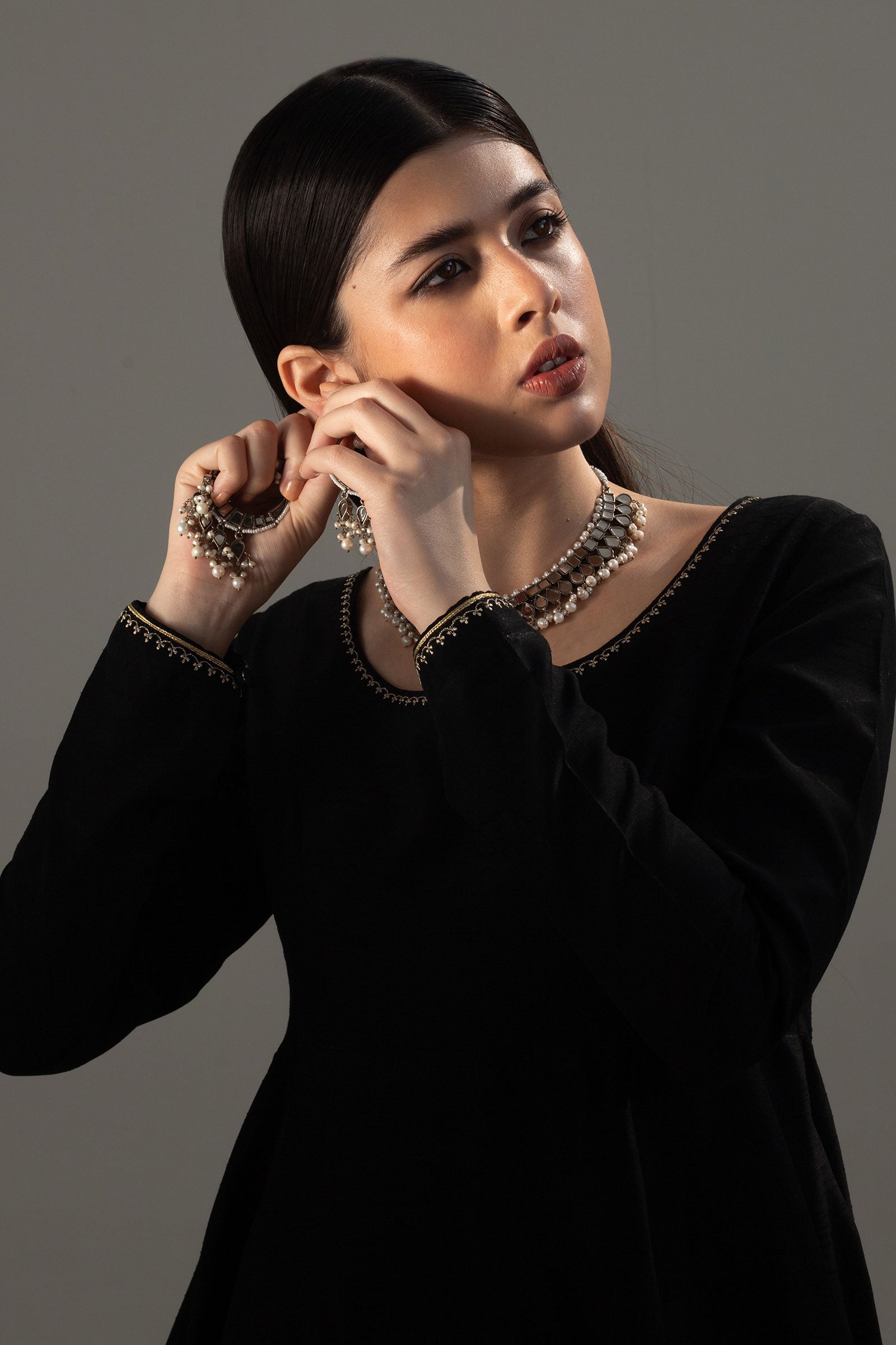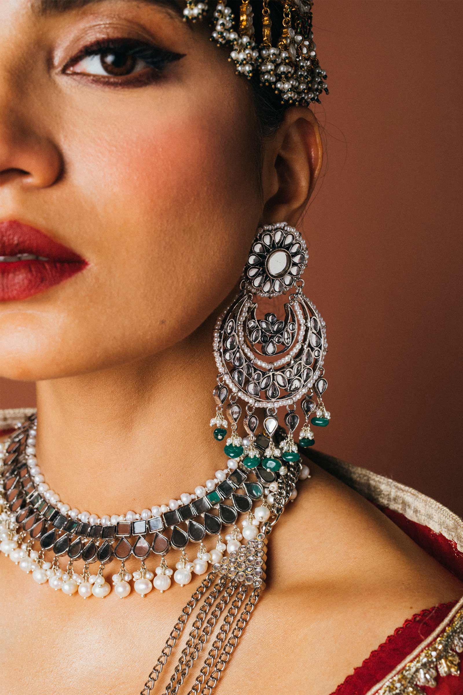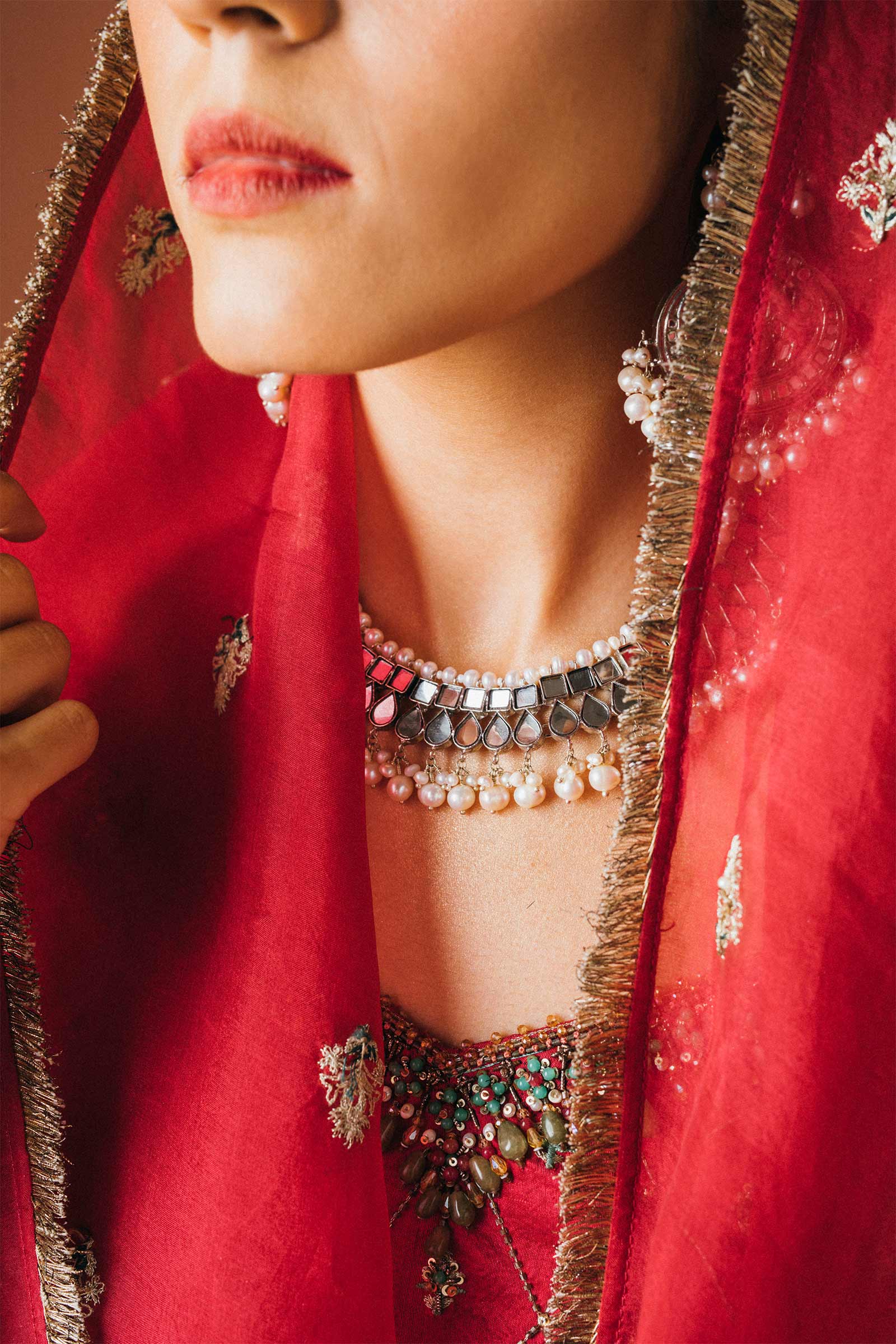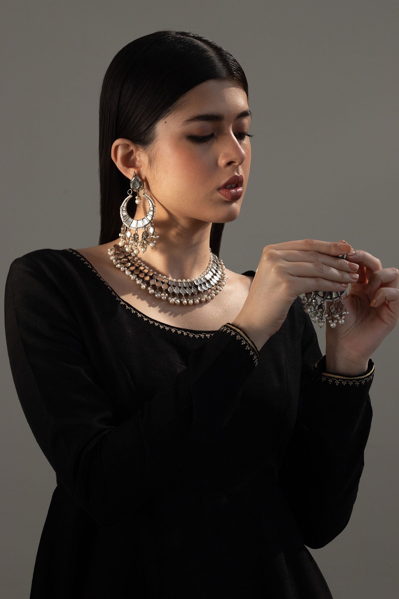 This silver plated choker is set in flat mirror-like kundan and natural pearls.