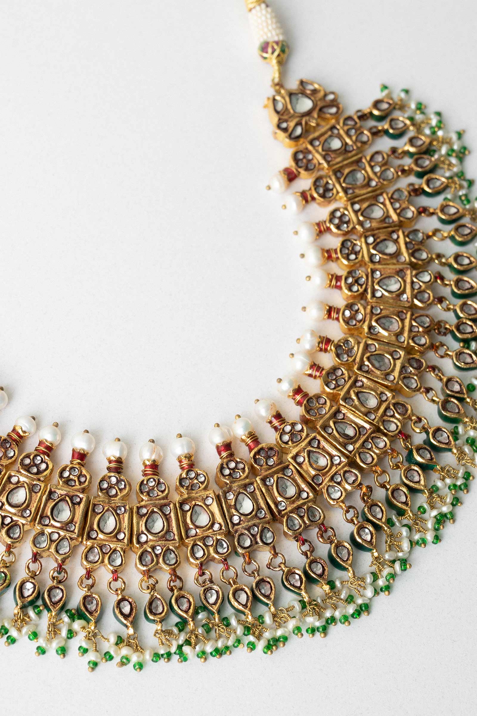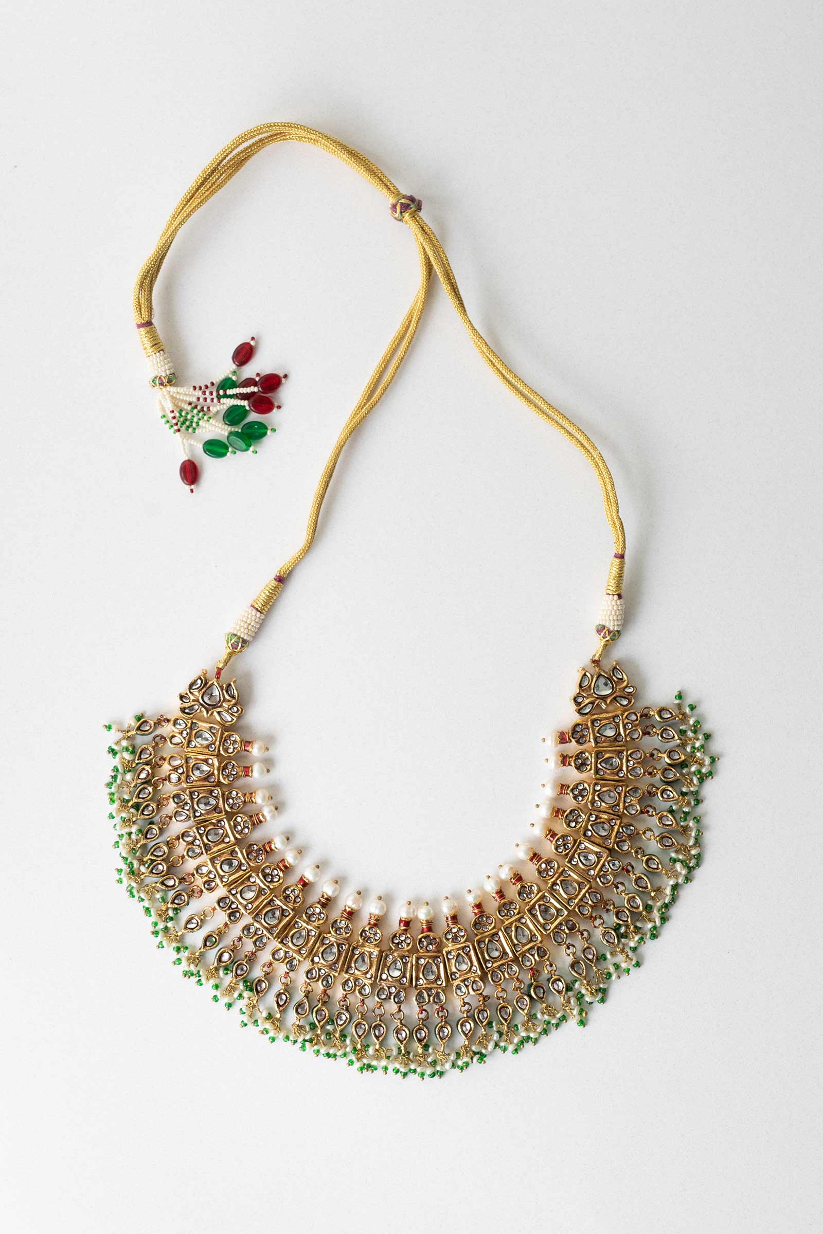 This traditional 21k gold plated kundan necklace is intricately adorned with beautiful motifs set in kundan and natural pearls.