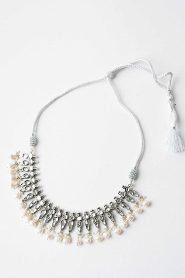 This silver plated choker is beautifully set in kundan and adorned with pearls making it a perfect accessory for any formal attire.