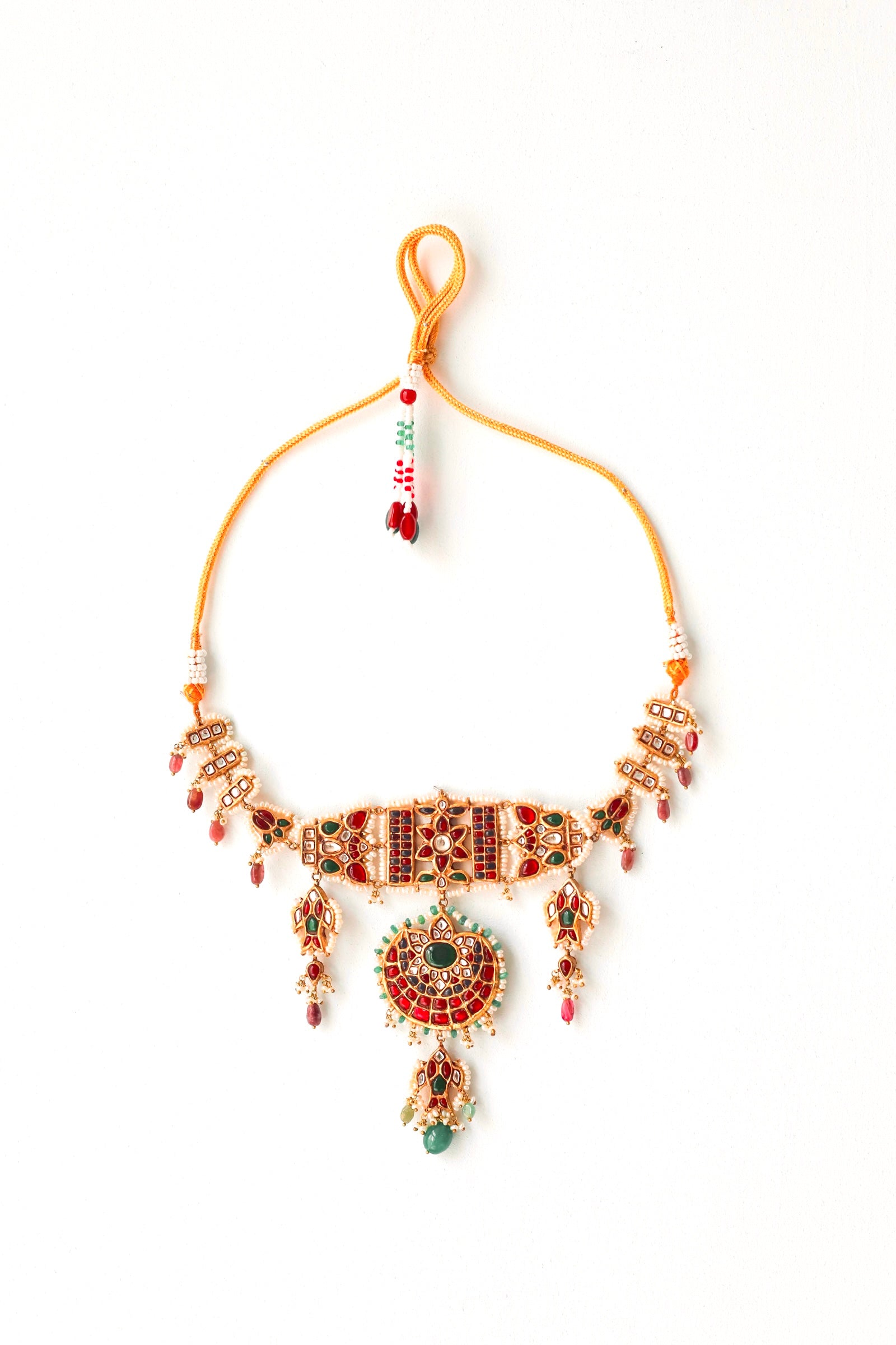 This Necklace is 22k gold plated, set in hand-picked Stone like , Zircon, Chetam, Sapphire and Green Agate. Strung together with natural pearls, Red and light green Agate and Emerald. Perfect for all your celebrations.