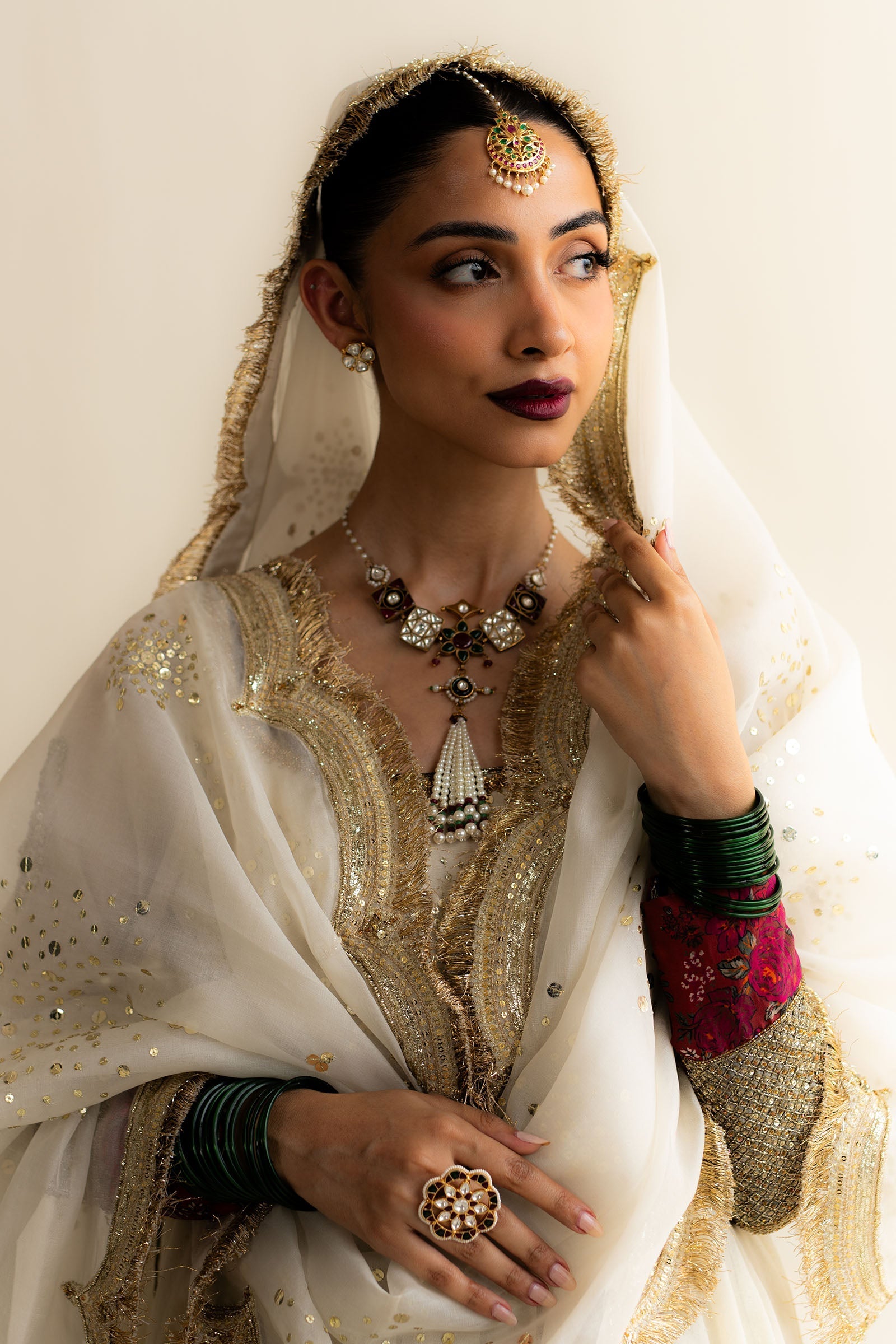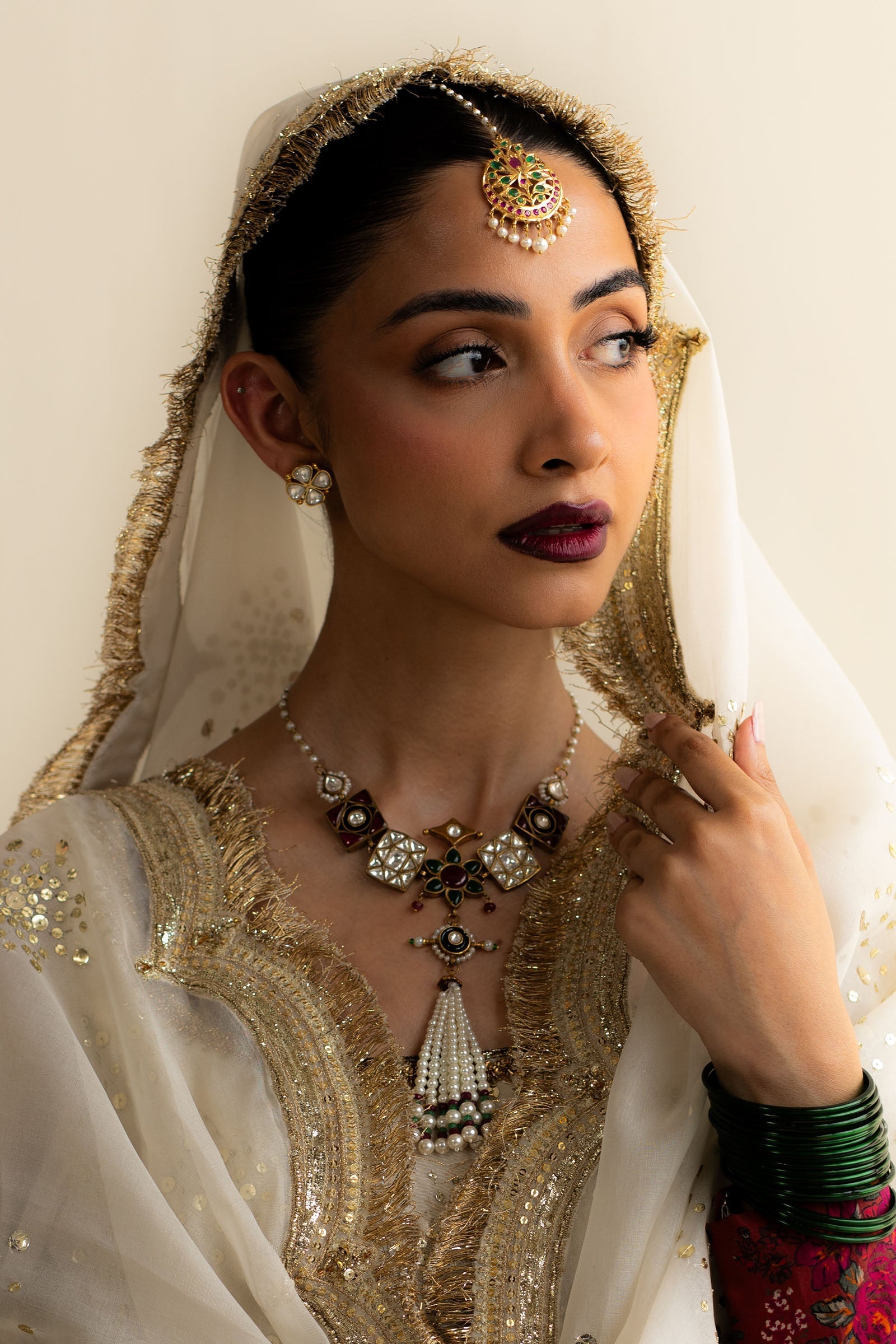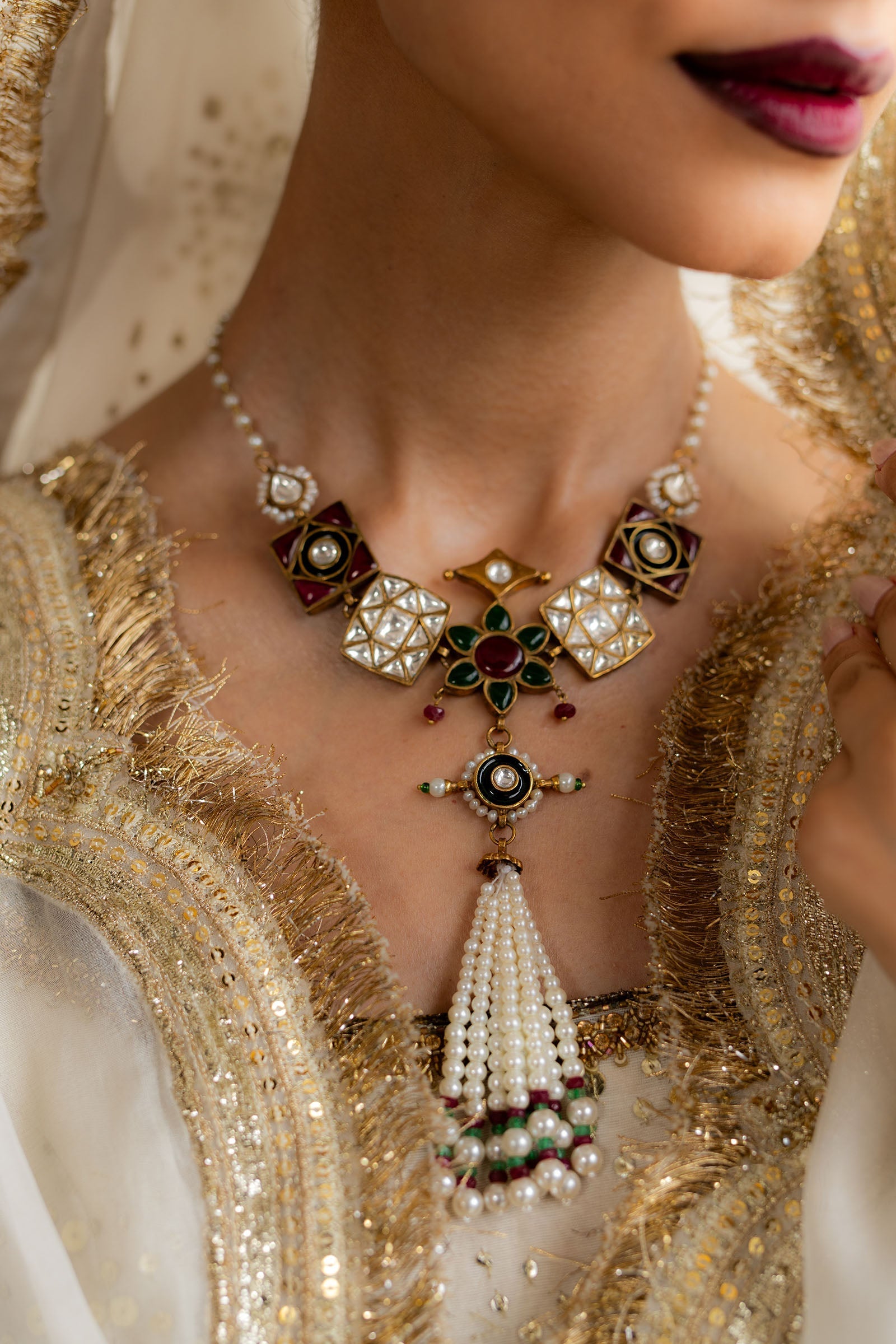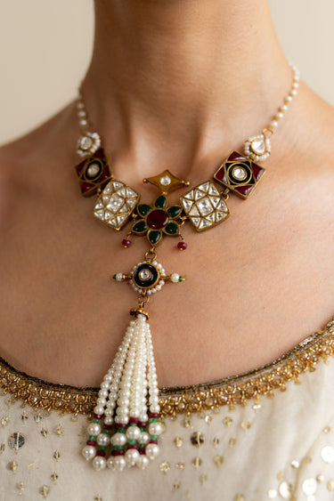 A graceful blend of pearls, zircon, red chetam, and green stones—each element echoing timeless femininity.Designed to adorn with quiet power and heirloom charm.