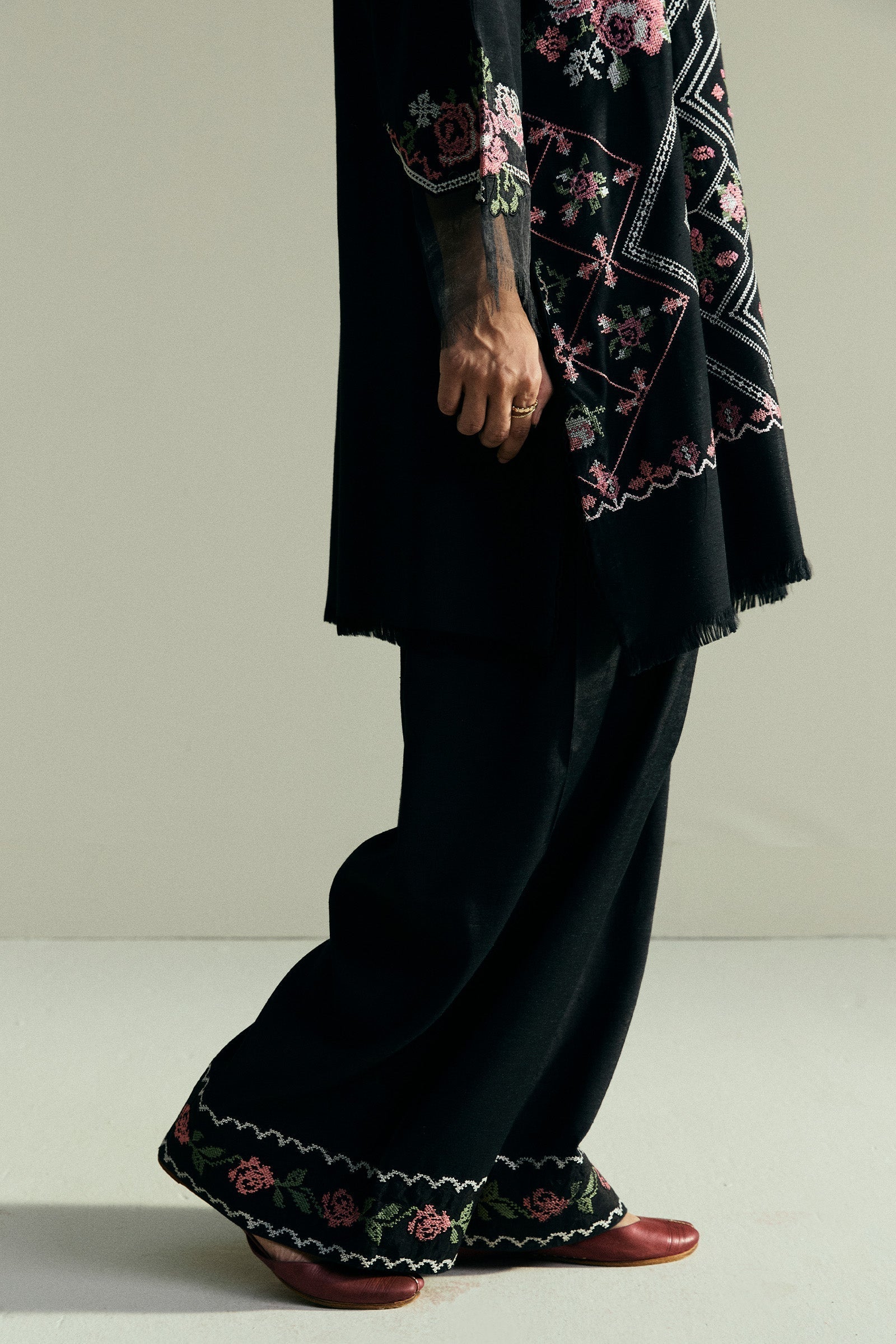 This short black kurta is fully embroidered with vibrant cross-stitch patterns, bringing color and detail to its classic silhouette. It is paired with an embroidered farshi shalwar that adds grace and volume to the look. Together, the pieces create a striking expression of elegance.