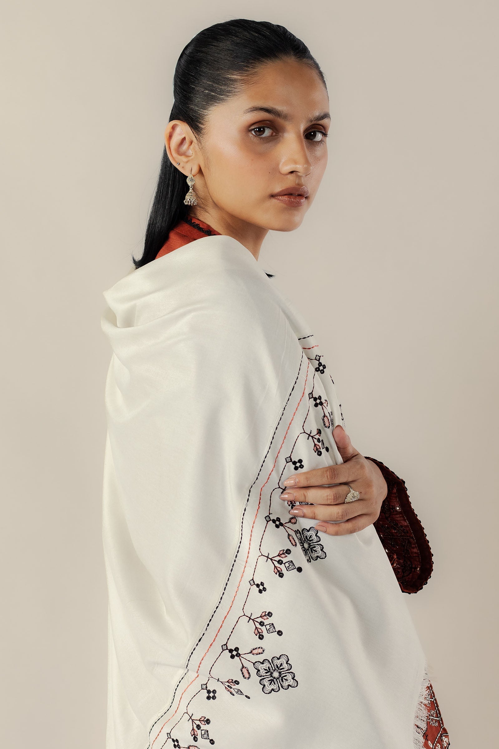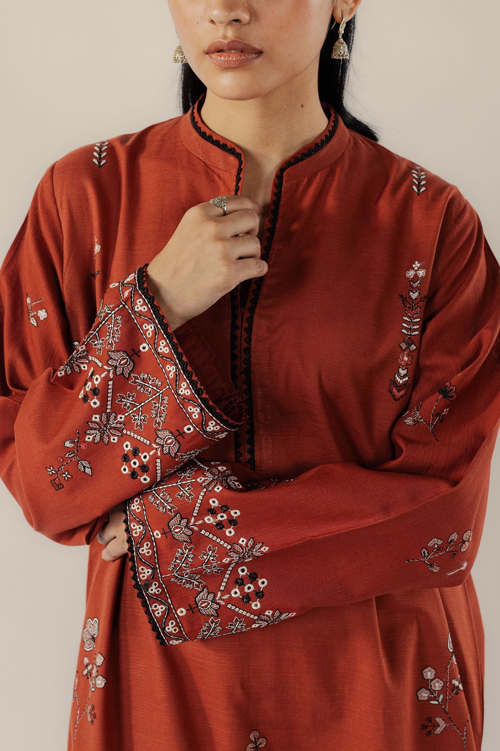 A rust-colored long shirt adorned with black and off-white embroidery, paired with tonal cropped wide hem pants for a refined silhouette. The ensemble is completed with a beautifully embroidered shawl pallu, adding a touch of elegance and tradition.