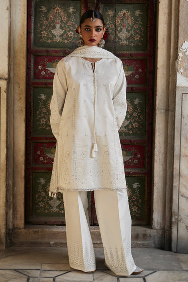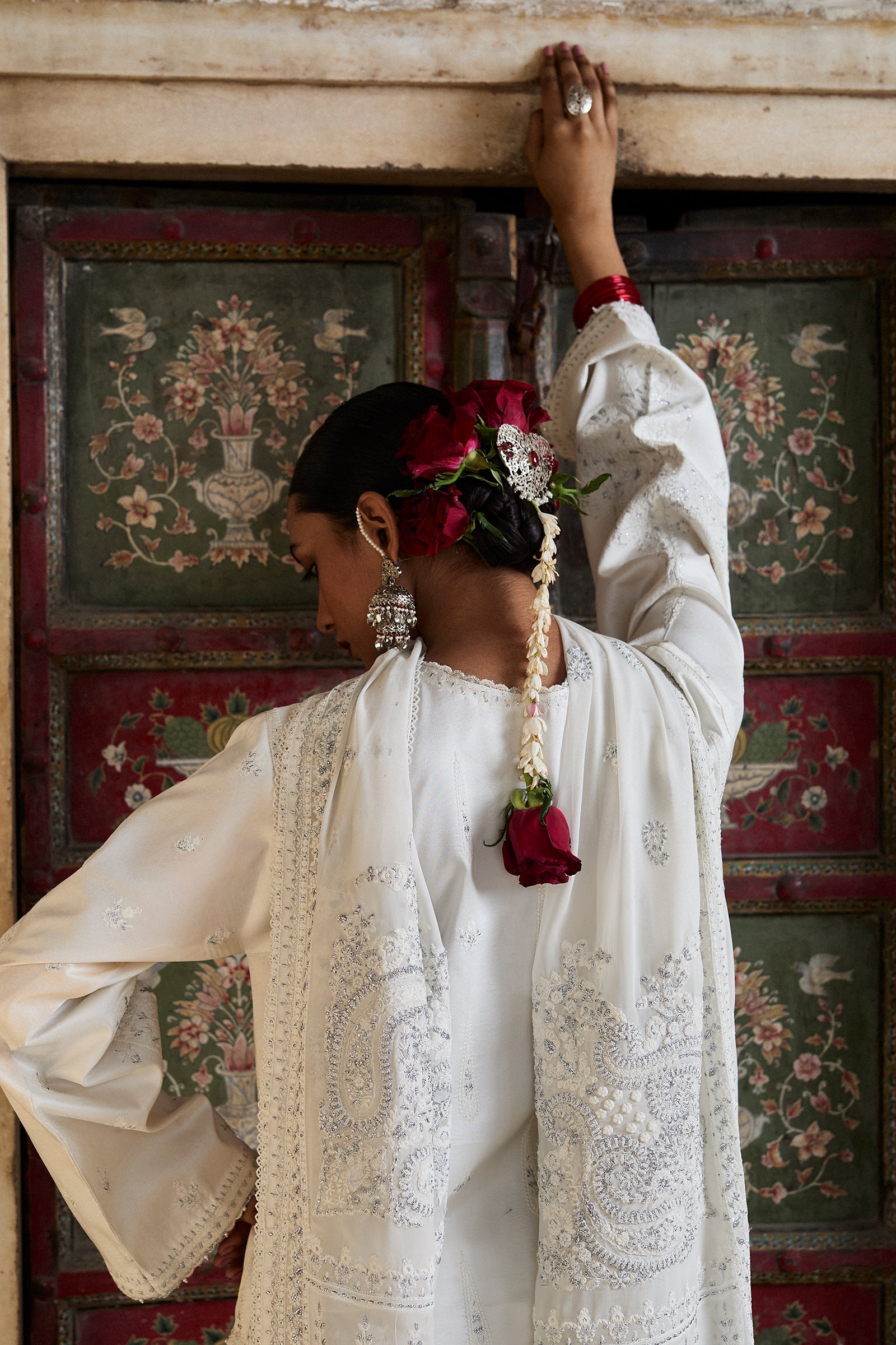 Raihaana — like the sweet basil flower it is named after, this bridal wear carries a quiet, sacred elegance. Crafted in ivory-toned raw silk, the shirt and trouser are delicately embroidered with silken threads in a rhythm that evokes floral tracery, soft as scent on air. The silhouette is modest yet fluid, adorned with fine tassels and subtle detailing that speaks of restraint and refinement. The look is completed with a georgette dupatta, intricately worked with tonal embroidery.