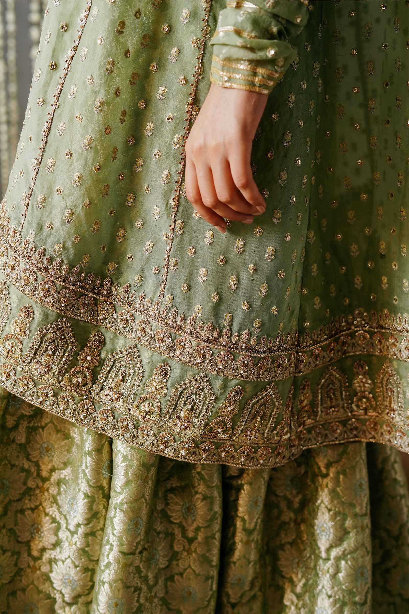 A classic old school kamkhaab gharara with a richly embellished border. It is paired with a loose fit five paneled fully embroidered kurta with churidar sleeves. It is embellished with a spray of sequence and hand embellished bail along the panel lines, an elaborate border at the hem and motif on the chest. The ensemble has a floral mukesh dupatta with an embellished border along all four sides finished with kiran.