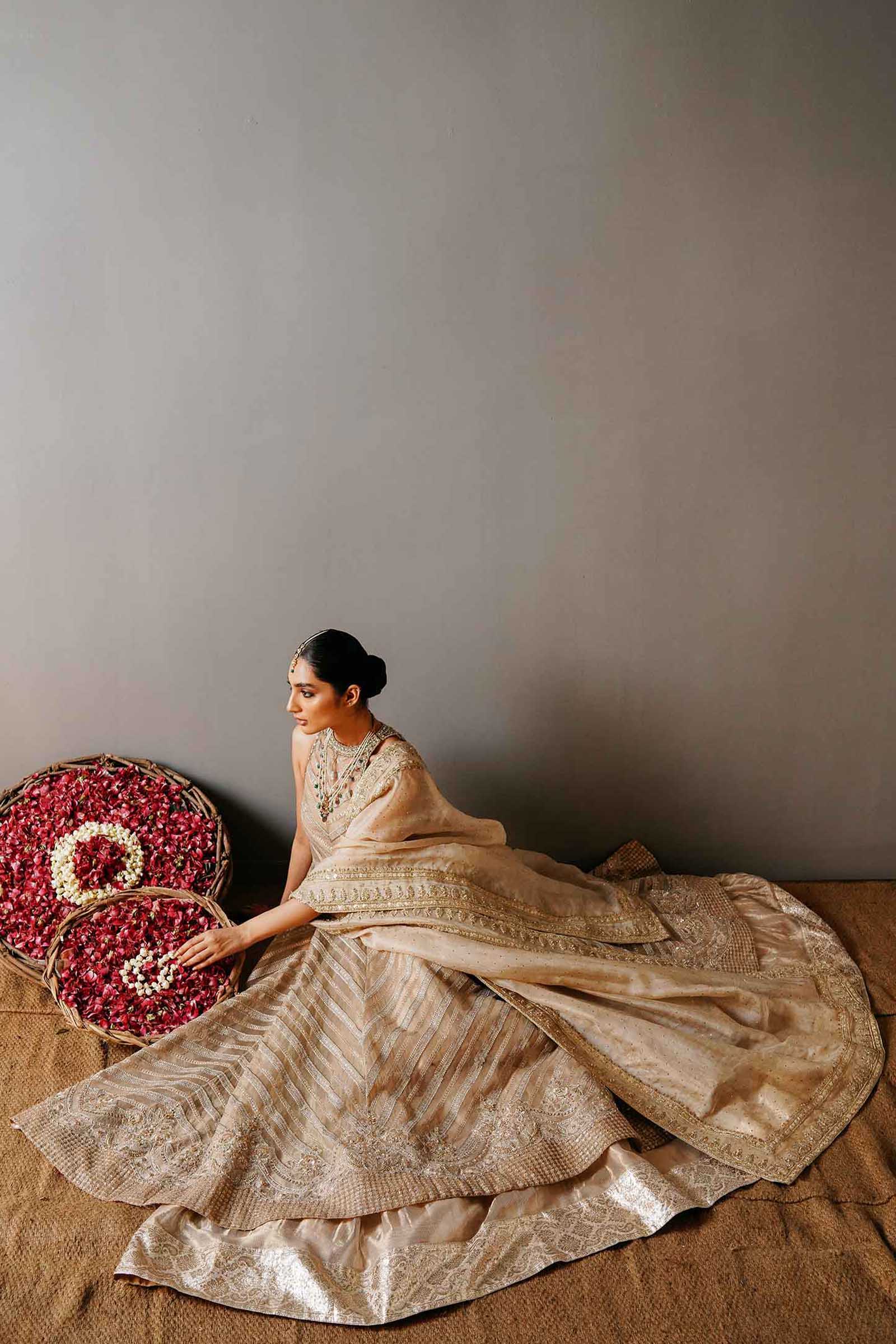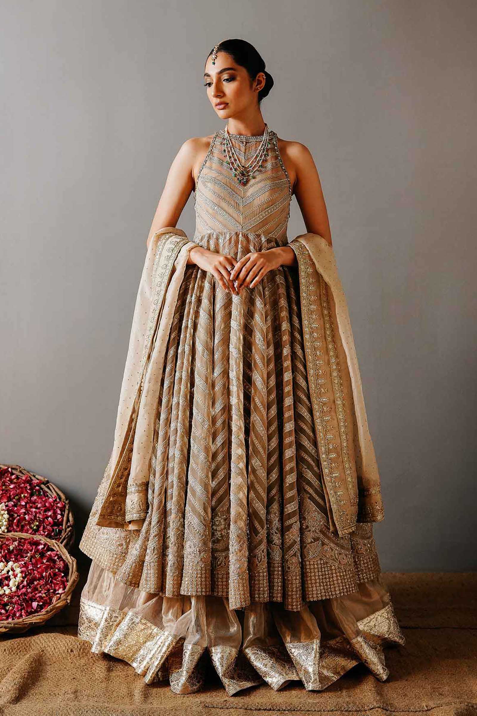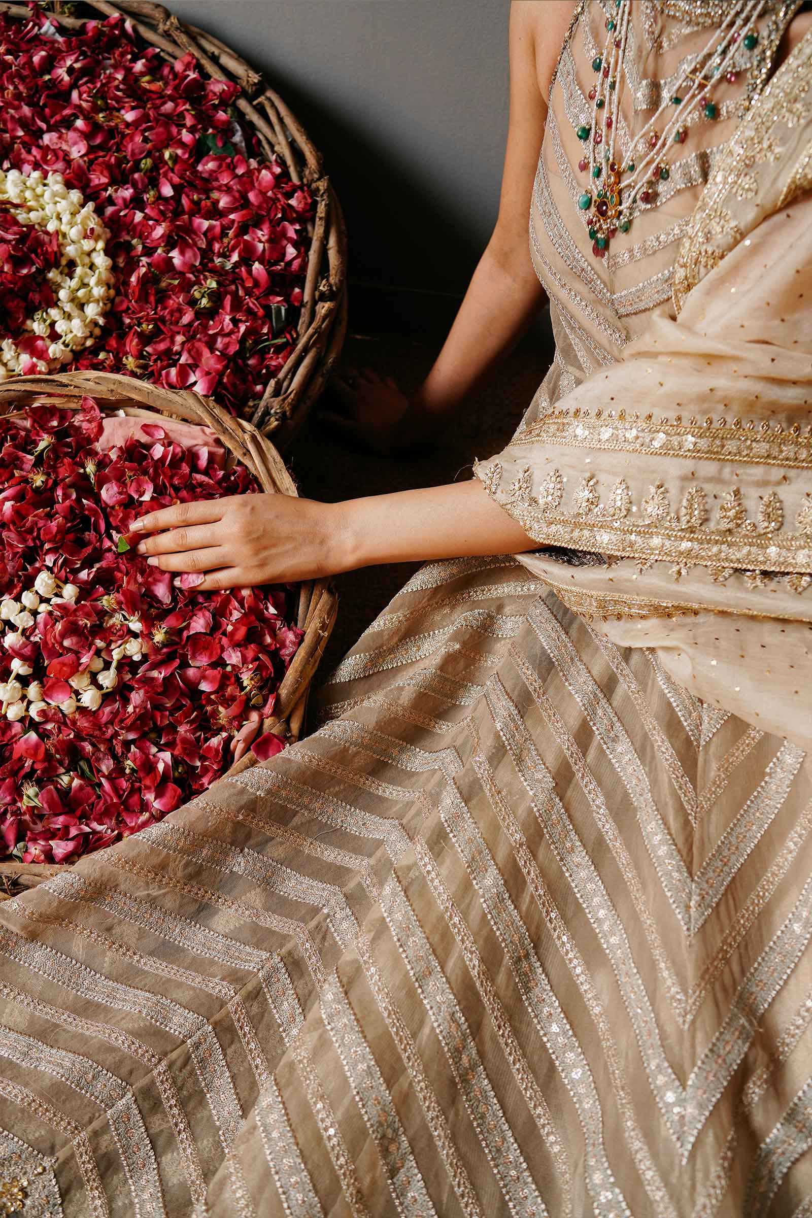 A beige peshwaz with an embroidered chevron pattern along the panels and bodice. It is fully embellished with an intricate jeweled neckline and detailing on the armhole, with an extensively hand embellished border finished with sitara and tila jaal. It is paired with a crushed tissue lehnga with a detailed border at the hem. The look is completed with a mukesh dupatta with heavily embellished borders in naqshi, sitara, gotta and marori along all four sides.