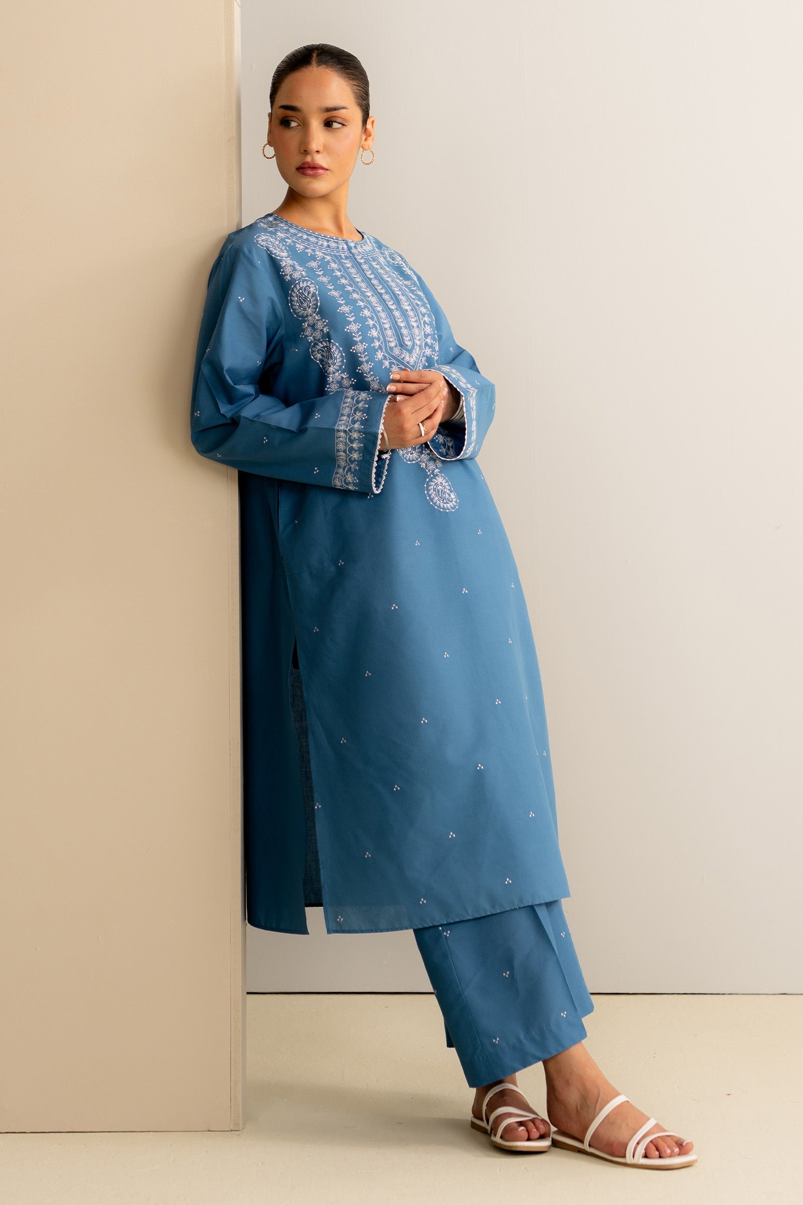 A relaxed, loose-fit kurta with fine embroidery on the front, sleeves, and neckline. It’s paired with cropped trousers featuring wide hems and subtle embroidery detailing for a balanced, everyday look with a touch of craft.