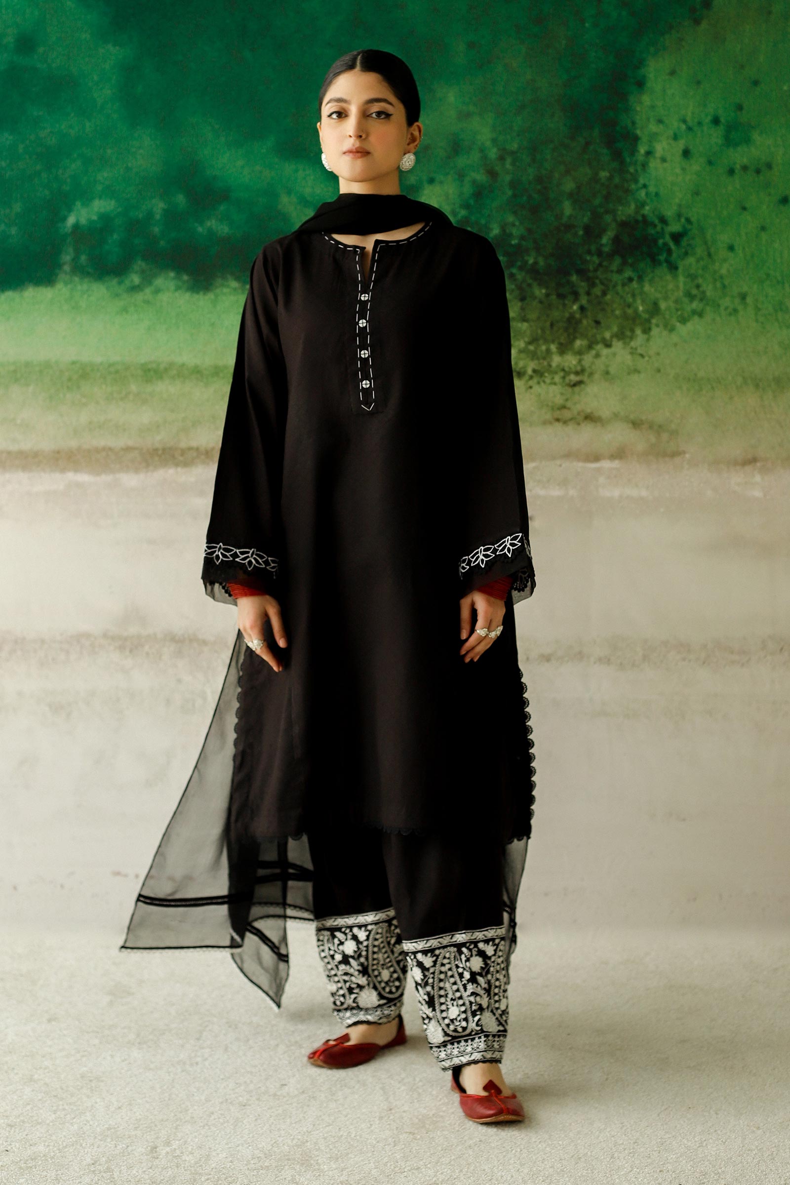 Loose-fit kurta, with detailed embroidery at the neckline and sleeves paired with a relaxed-fit embroidered shalwar.