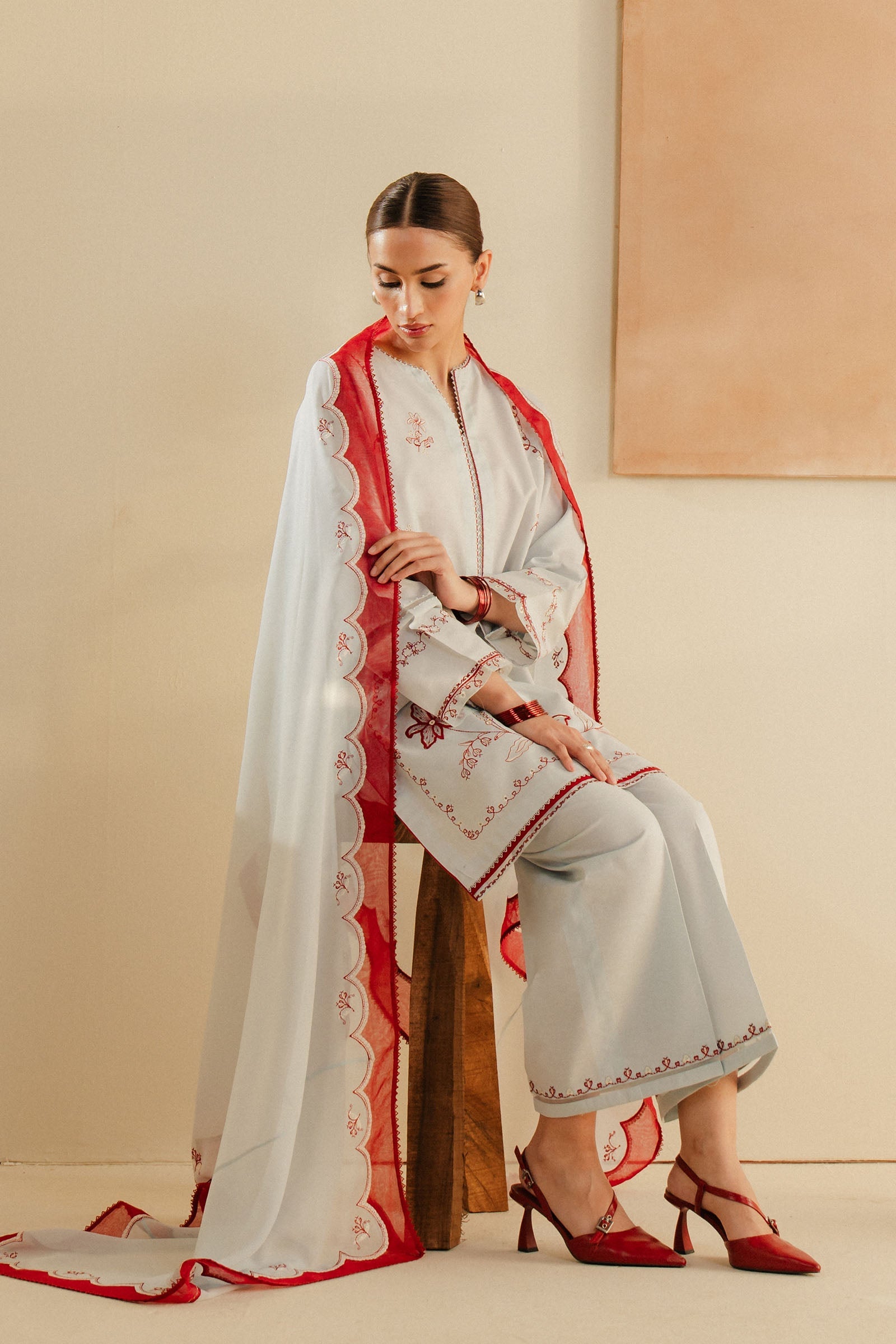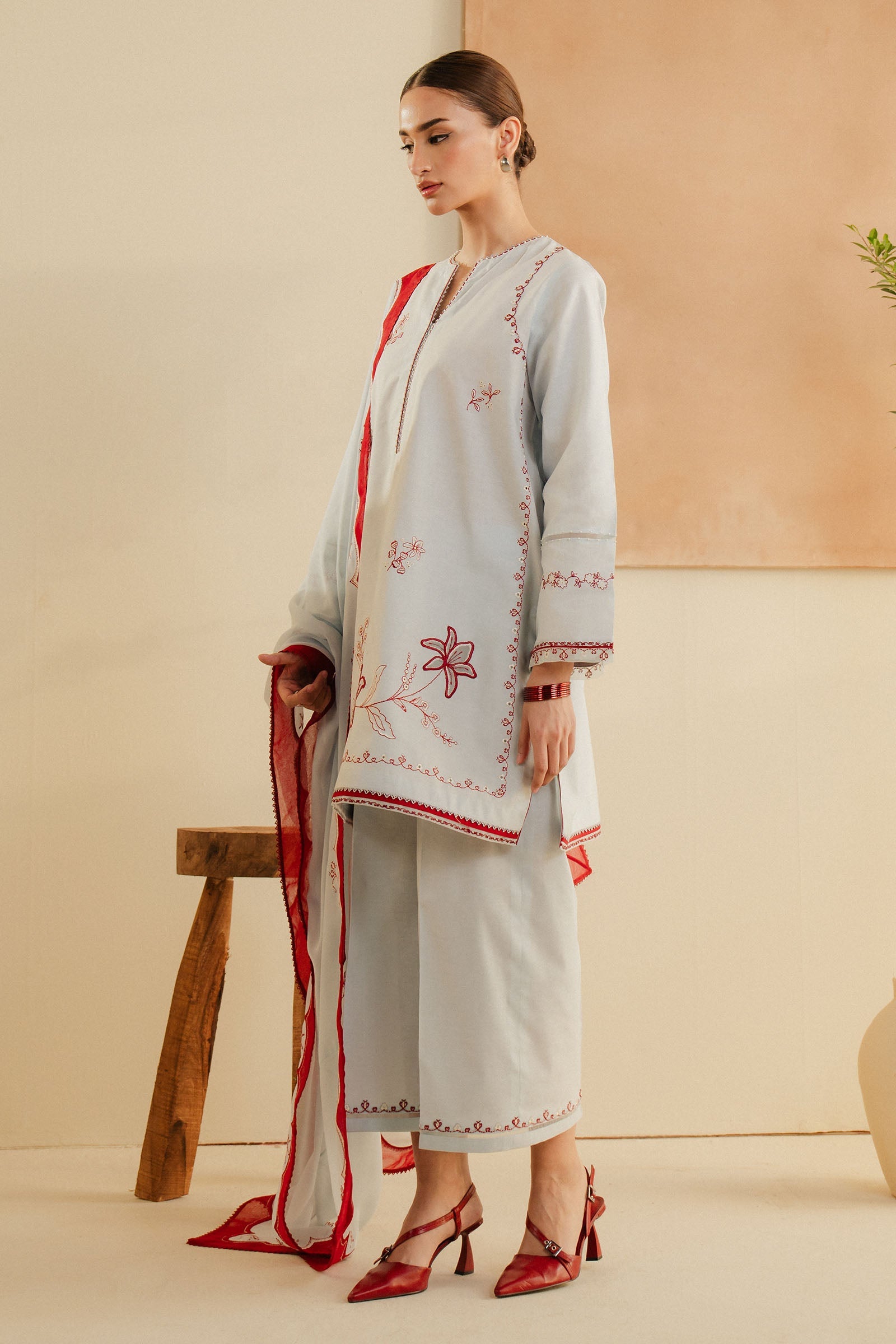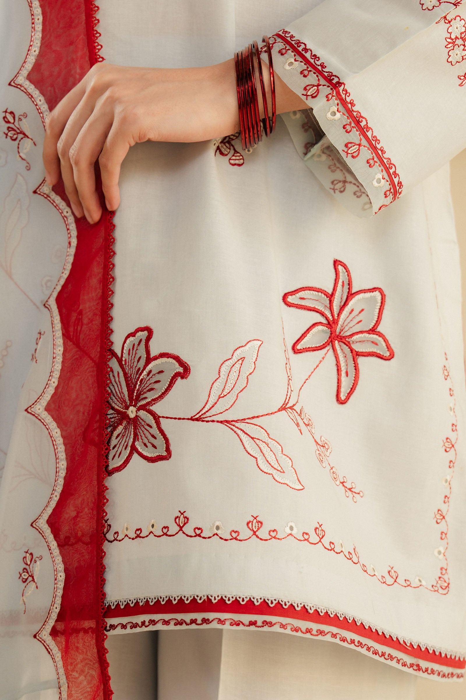 Our loose-fit, short kurta is adorned with intricate embroidery with organza patchwork and embroidery details on the sleeves. Paired with cropped wide hem pants, the red scalloped and embroidered dupatta complements this outfit and makes it a perfect choice for festive or semi-formal occasions.