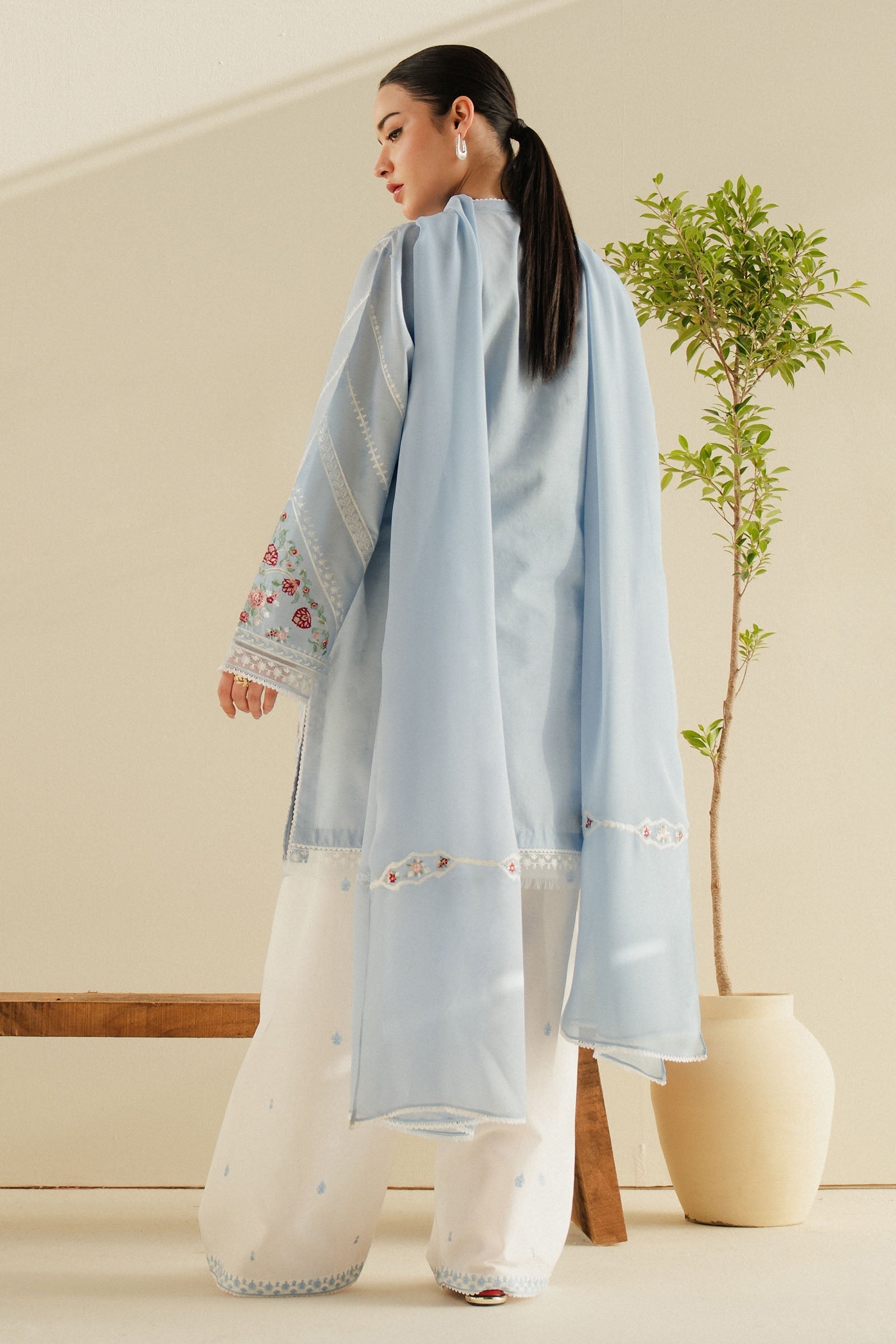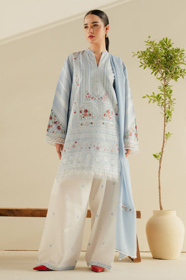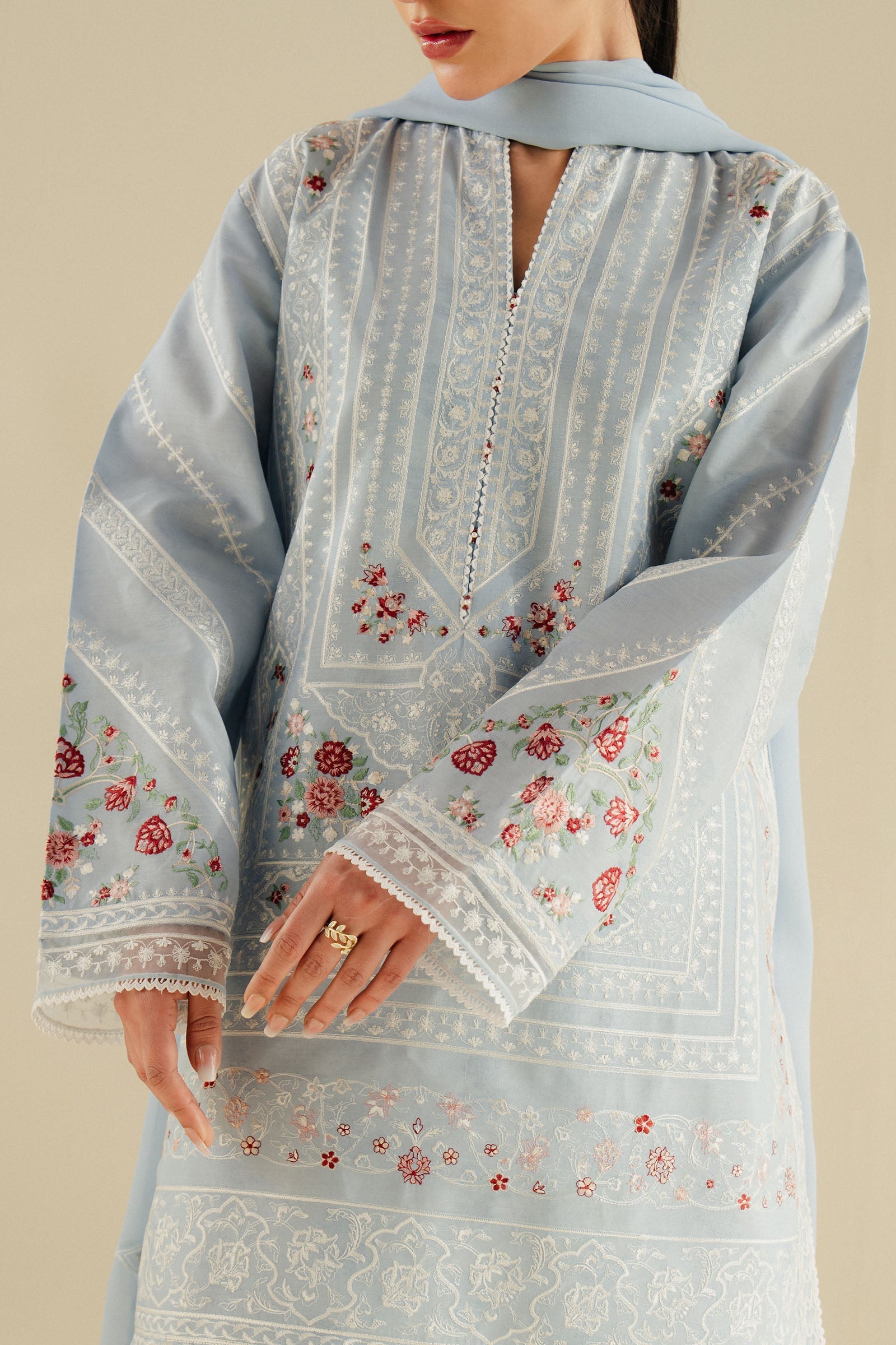 Our classic, loose-fit short kurta with composed embroidery on the front, is paired with an embroidered farshi shalwar to create a comfortable look. The embroidered dupatta further refines this ensemble.