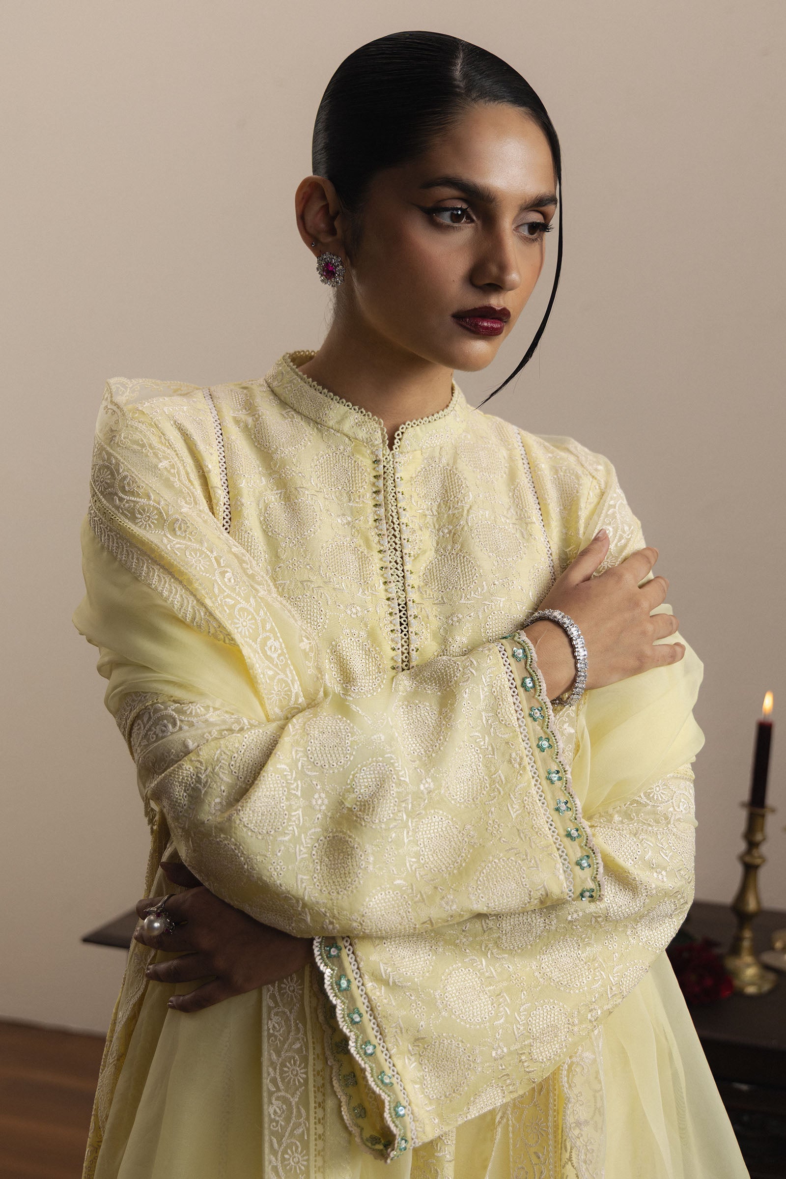 A matching organza dupatta completes the look, adding lightness and ethereal charm to the outfit. Zahra embodies Zara Shahjahan’s philosophy — where traditional craftsmanship, intricate detailing, and contemporary elegance converge to create festive wear that is timeless, sophisticated, and effortlessly graceful.