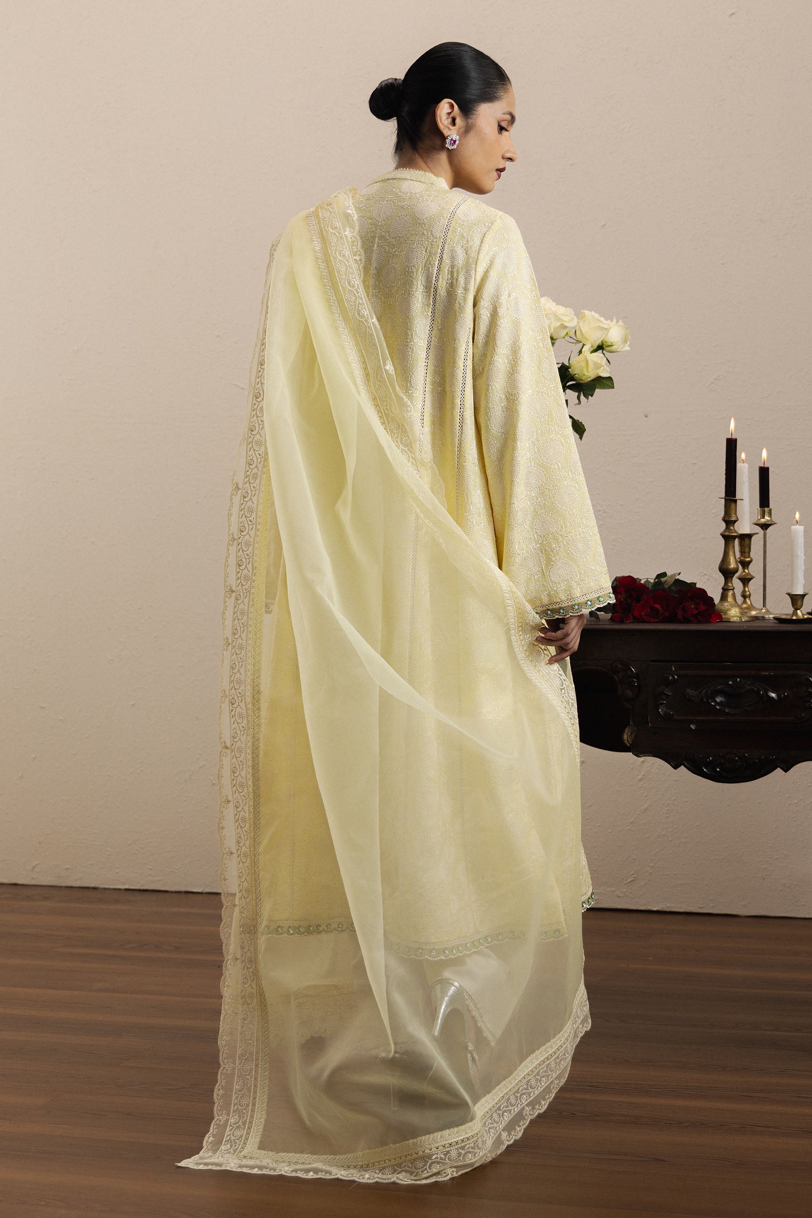 Zahra is a long, paneled raw silk kameez in vibrant yellow, featuring delicate chikankari embroidery on the front and sleeves with subtle organza accents, creating a silhouette that exudes elegance and refinement. Paired with tapered shalwar pants adorned with complementary embroidery, the ensemble flows gracefully while offering modern comfort.