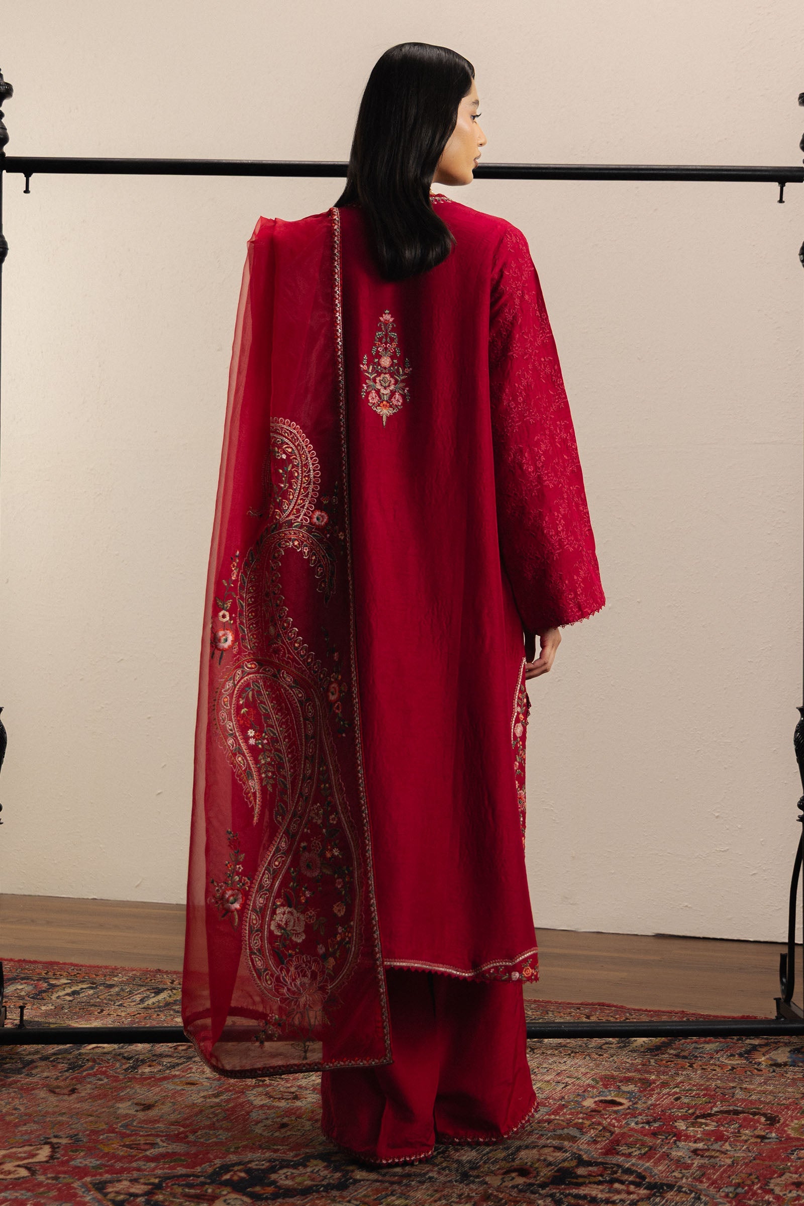 Paired with wide-hem 14-inch ankle-length trousers, subtly detailed with minimal embroidery and finished with delicate lace, the silhouette is balanced, refined, and graceful. An asymmetrically composed organza dupatta adds a modern edge, flowing effortlessly to complete the ensemble with poise and sophistication. Aarzina embodies Zara Shahjahan’s philosophy — heritage artistry, meticulous detailing, and elegant silhouettes harmoniously creating timeless celebratory wear.