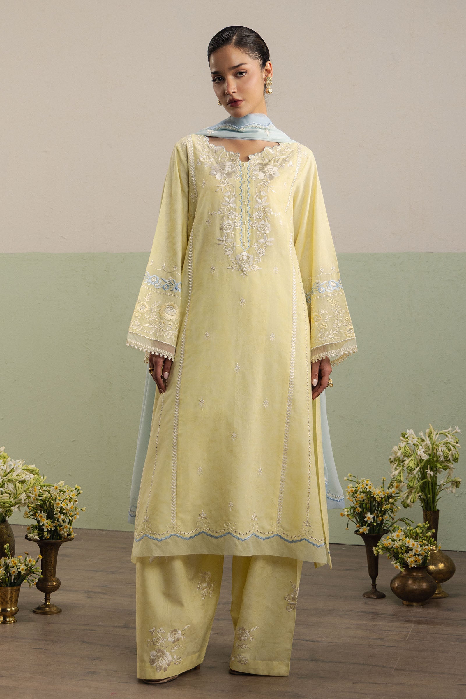 Mahnoor is a pastel yellow long paneled dobby shirt, beautifully adorned with intricate Gara embroidery, creating a delicate and elegant festive silhouette. It is paired with an embroidered farshi shalwar in matching dobby, enhancing the refined and graceful flow of the ensemble. A contrasting light blue pastel georgette chiffon dupatta, detailed with complementary embroidery, completes the look with a soft pop of color and timeless charm.