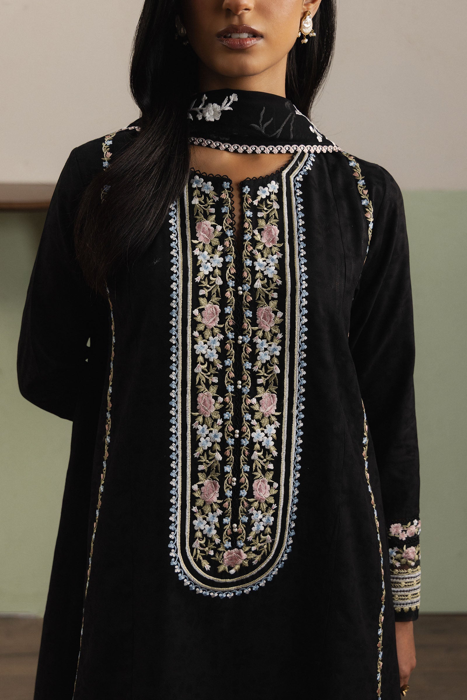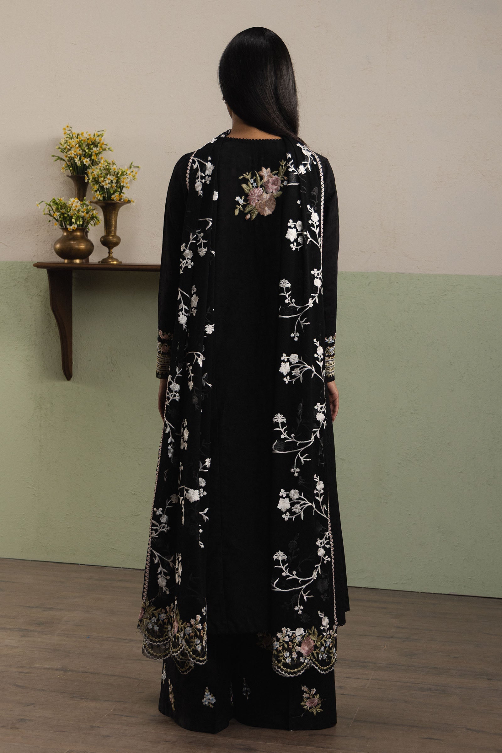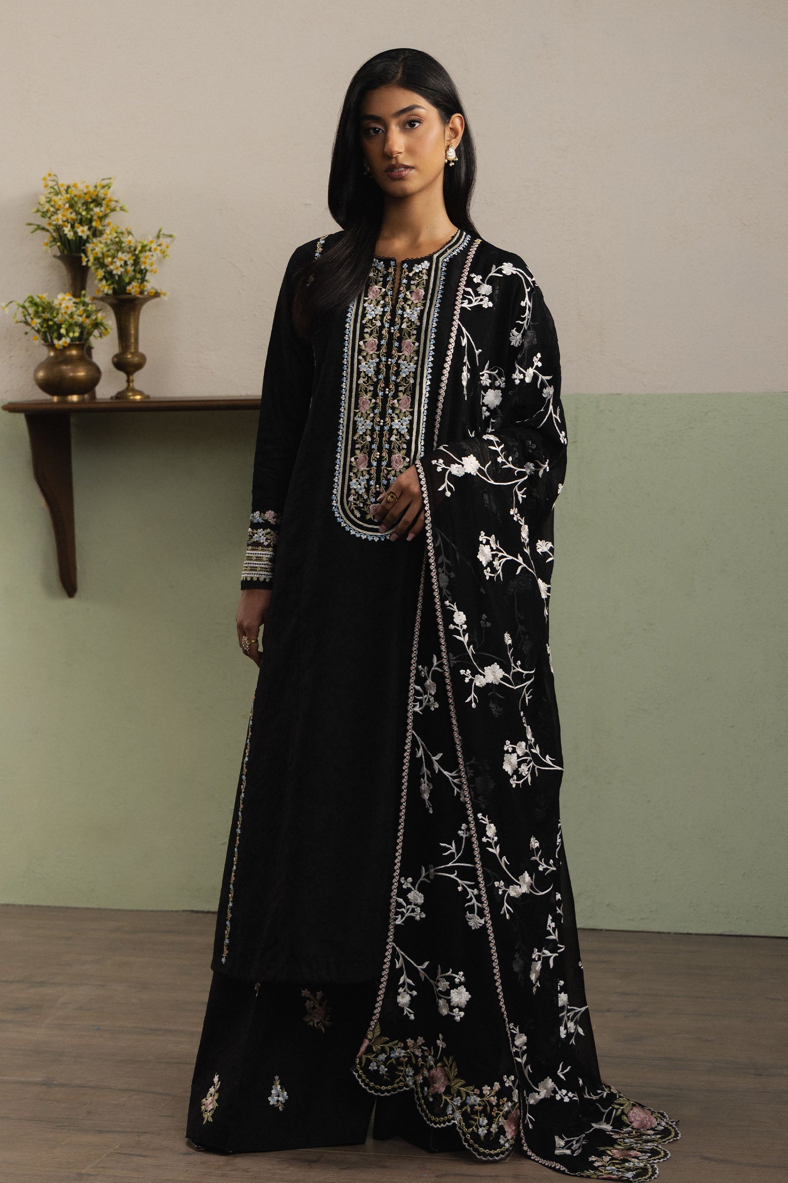 Saharza is a classic long paneled black dobby shirt, featuring minimal and refined embroidery details on the front for a subtle yet sophisticated festive charm. It is paired with tonal wide-hem dobby pants, embroidered delicately to complement the ensemble. The outfit is enhanced with elegant Ghara Jaal embroidery, while the matching georgette chiffon dupatta completes the look with graceful flow and understated refinement.