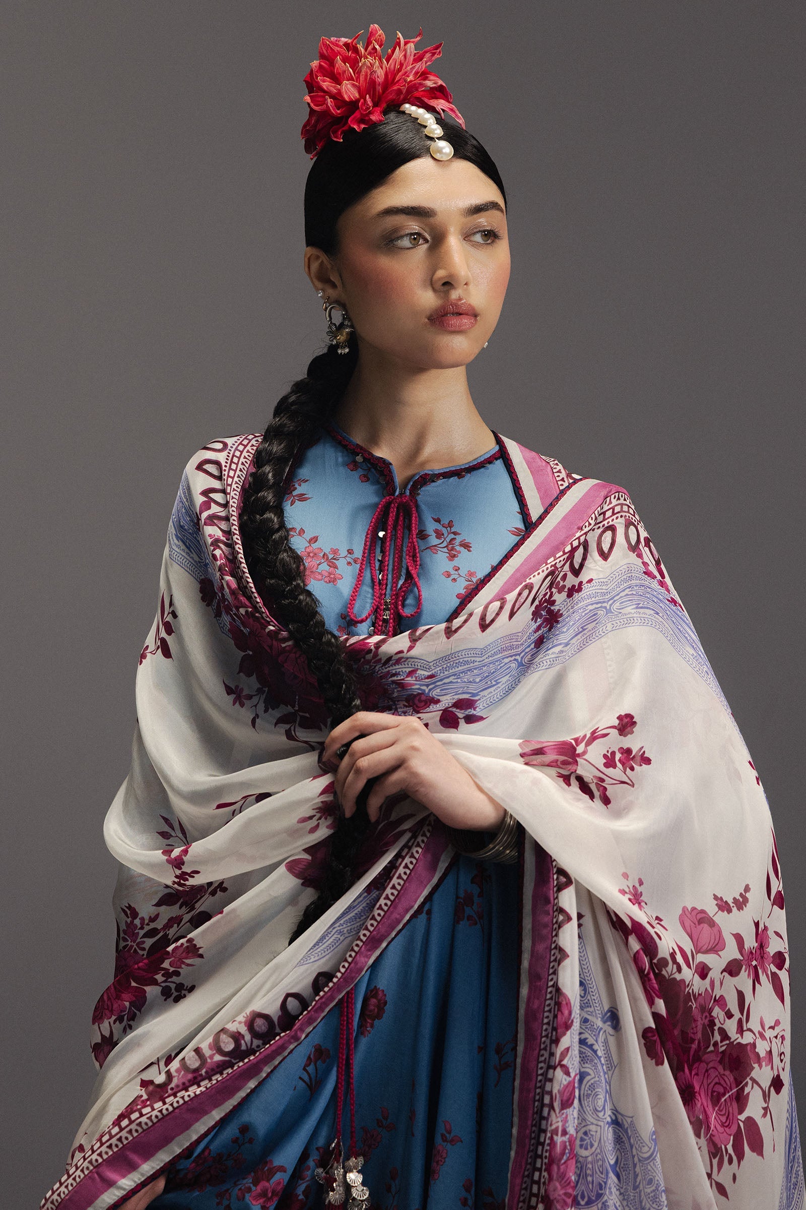 Falak Ara is a graceful Anarkali composition crafted in breathable, high-thread-count Pima lawn in a soft, ethereal light blue that evokes the serenity of an open sky. The bodice, panels, and sleeves are adorned with delicately scattered floral clusters, subtly anchored by a vibrant red botanical border at the hem that lends striking contrast and definition to the flowing fourteen-panel silhouette. Paired with digitally printed maroon cambric trousers featuring a continuous running floral pattern, the ensemble achieves a rich and grounded depth. The look is completed with a pristine cream silk dupatta detailed with an intricate floral jaal spray, adding vintage refinement and timeless elegance to this contemporary yet regal design.