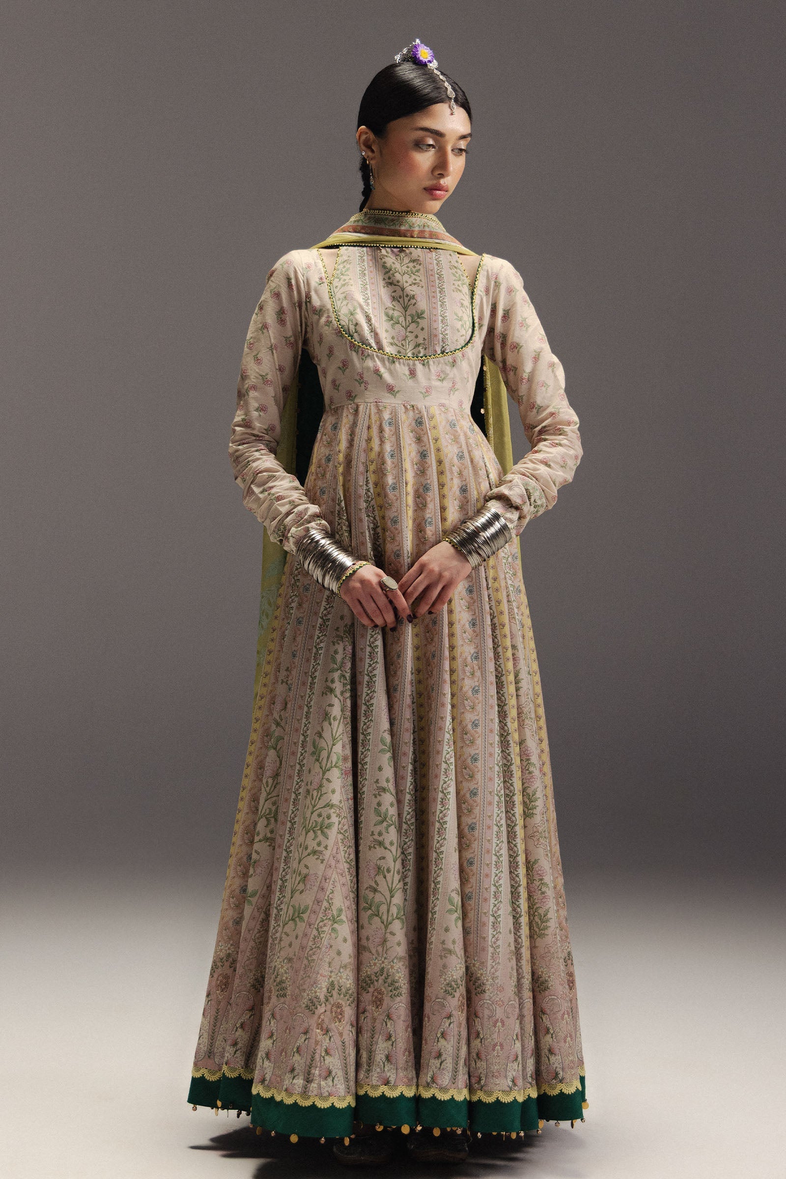 Hoorain is a classic and artisanal Anarkali crafted on an ivory base, featuring vertical panels adorned with delicate floral vines and clusters in warm shades of red and sage green. The silhouette is elegantly grounded by a multi-tiered hemline embellished with traditional paisley (buta) motifs and intricate linear scrolls, adding timeless sophistication. A bold crimson silk dupatta completes the ensemble, enriched with a large-scale ornate scrollwork frame, corner paisley accents, and contrasting green piping that unites the palette. Hoorain embodies ethereal elegance, artisanal craftsmanship, and graceful refinement, making it a statement piece for heritage-inspired contemporary wardrobes.
