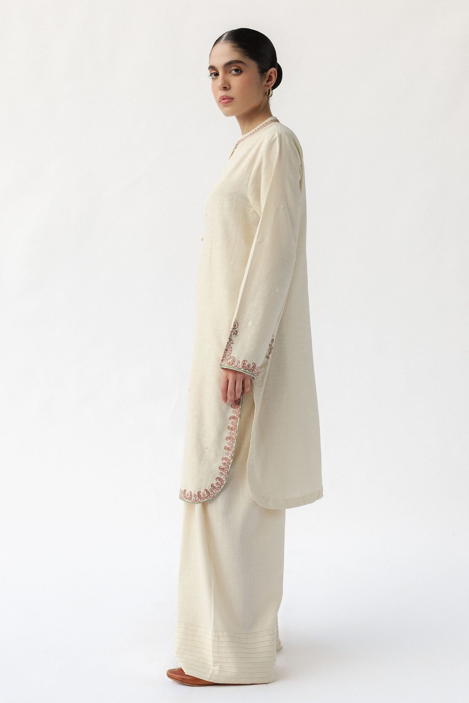 Paired with a farshi shalwar in matching linen, detailed with fine stitching for a graceful and traditional finish.